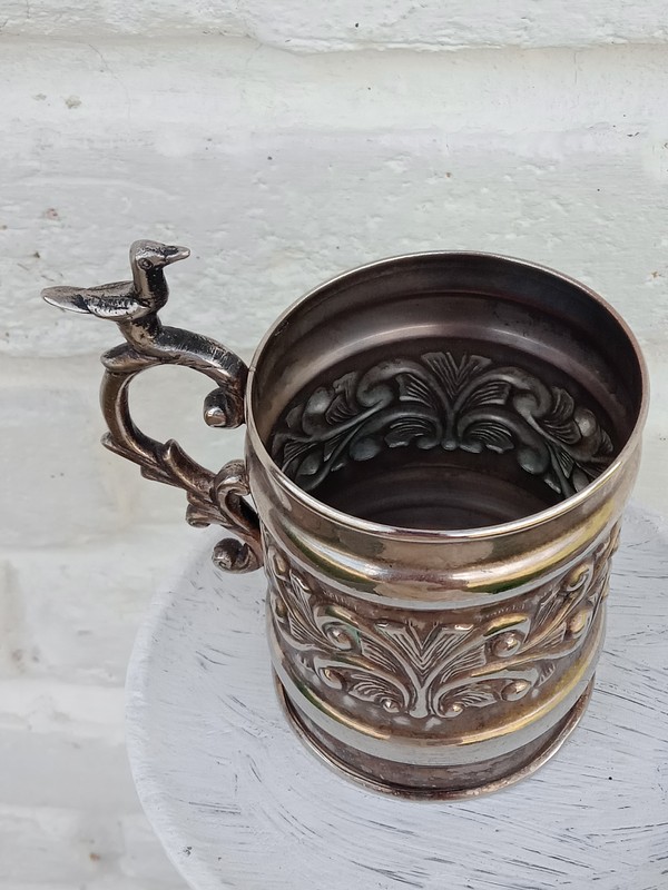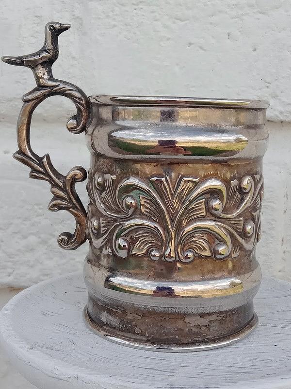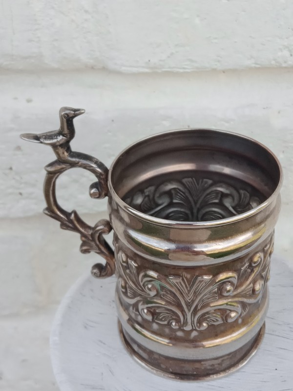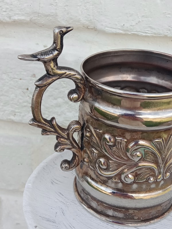 Cuando vi esta antigua taza, estaba seguro que era de plata. Este pequeño jarro artesanal resulta estar bañado en plata, conservando todo su encanto. Luce un diseño en alto relieve con una flor de lis y un pájaro en el asa.