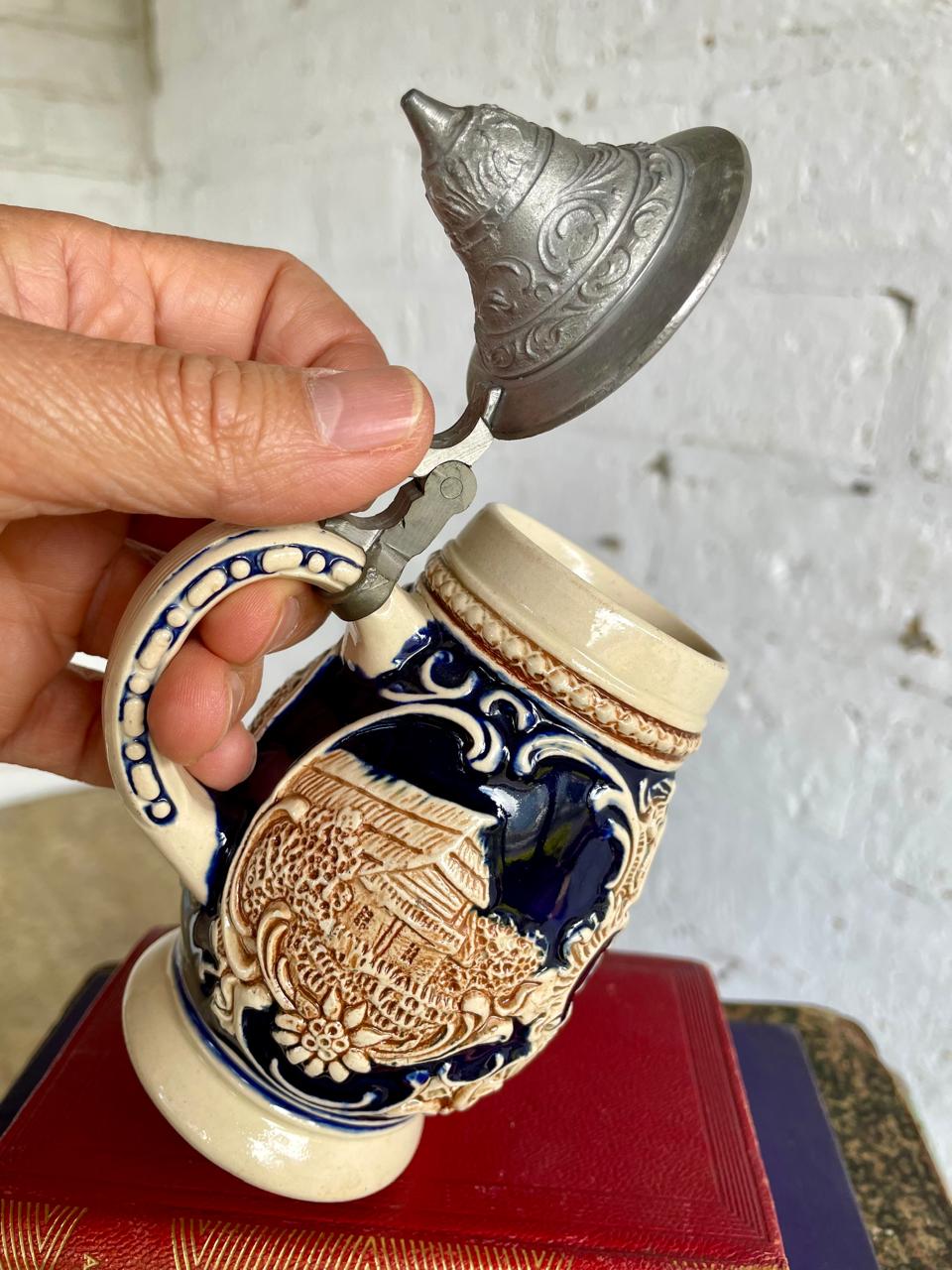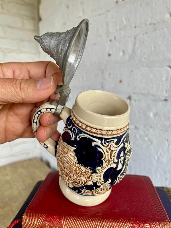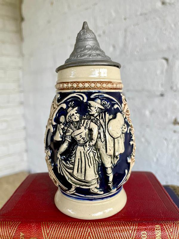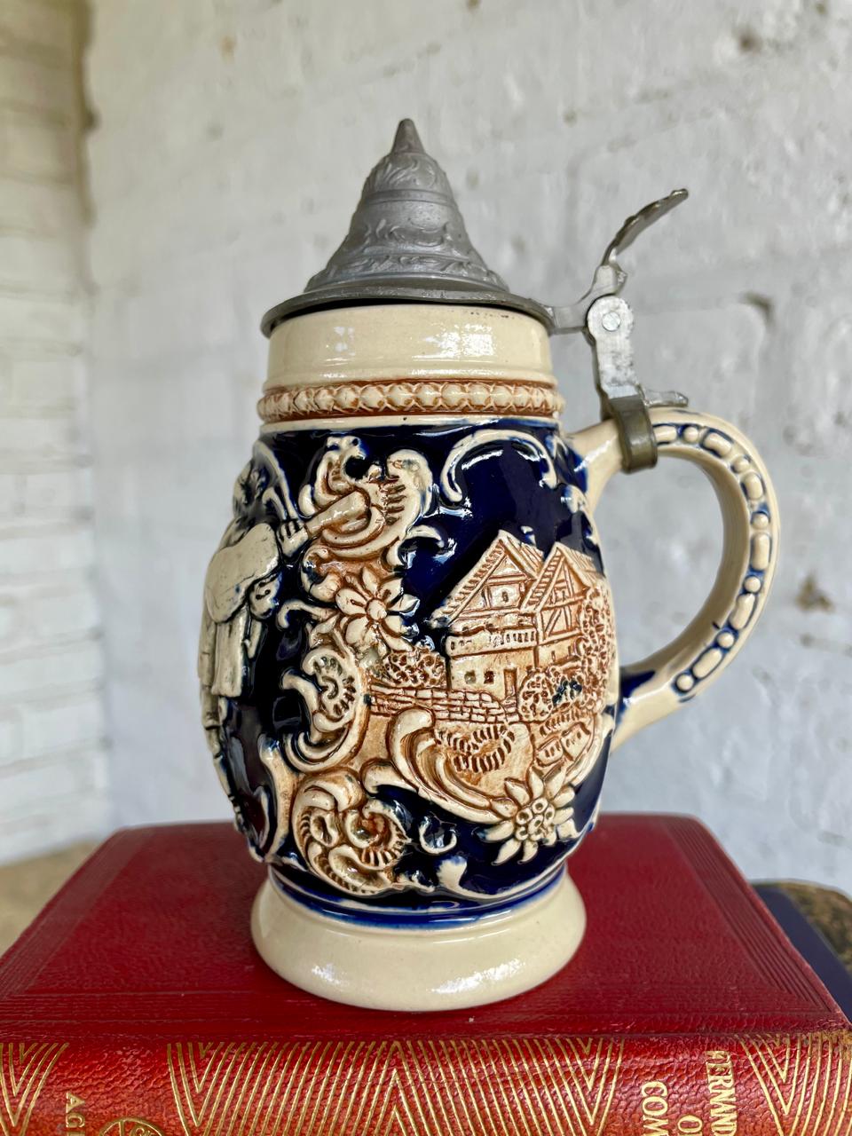 Pequeño jarro cervecero típico alemán de los años setenta, elaborado en cerámica con motivos en alto relieve decorados con pintura vidriada, la tapa es metálica. La base está marcada Made in West Germany. Capacidad 250 ml. Se encuentra en buen estado.