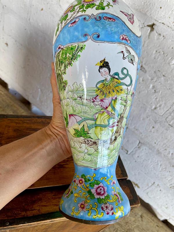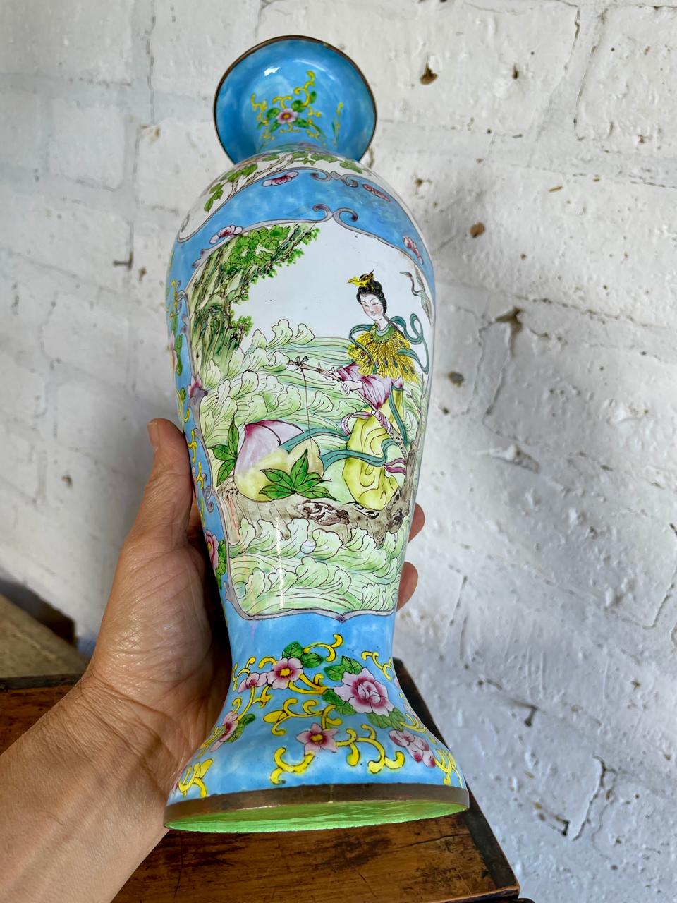 Jarrón de altísima calidad ginbari cloisonné decorado con flores, pájaros y una mujer rodeada de naturaleza. Producido en Japón a inicios del S. XX.