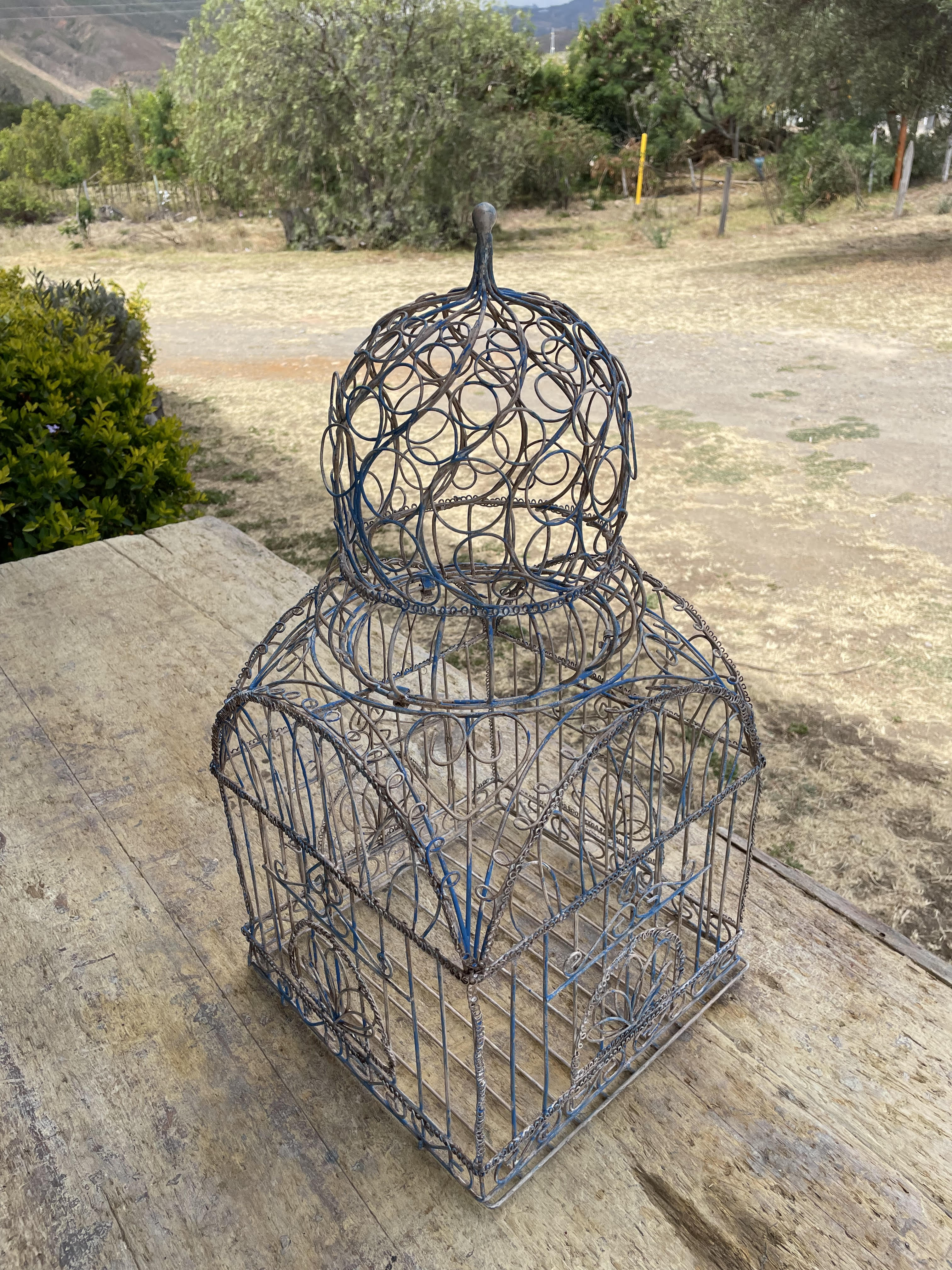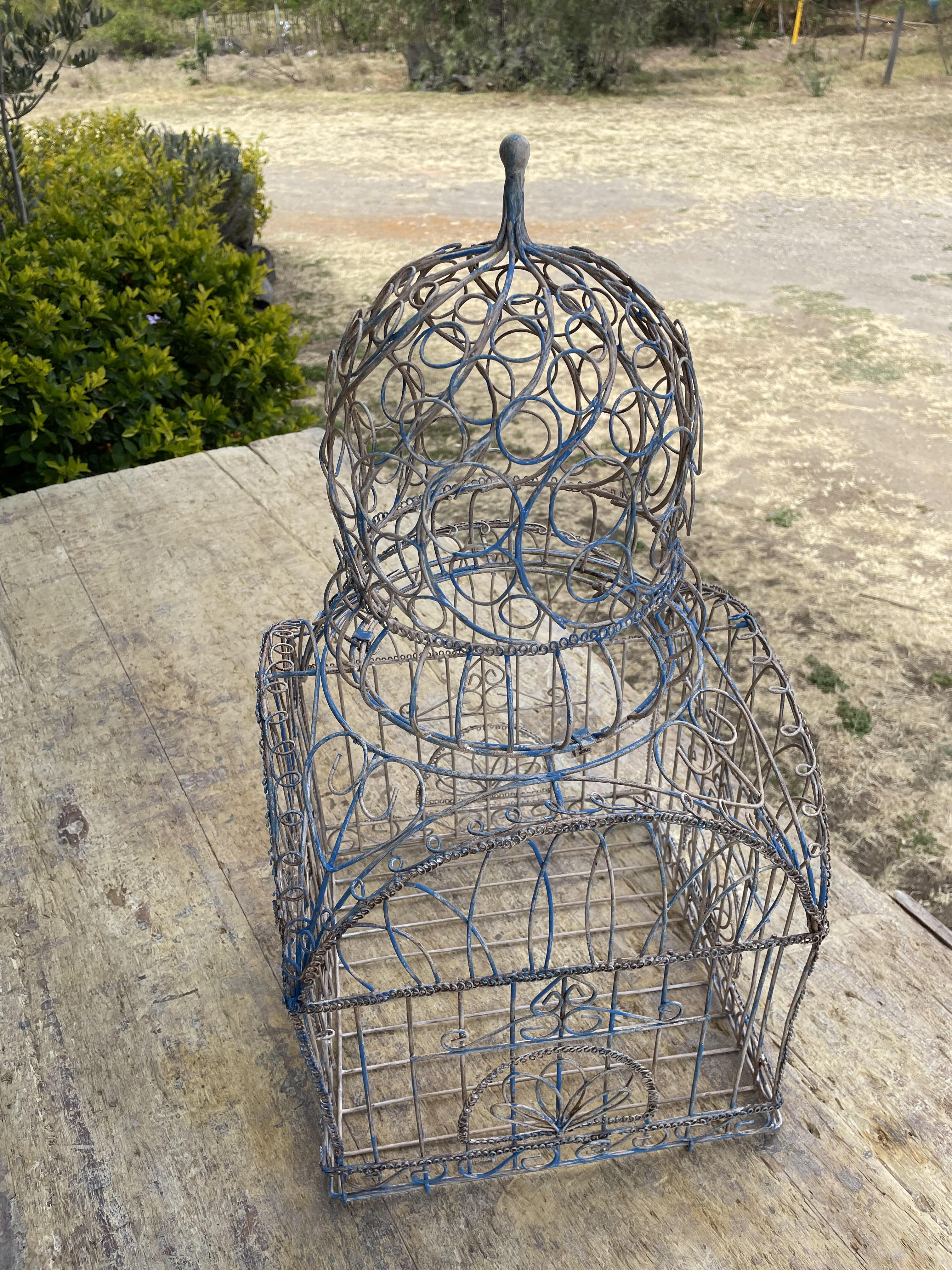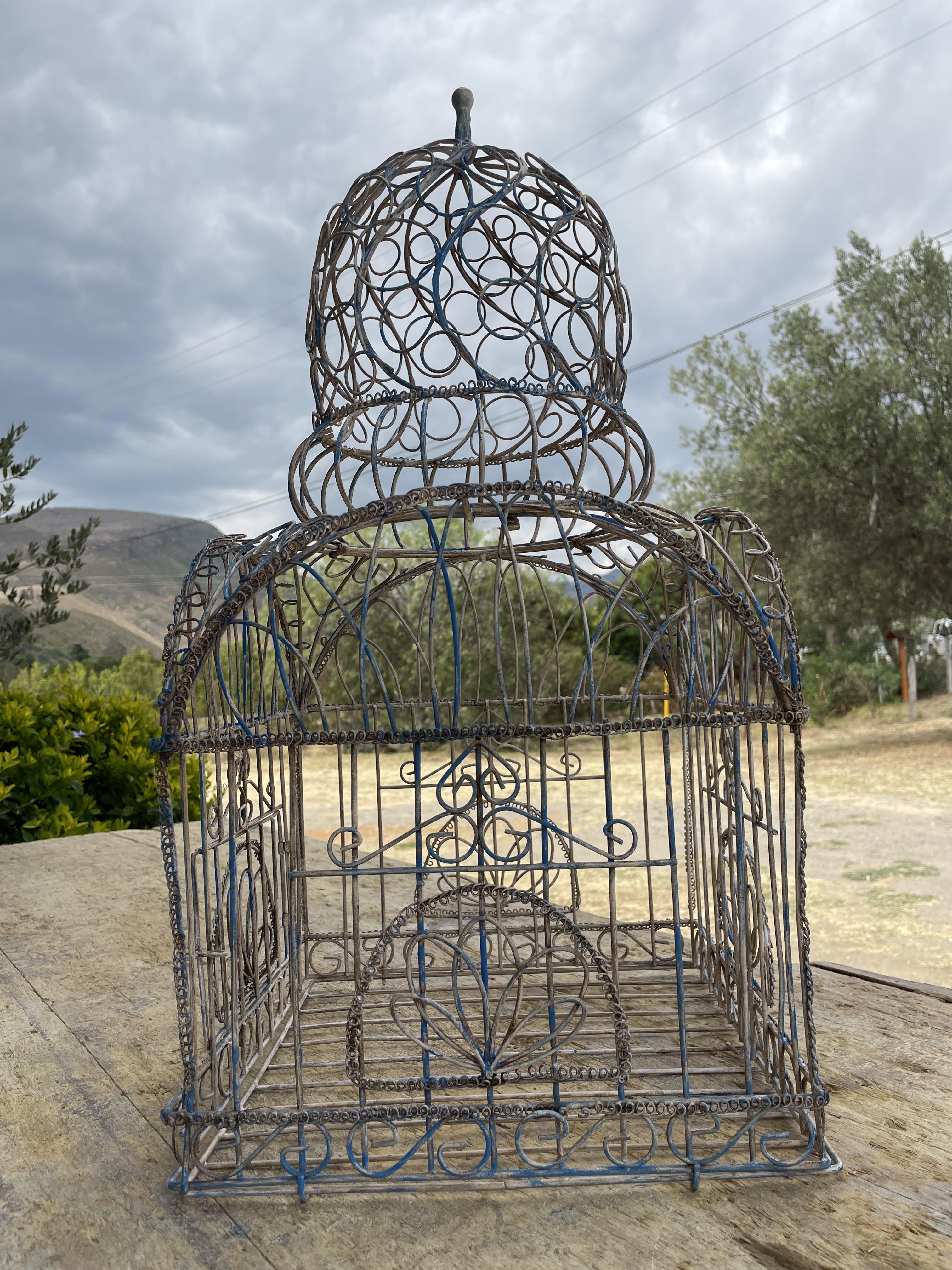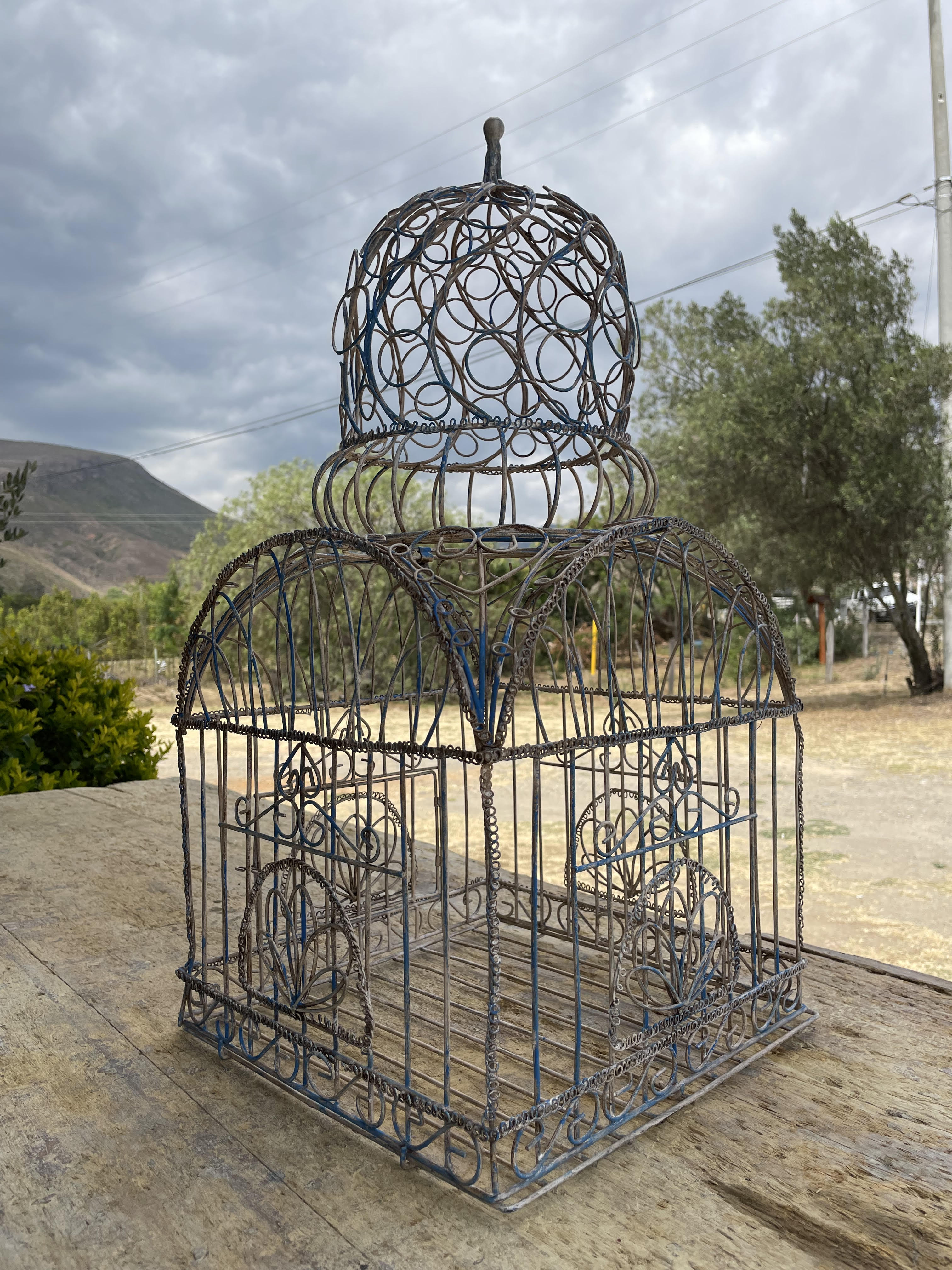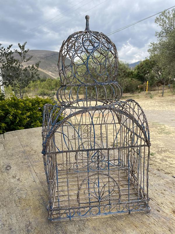 Jaula artesanal vintage en alambre grueso, tiene una puerta con pasador, el piso se puede extraer y la cúpula es desmonntable.