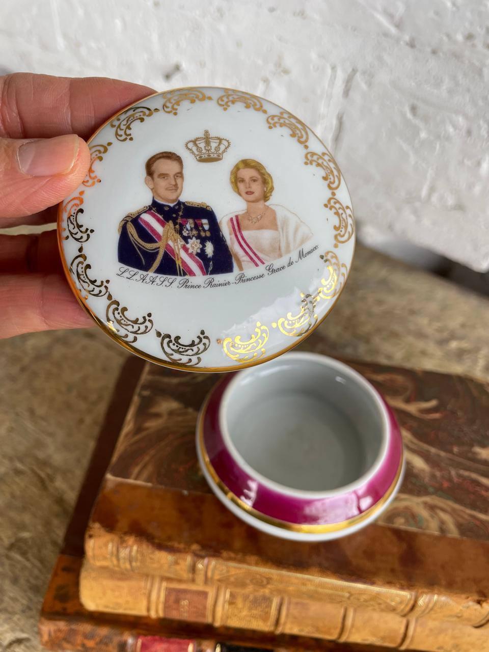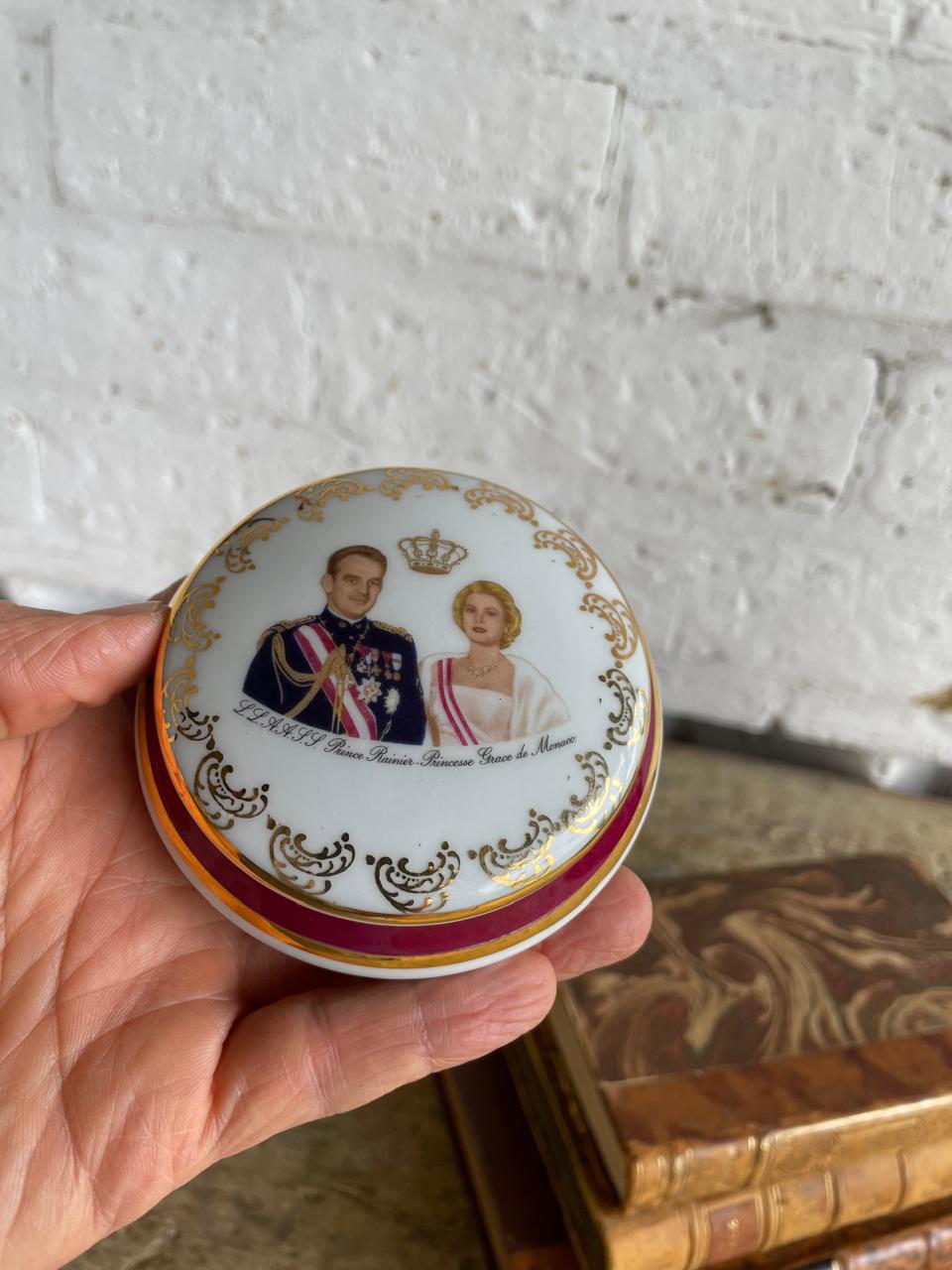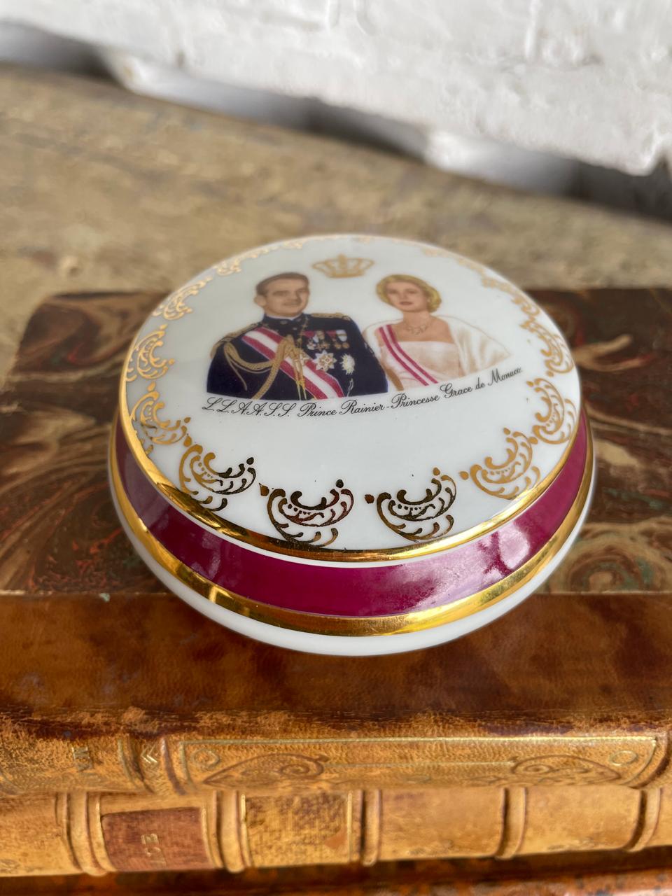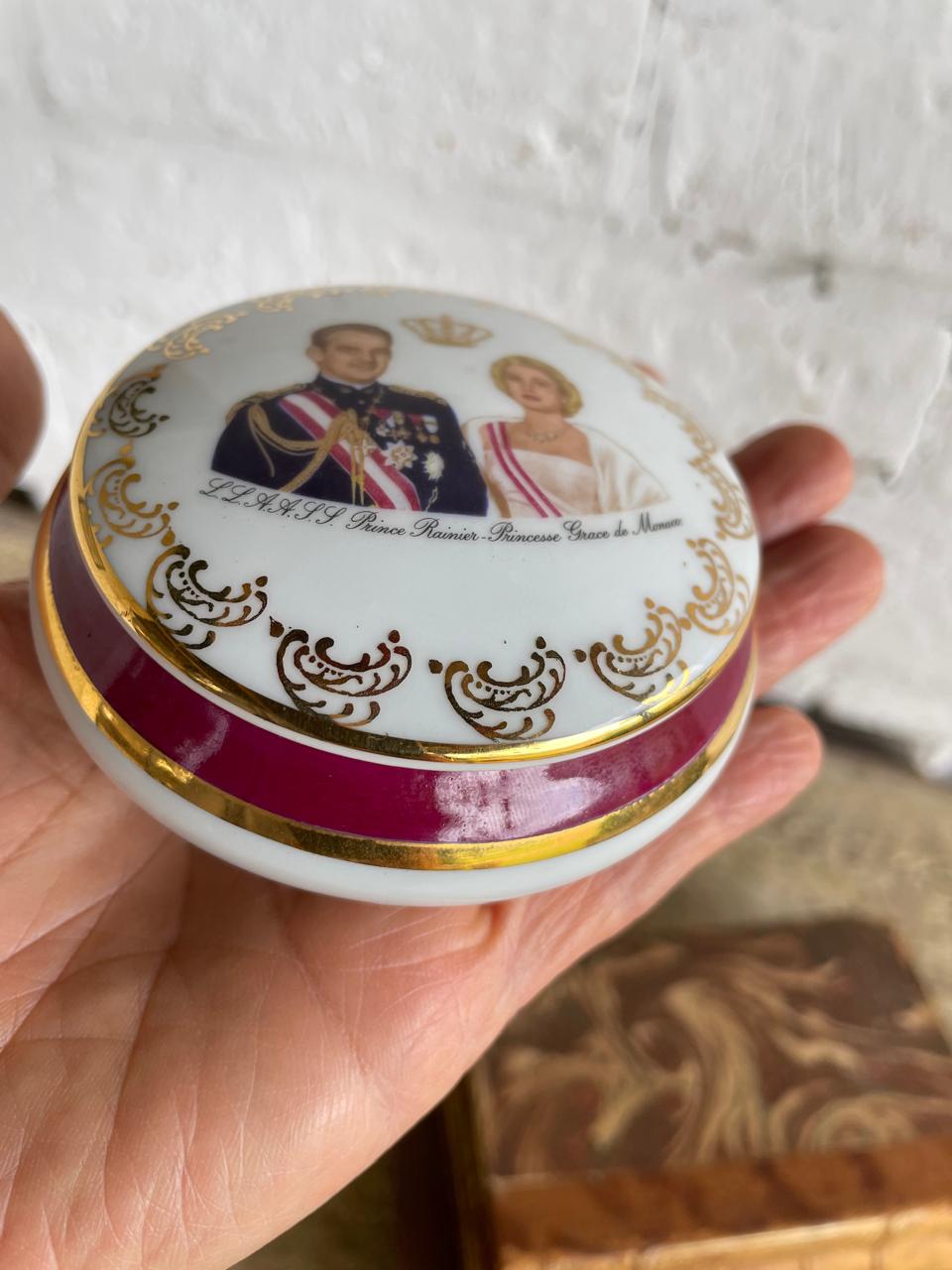 Joyero de porcelana francés de 1960, en la tapa aparecen las imágenes del Príncipe Rainiero y la princesa Grace Kelly. En la base tiene el sello limoges. La porcelana, las imágenes y el dorado del marco se encuentran en buen estado.