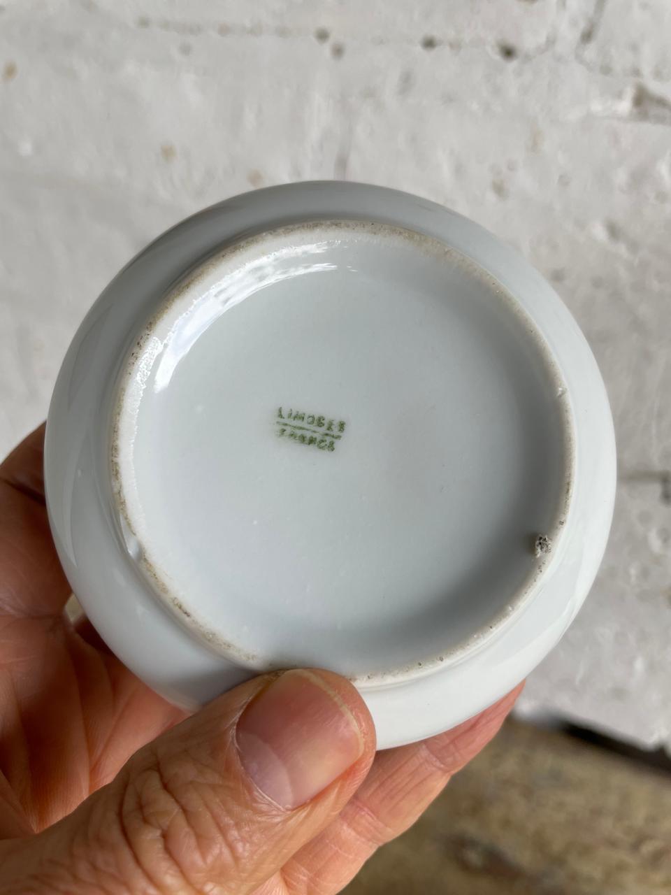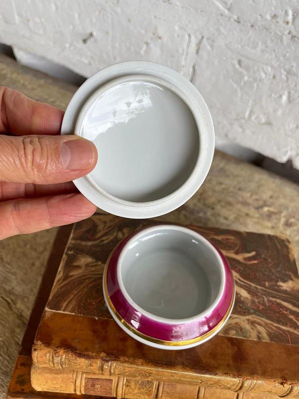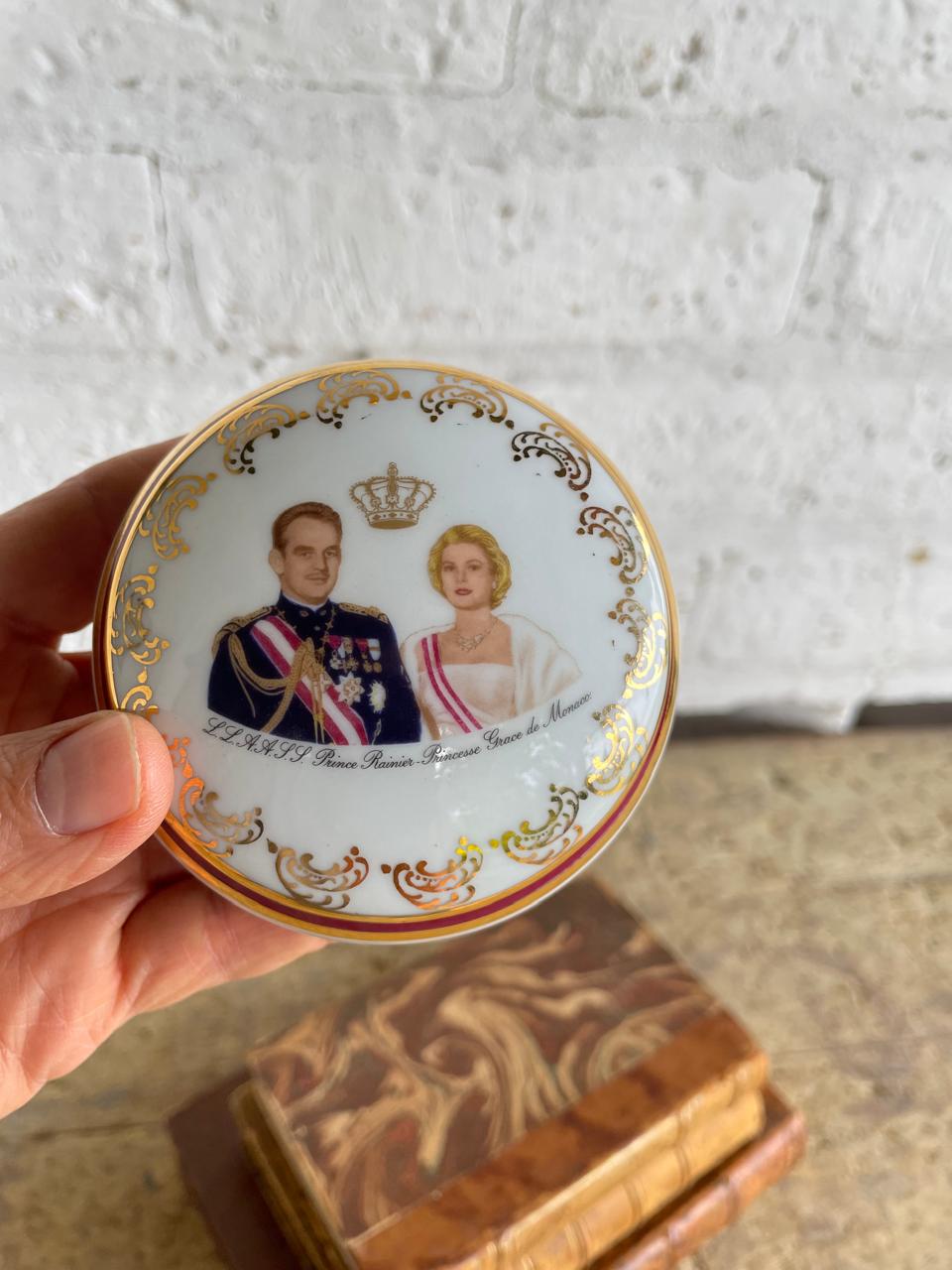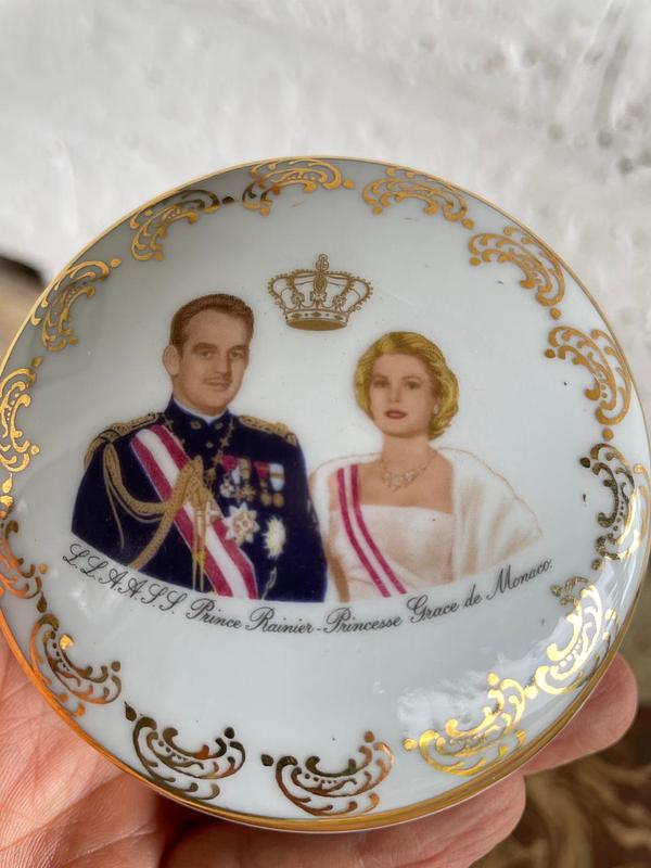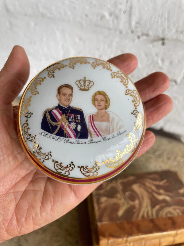 Joyero de porcelana francés de 1960, en la tapa aparecen las imágenes del Príncipe Rainiero y la princesa Grace Kelly. En la base tiene el sello limoges. La porcelana, las imágenes y el dorado del marco se encuentran en buen estado.