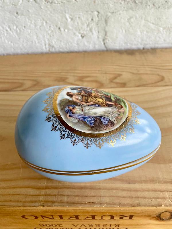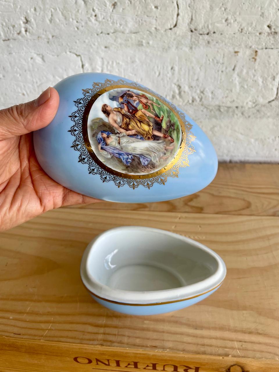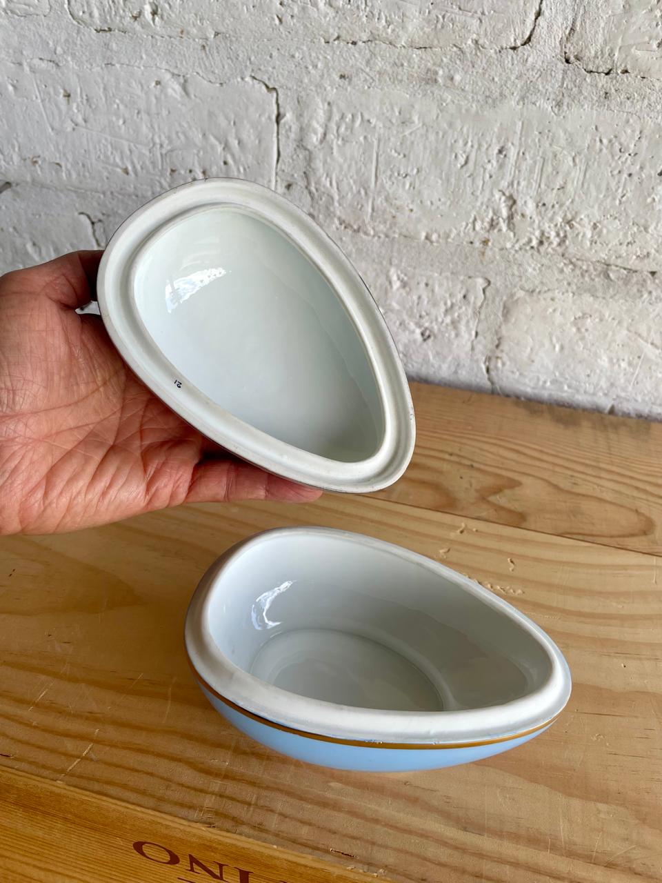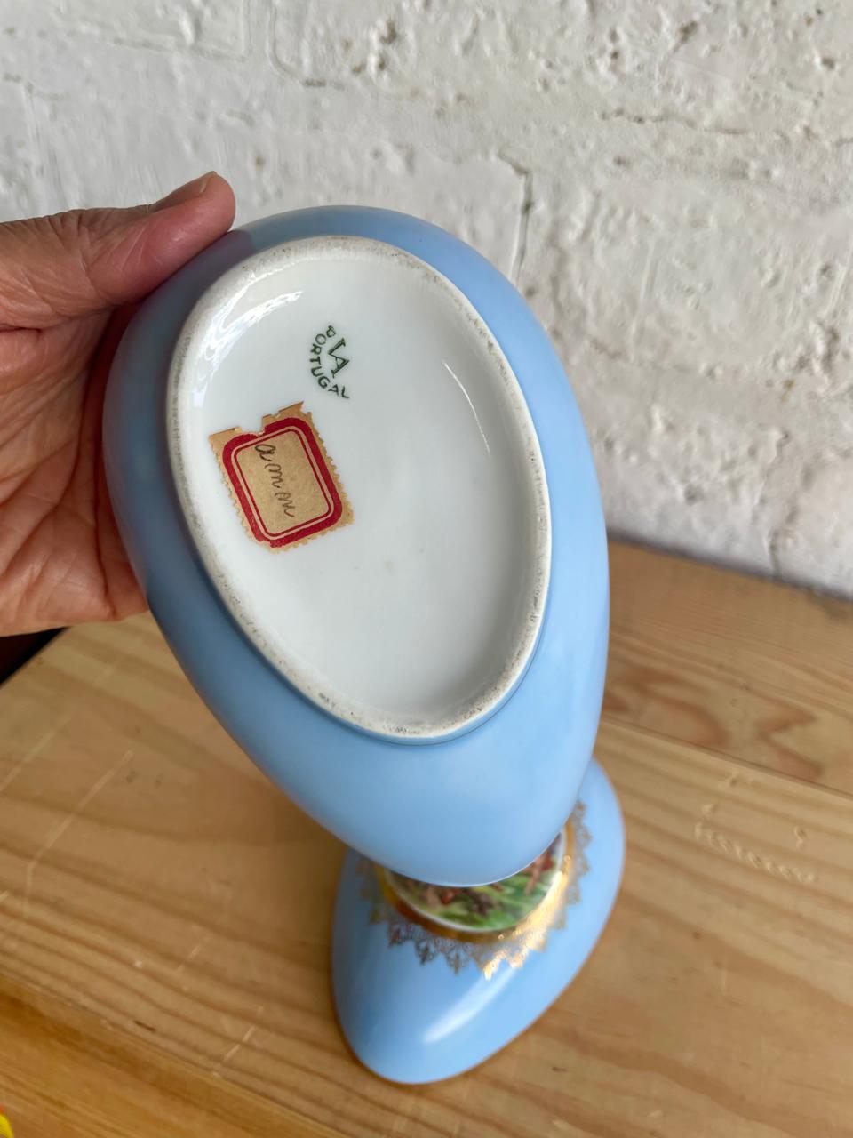 Joyero de los años sesenta de la fábrica de porcelana VA Vista Alegre fundada en 1824 en la ciudad de Ílhavo, Portugal. Elaborado en porcelana esmaltada color azul claro con forma ovalada está decorada con 3 figuras humanas dentro de un círculo rodeado de encaje dorado. En la base tiene registrada la marca del fabricante VA Portugal.
