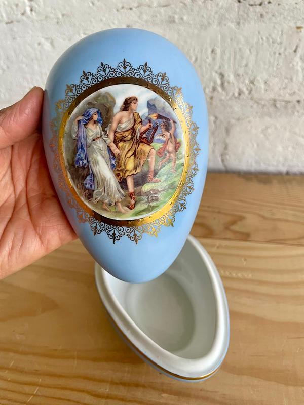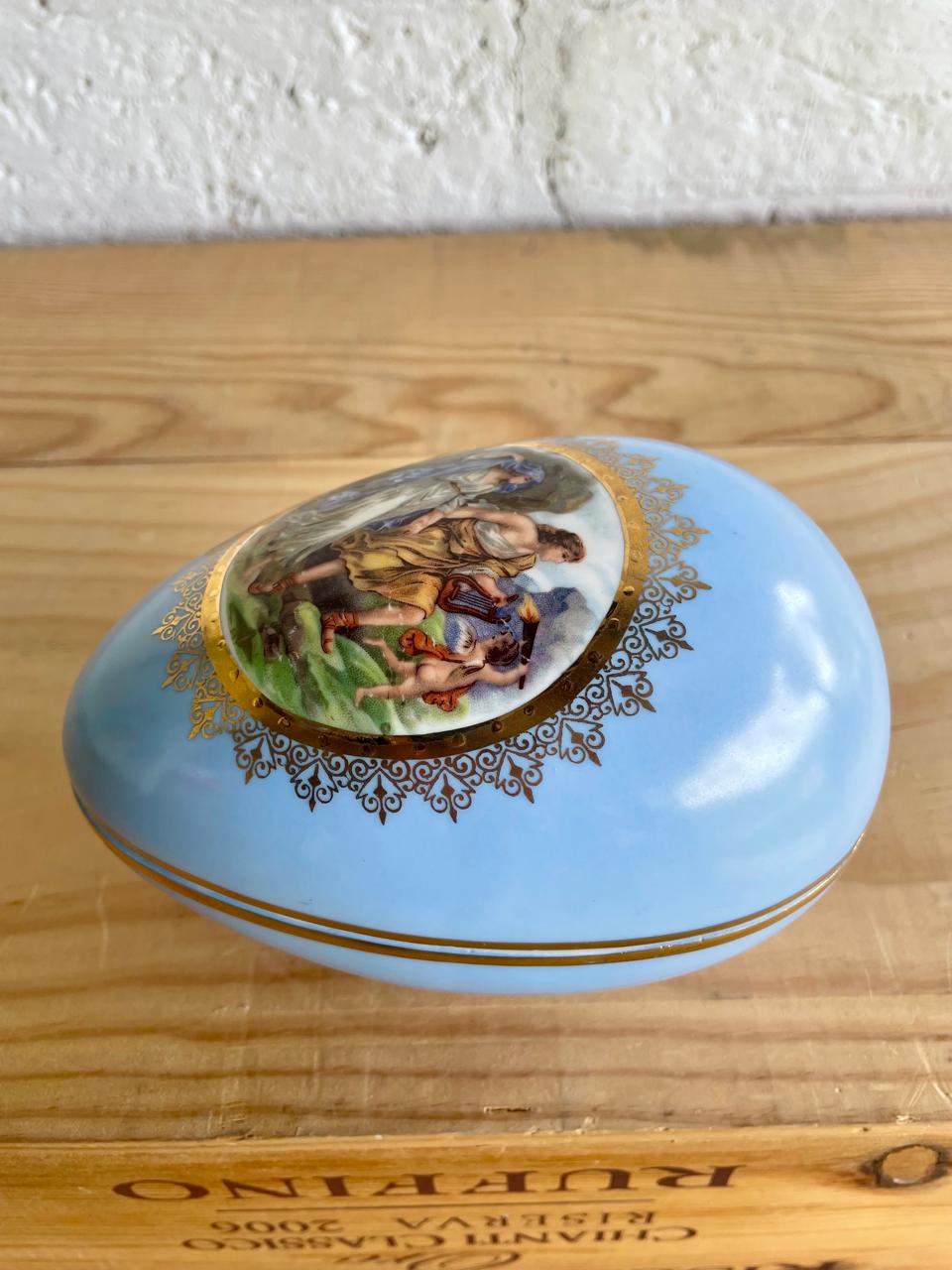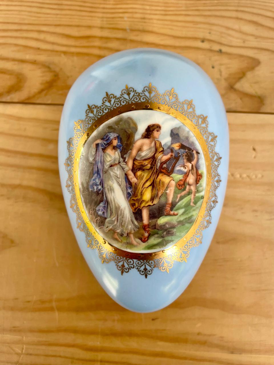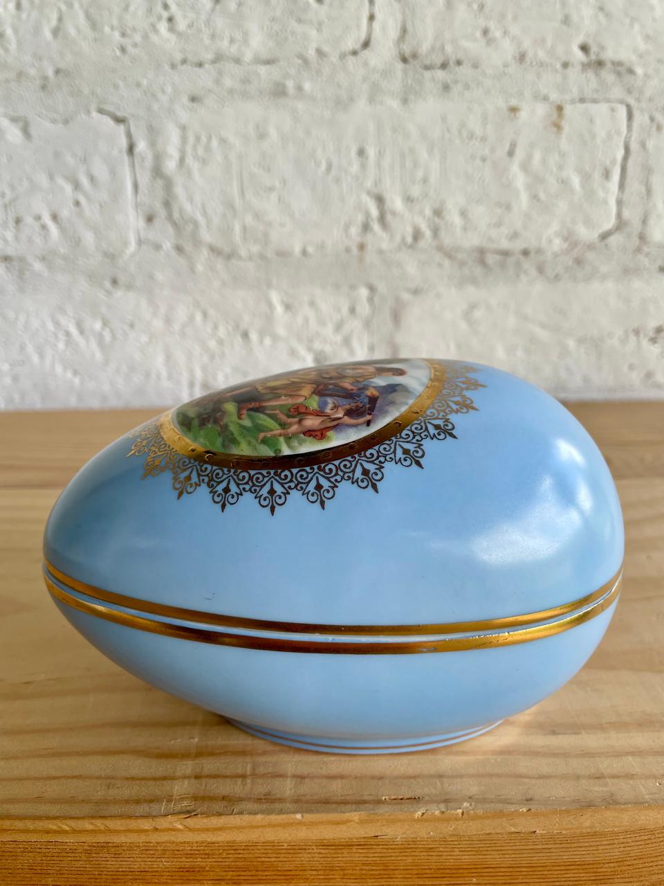 Joyero de los años sesenta de la fábrica de porcelana VA Vista Alegre fundada en 1824 en la ciudad de Ílhavo, Portugal. Elaborado en porcelana esmaltada color azul claro con forma ovalada está decorada con 3 figuras humanas dentro de un círculo rodeado de encaje dorado. En la base tiene registrada la marca del fabricante VA Portugal.