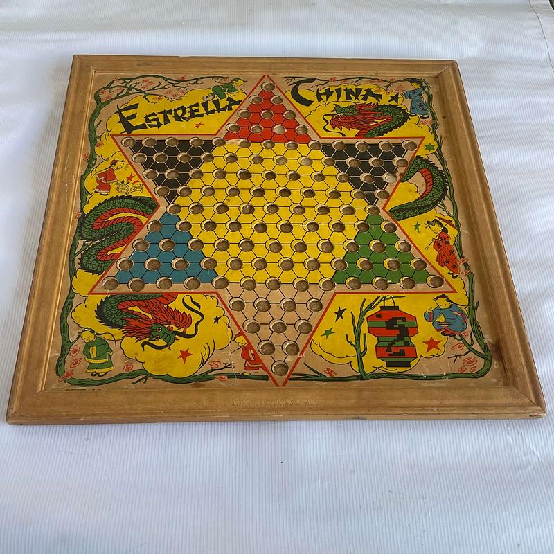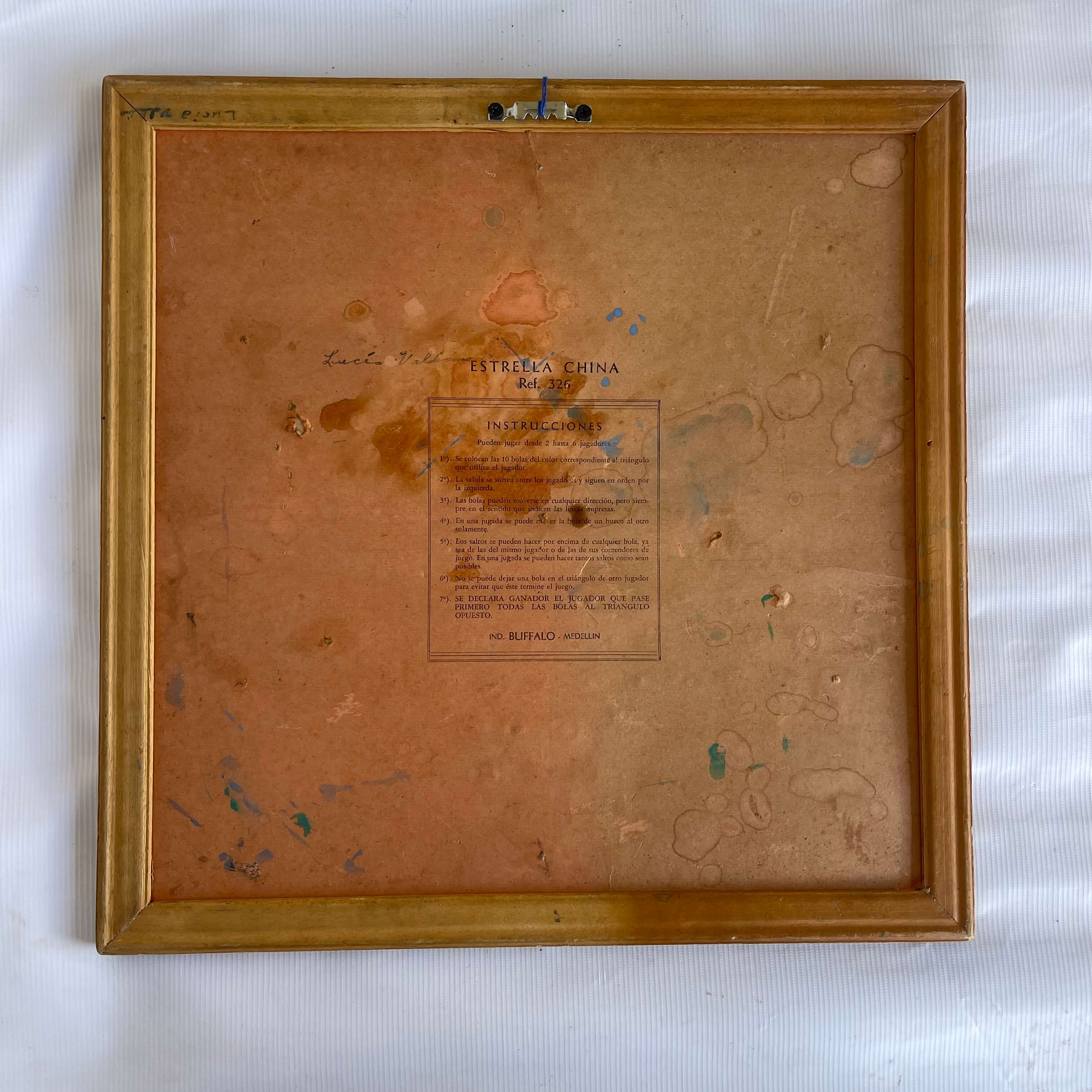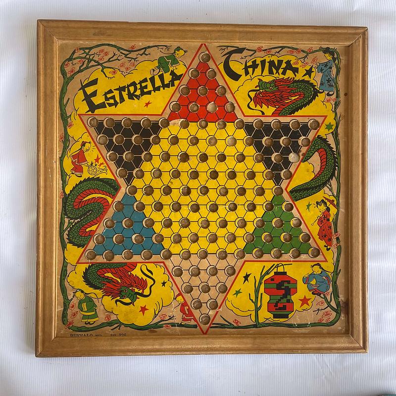 Tablero de un juego de estrella china producido en Medellín por industrias Búfalo en los años setenta en cartón grueso y marco de madera. Tienes desgastes, rayaduras y manchas.