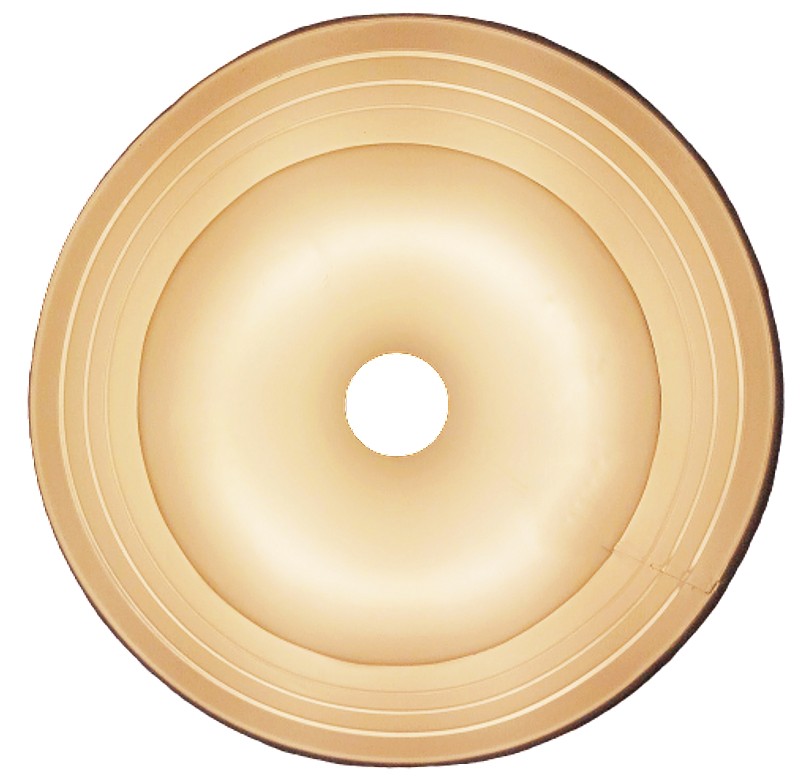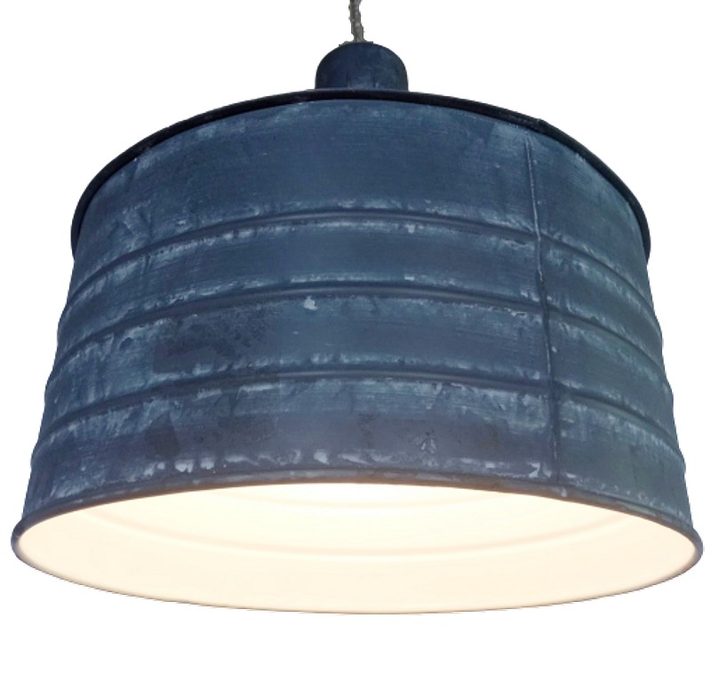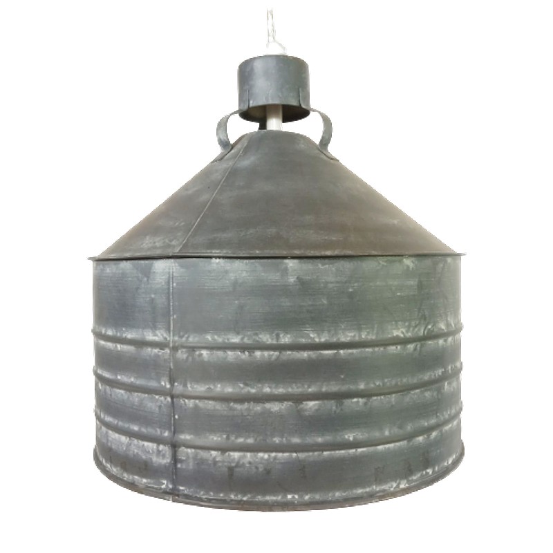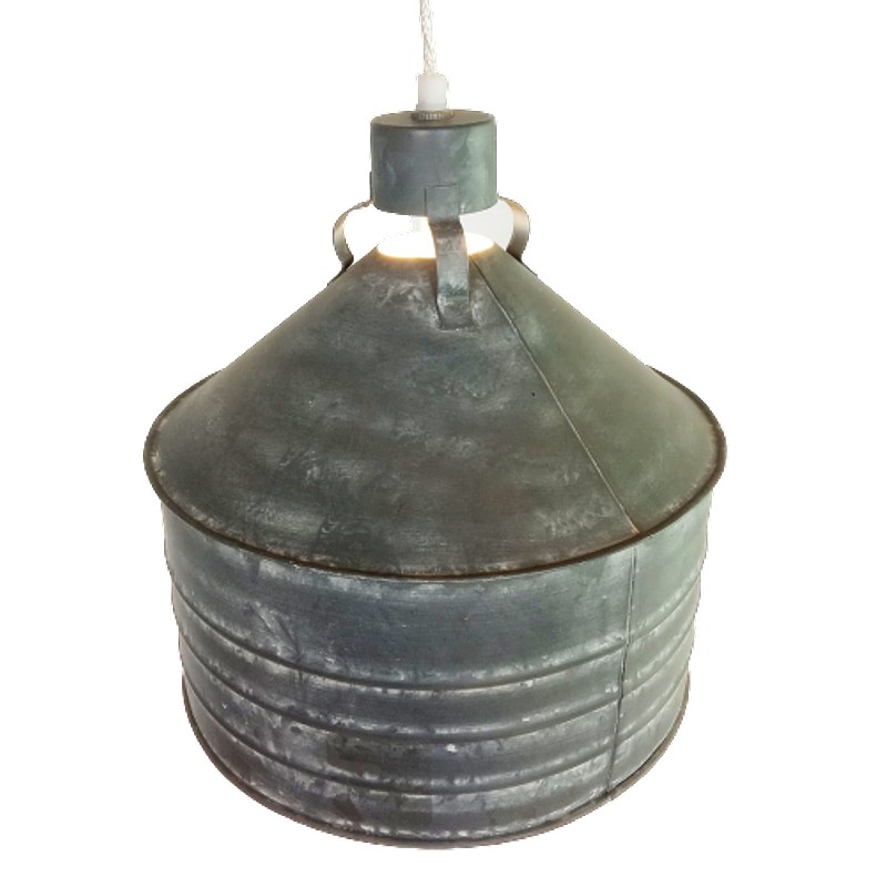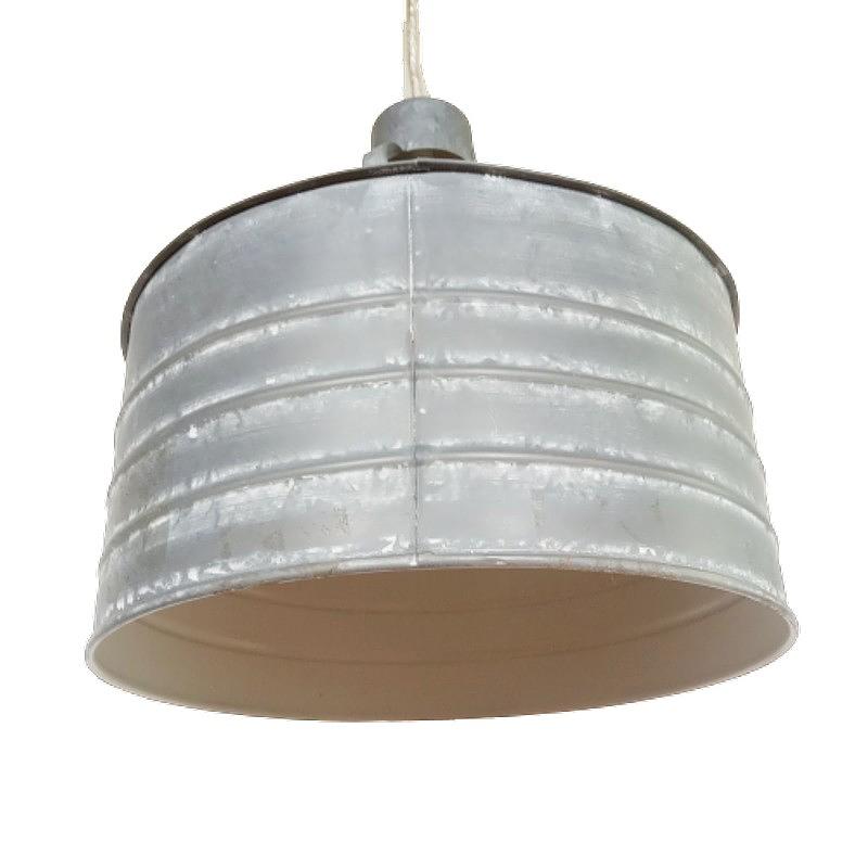 En latón grueso, tiene la forma de un antiguo comedero de galpón, el exterior tiene color aluminio con patina blanca, la parte interna está pintada en blanco.