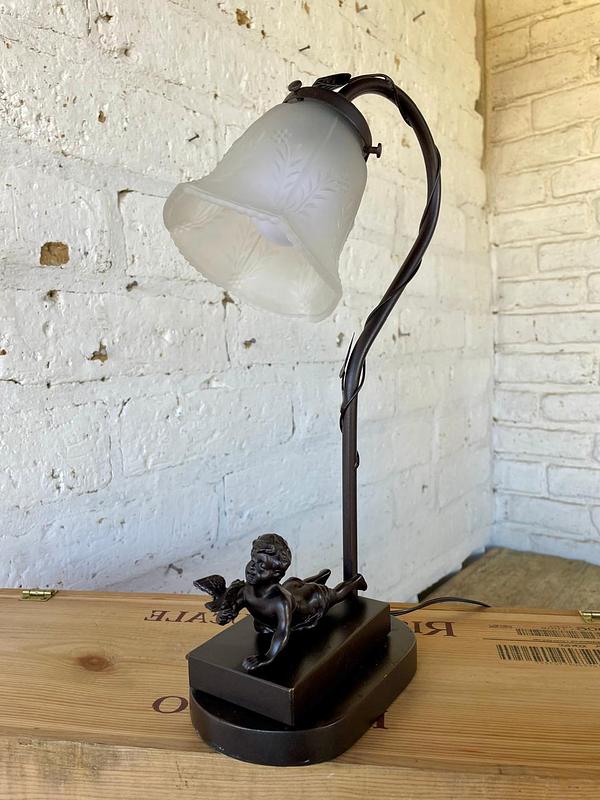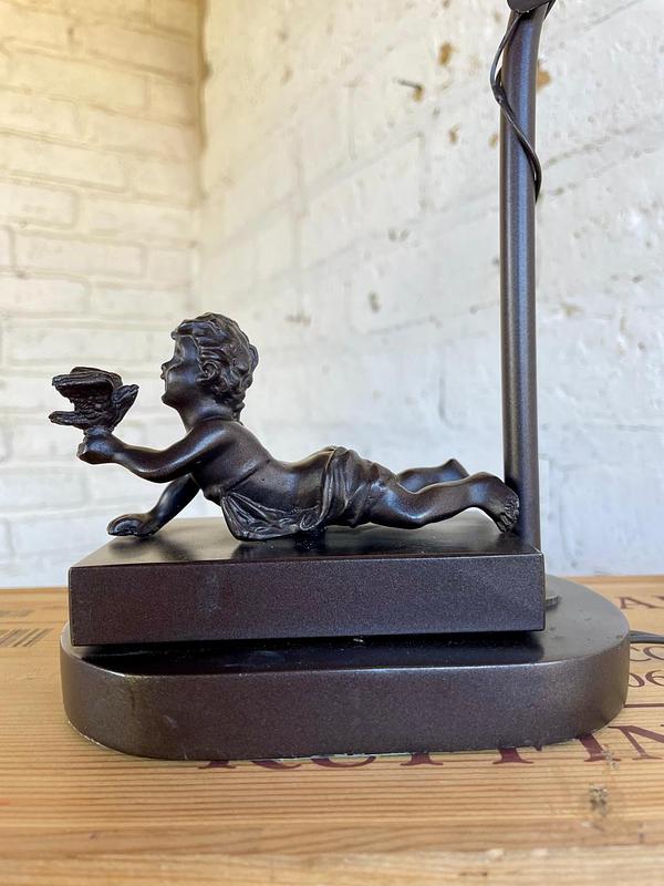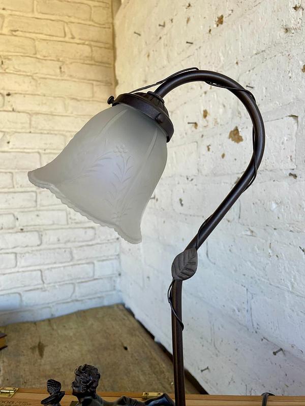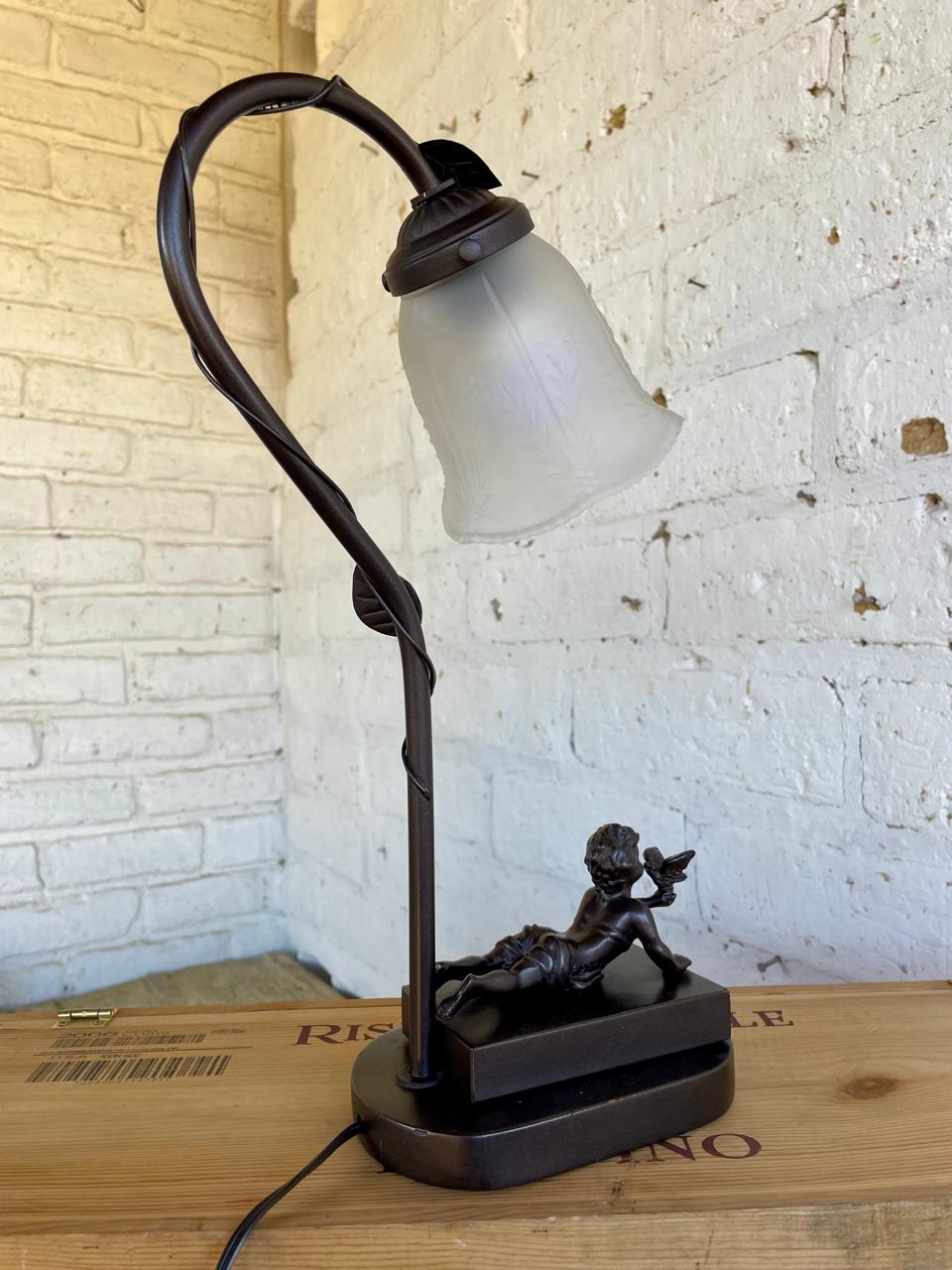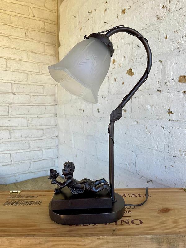 Lámpara de mesa decorada en la base con la figura de un niño en bronce y caperuza de vidrio opaco.