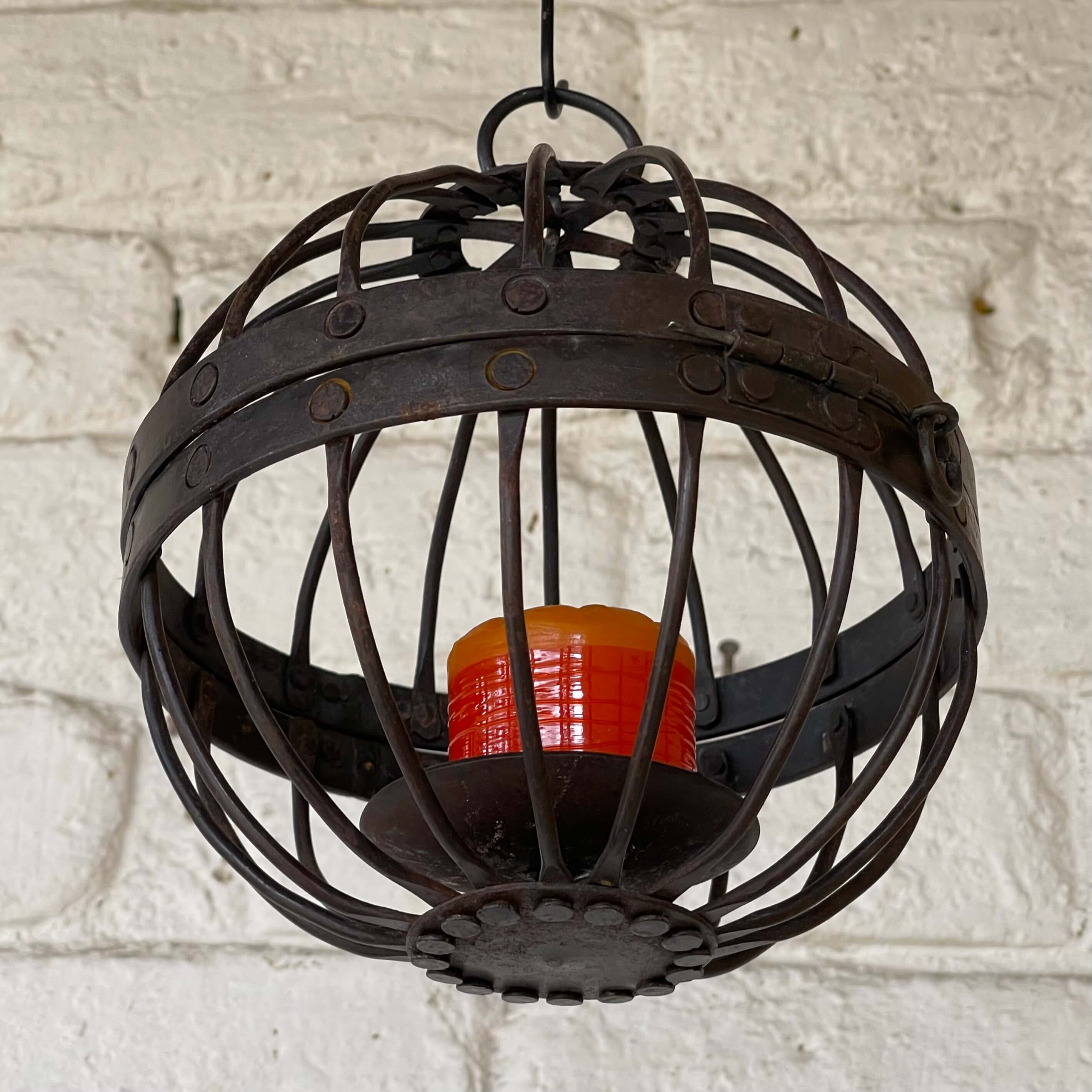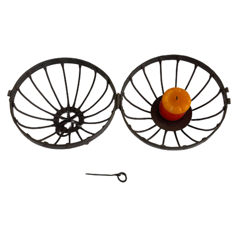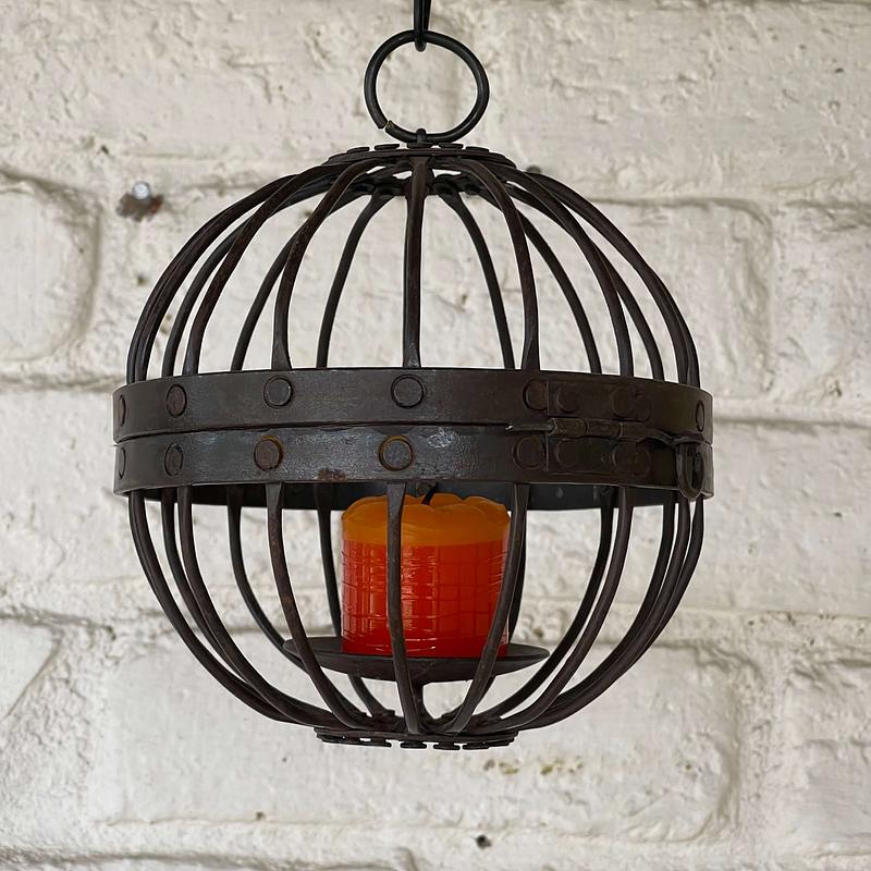 Portavela de metal grueso remachado, tiene bisagra que permite abrir la esfera para poner la vela.