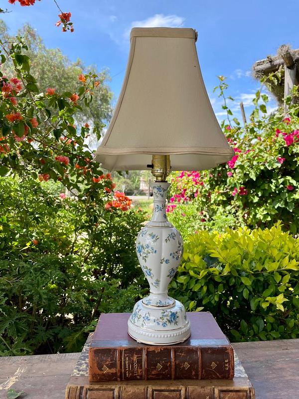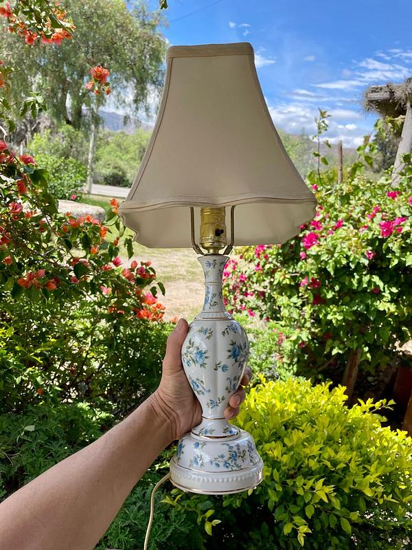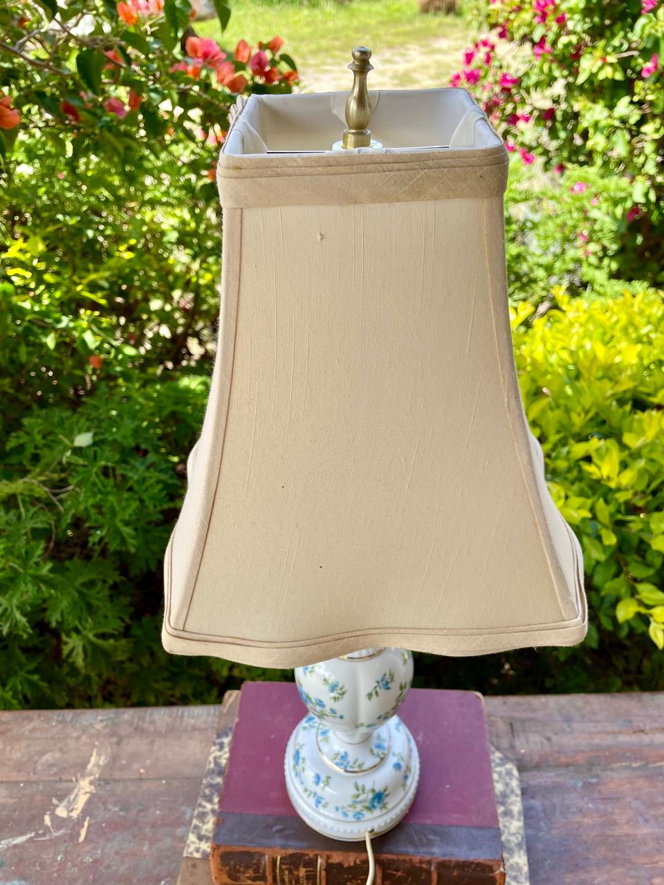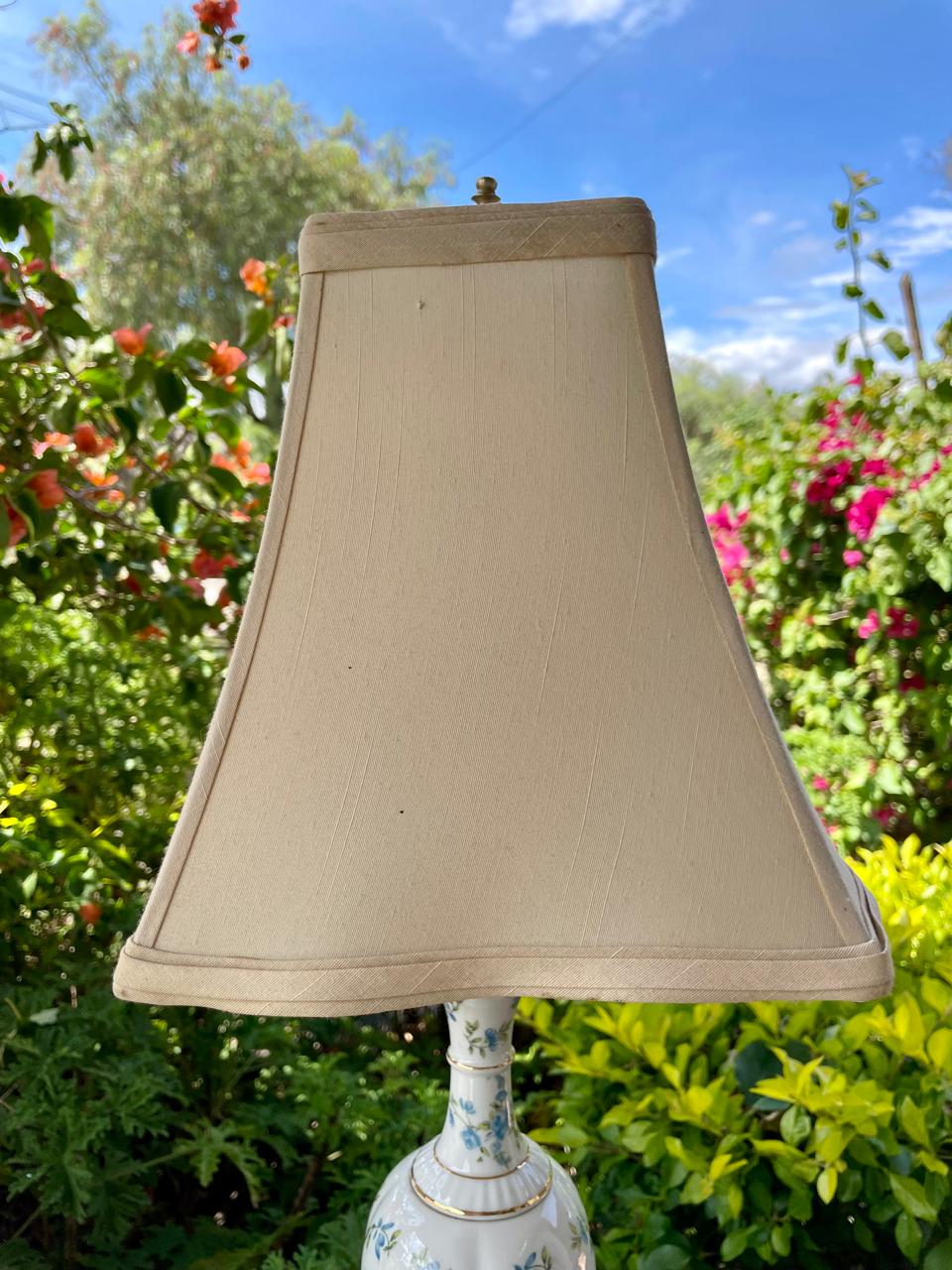 La base de porcelana decorada con flores azules y bordes dorados fue fabricada en Hungría en los años ochenta, se encuentra en buen estado. La caperuza de tela de algodón beige con forro de seda es reciente. La parte eléctrica se ha revisado y funciona bien.