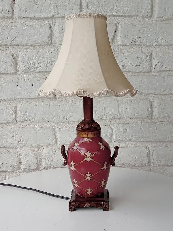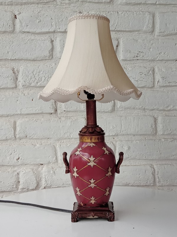 La base de esta lámpara con forma de jarrón es en resina fabricada en Taiwan a mediados de los años setenta, la caperuza se ha elaborado recientemente en lino con forro de seda y bordes rematados con millaré. La parte eléctrica se ha revisado y funciona bien.