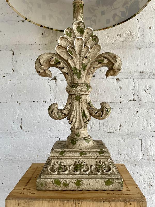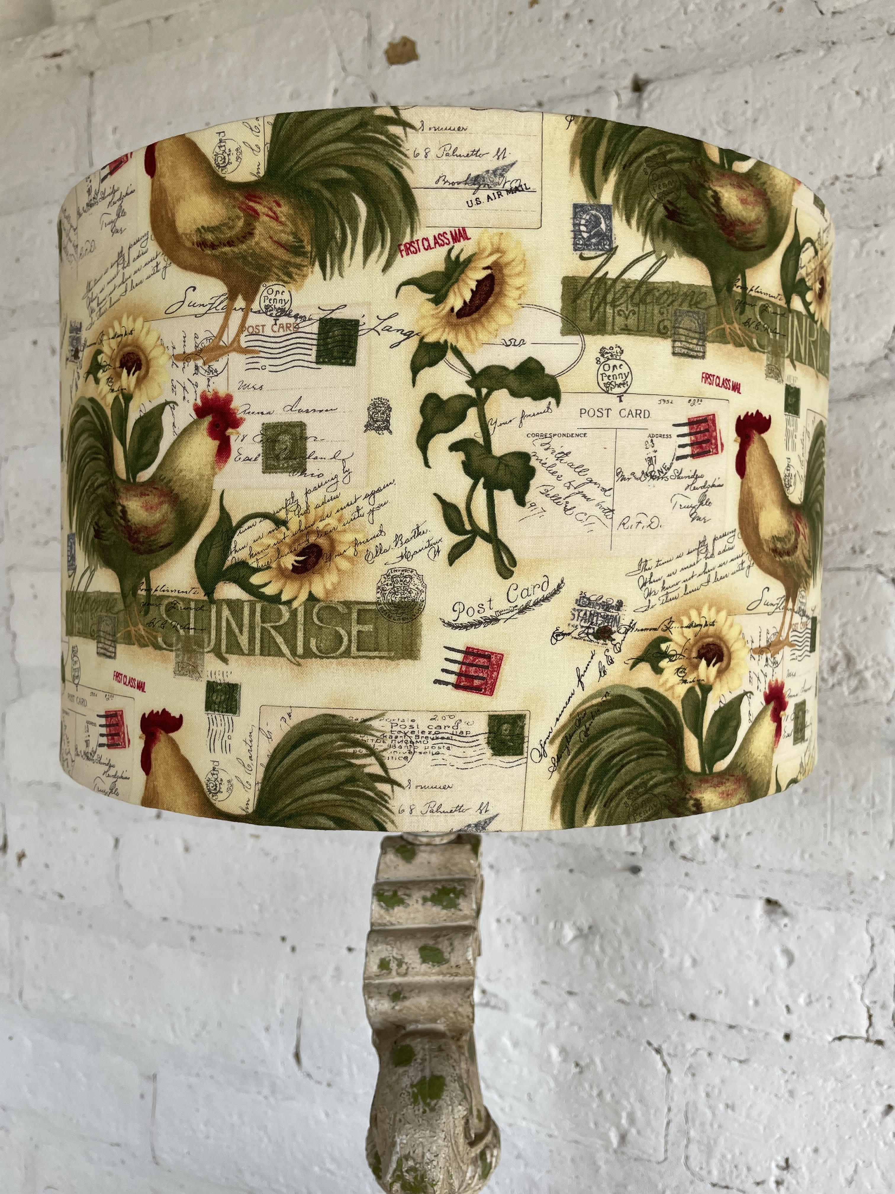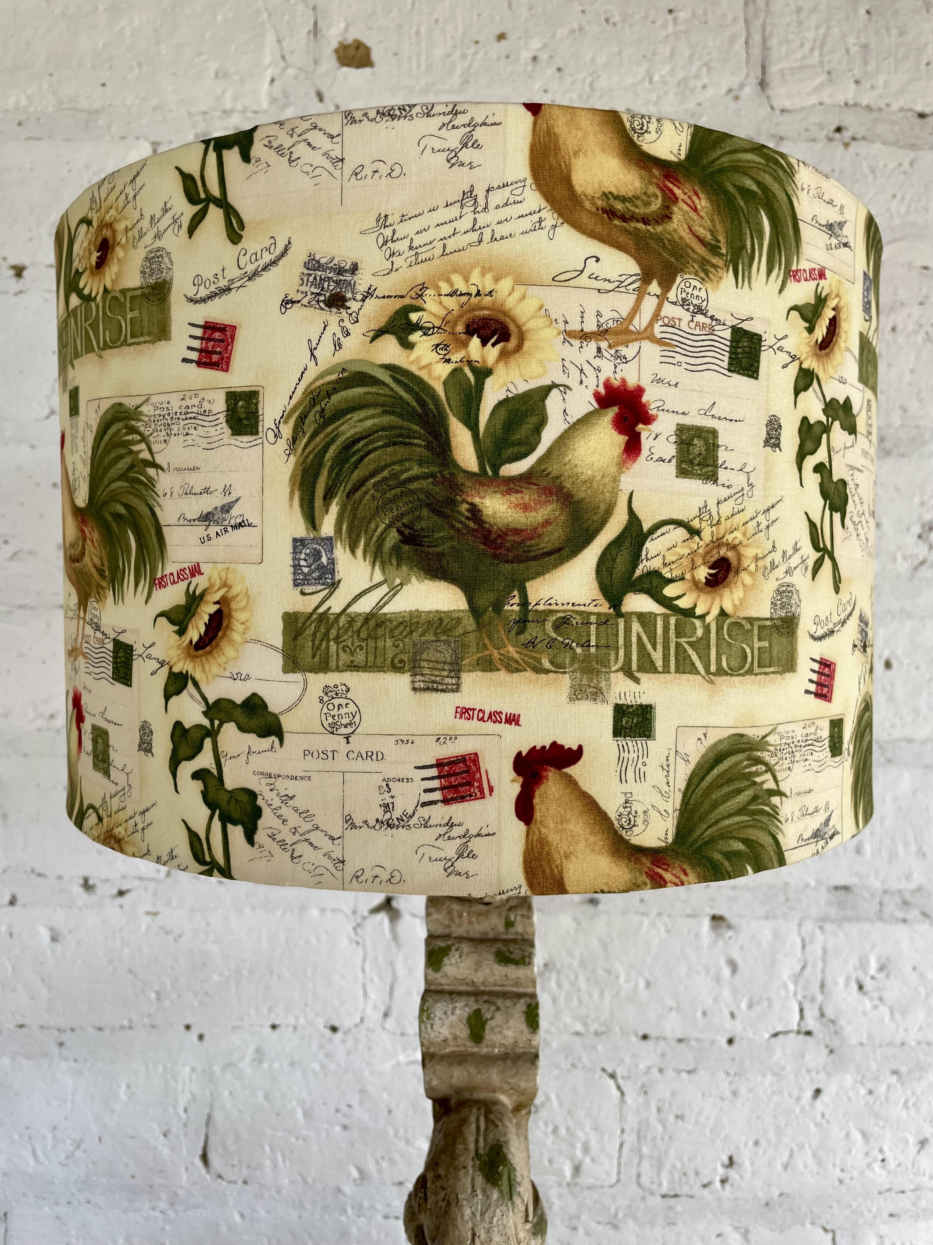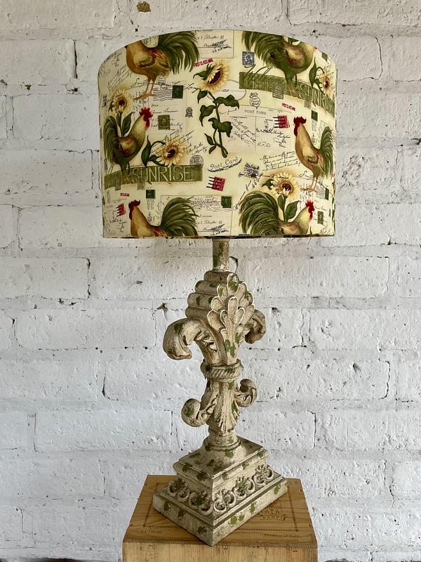 Lámpara con base en resina fuerte decorada con pintura desgastada y apariencia antigua, la caperuza es de tela estampada con motivos de gallos y girasoles.