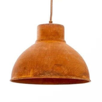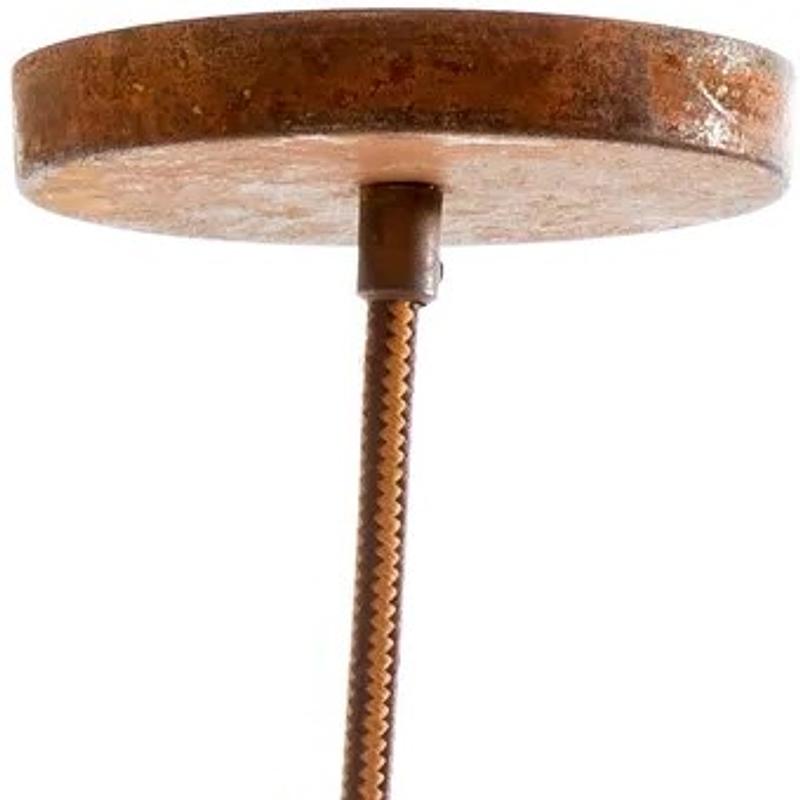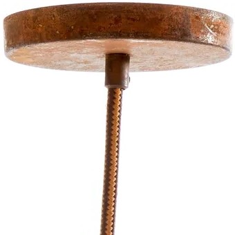Lámpara metálica decorada con pintura que da apariencia de óxido. Incluye soporte de techo y cable textil. Pueden presentarse variaciones de color con la lámpara de la foto y entre una lámpara y otra.