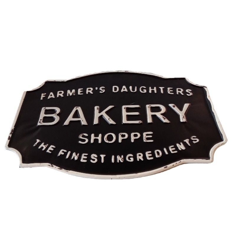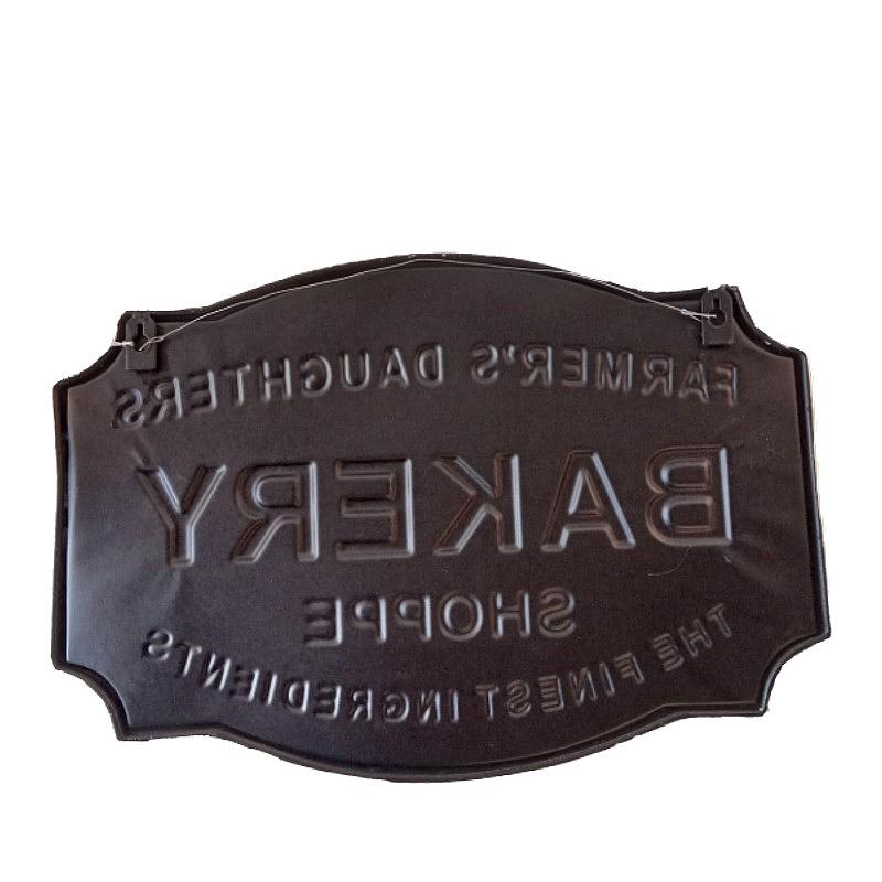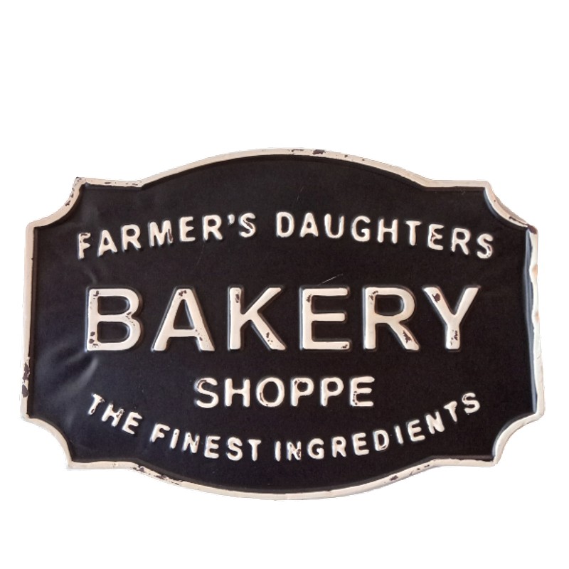 Letrero en metal grueso decorado con pintura desgastada dándole apariencia antigua.