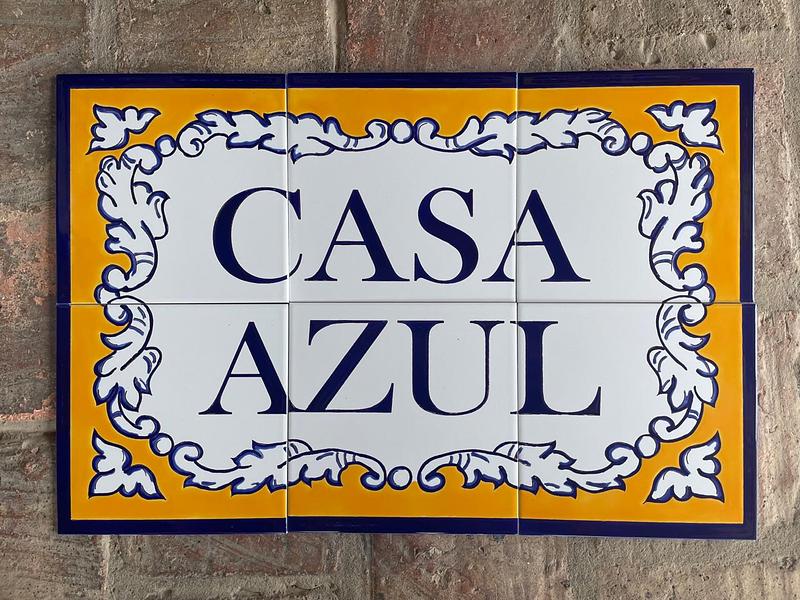 Modelo de azulejo personalizado pintado sobre 6 baldosas de 20 x 20 cm c/u para un tamaño total de 40 x 60 cm. Las baldosas se han pintado artesanalmente y se han quemado a alta temperatura. Letrero apto para exteriores. Elaborada con barnices de calidad para garantizar su exposición a la intemperie, sol, lluvia, etc., sin desteñirse. Colores garantizados de por vida. Ideal para portales y entradas de fincas y casas.