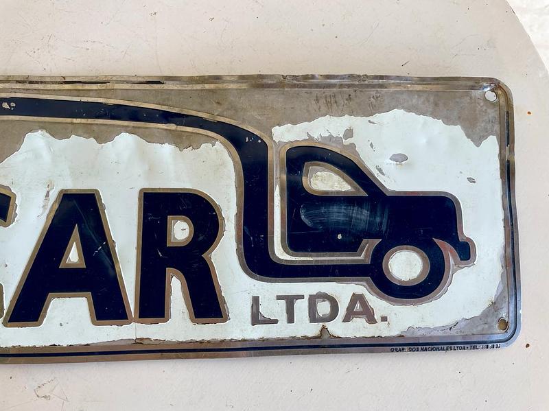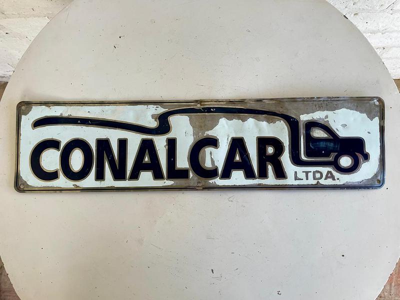 Letrero metálico de un furgón de la marca conalcar de 2005, tiene desgastes en la pintura y abolladuras en el metal.