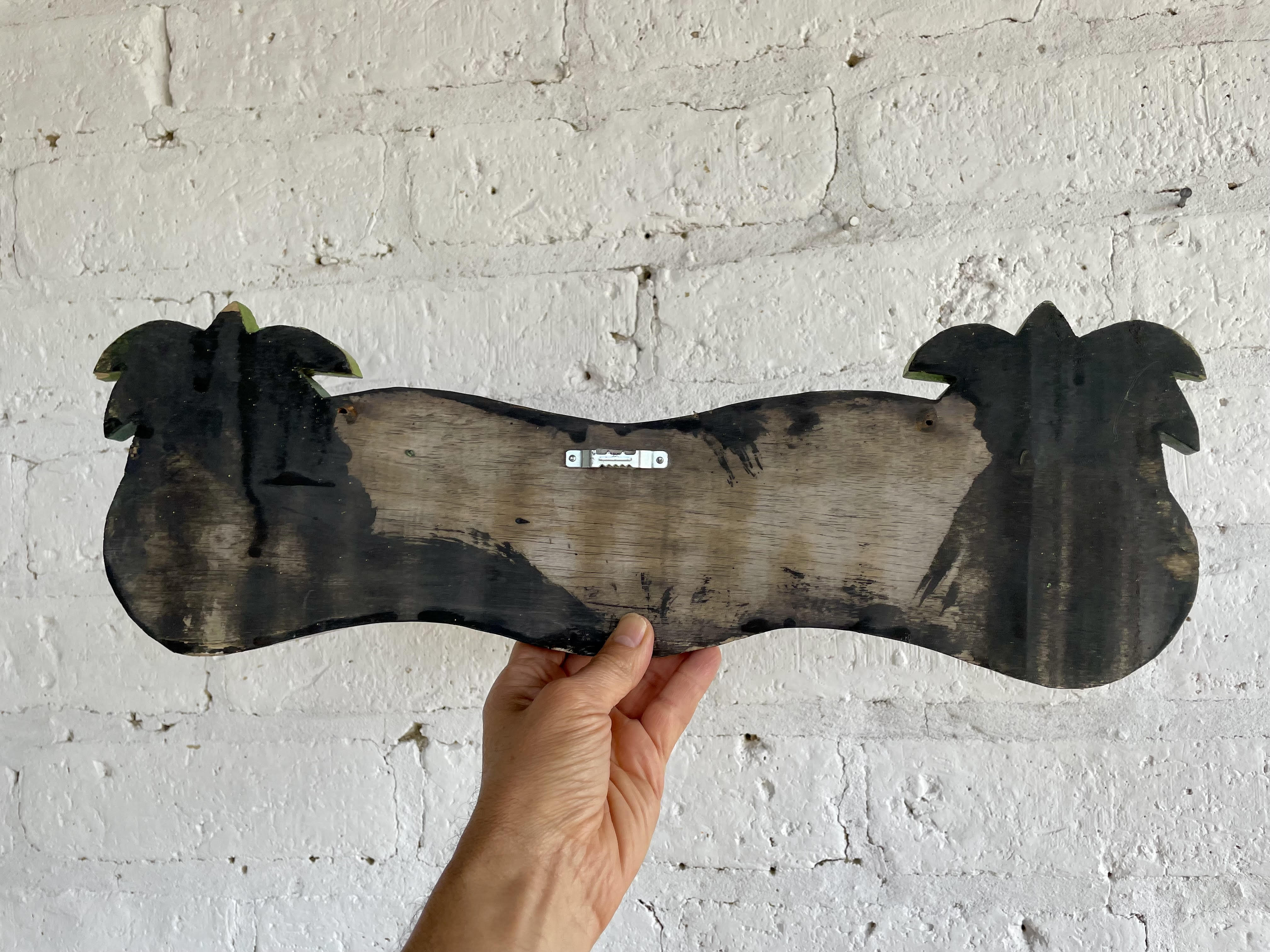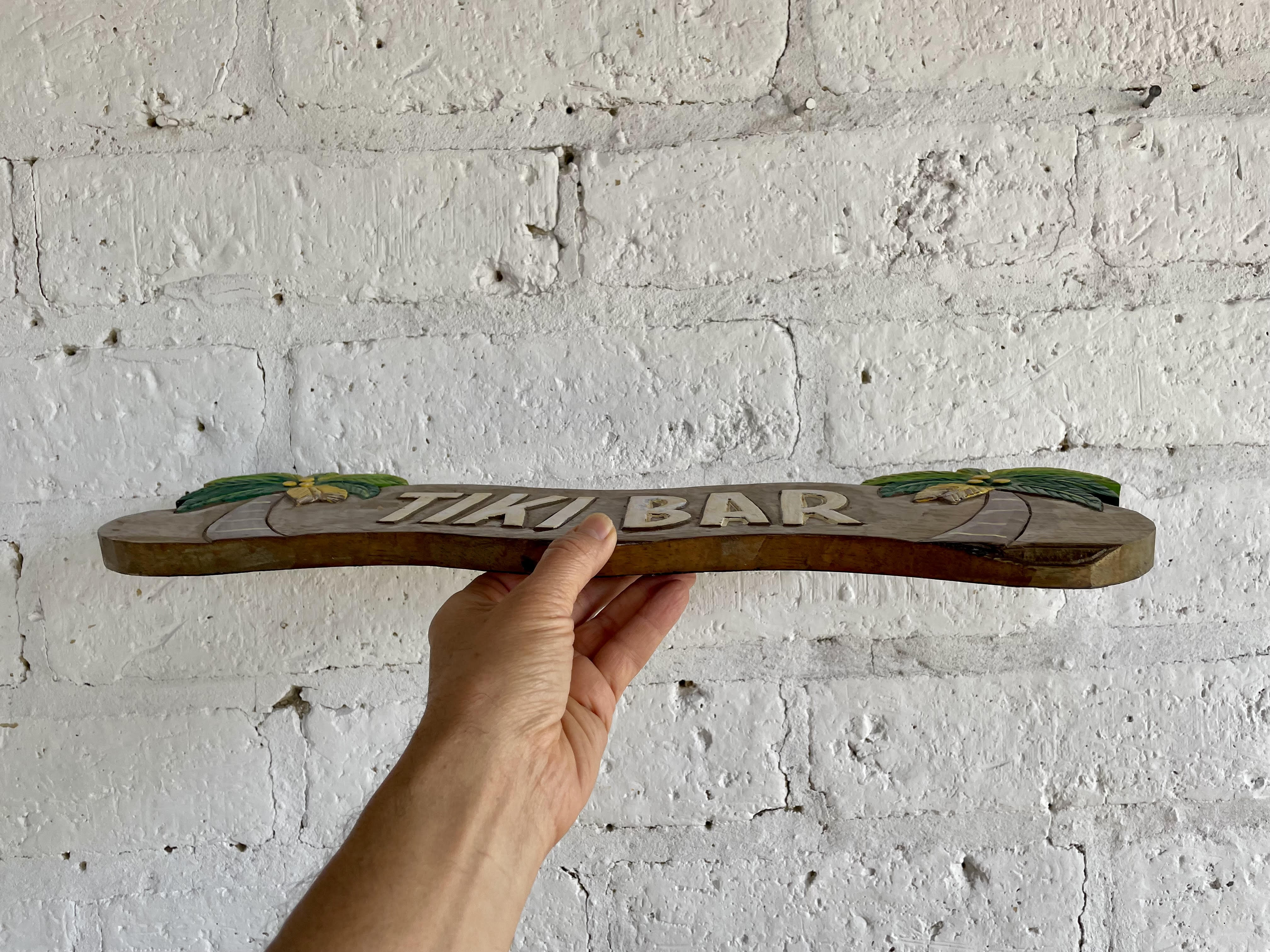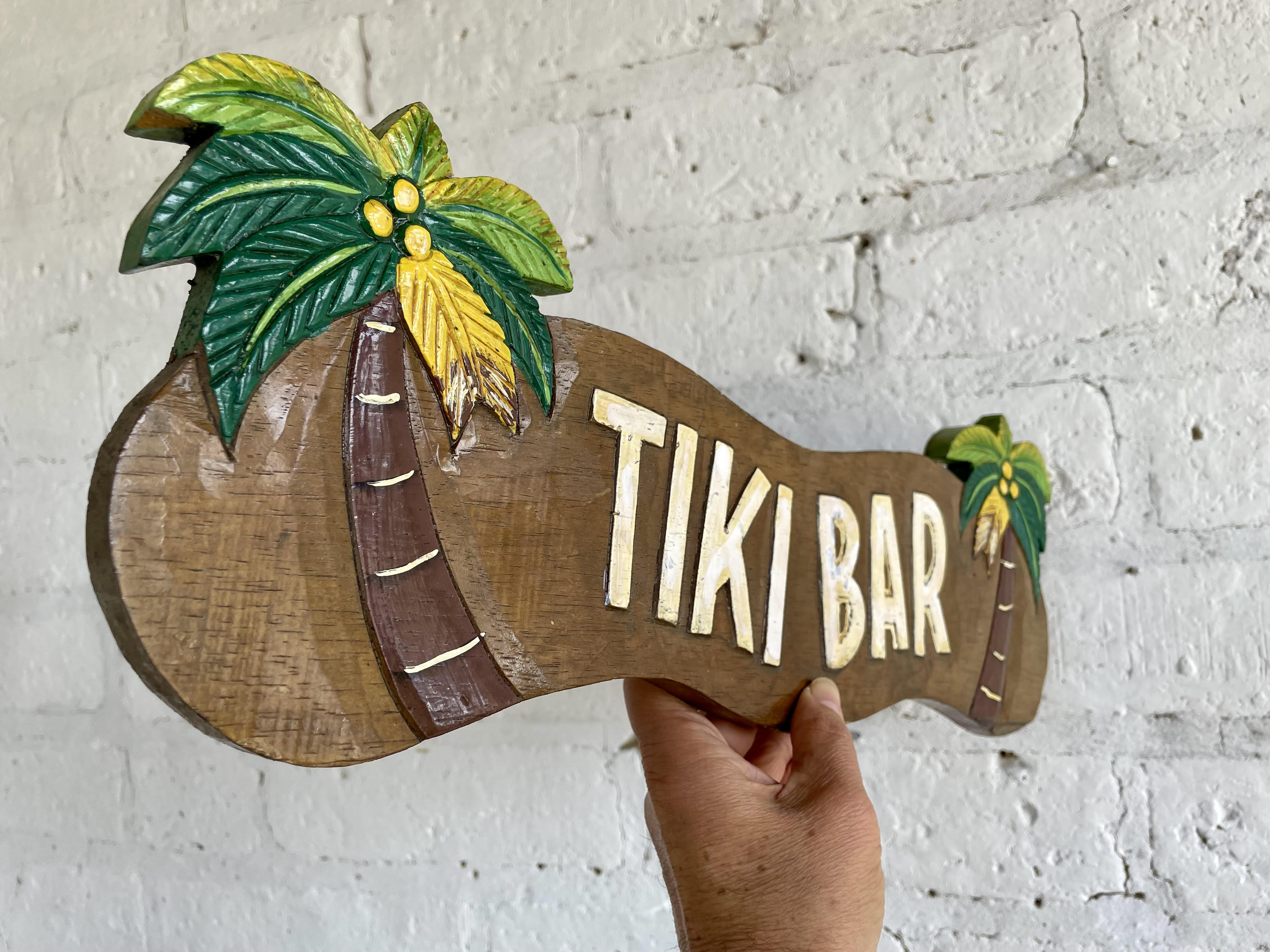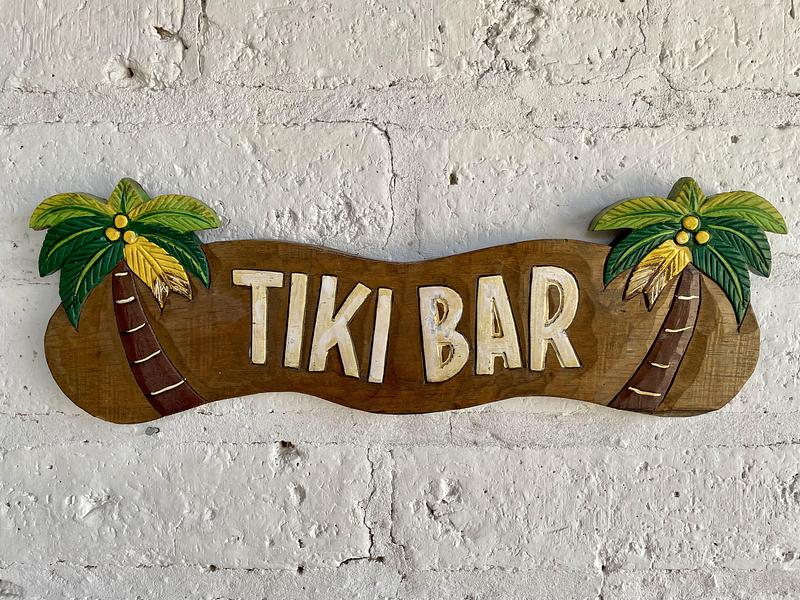 Letrero artesanal elaborado en indonesia tallado en madera y decorado con pintura lacada.