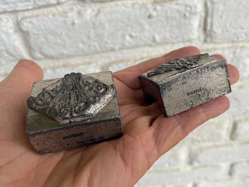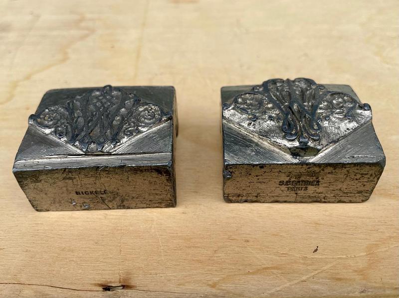 Pareja de linotipos niquelados antiguos franceses. En la base están marcados en bajo relieve S. Berthier Paris, Nickelé.