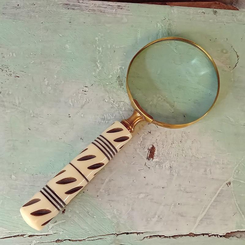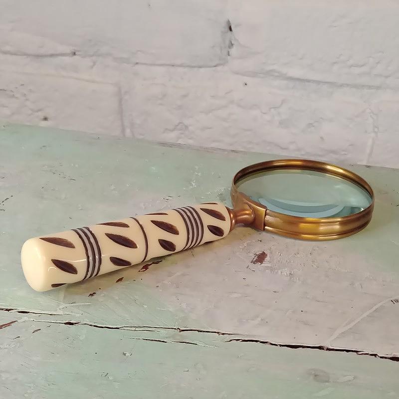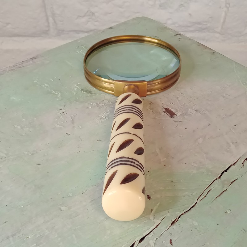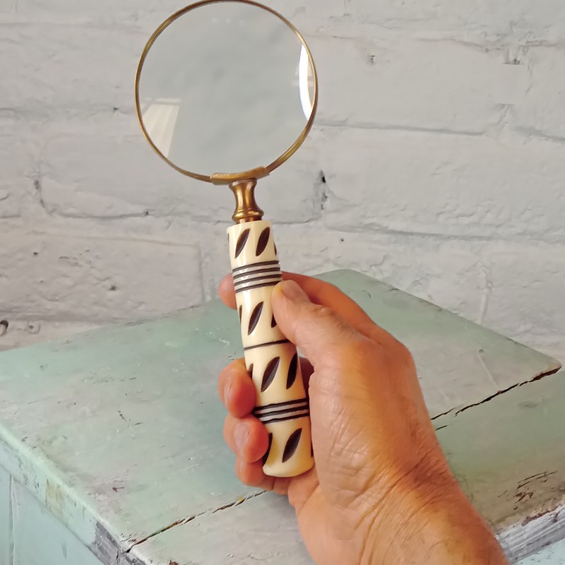Lupa con marco en lámina de bronce y mango sintético con apariencia de hueso, elaborada en la India en la década del noventa. Se encuentra en buen estado,