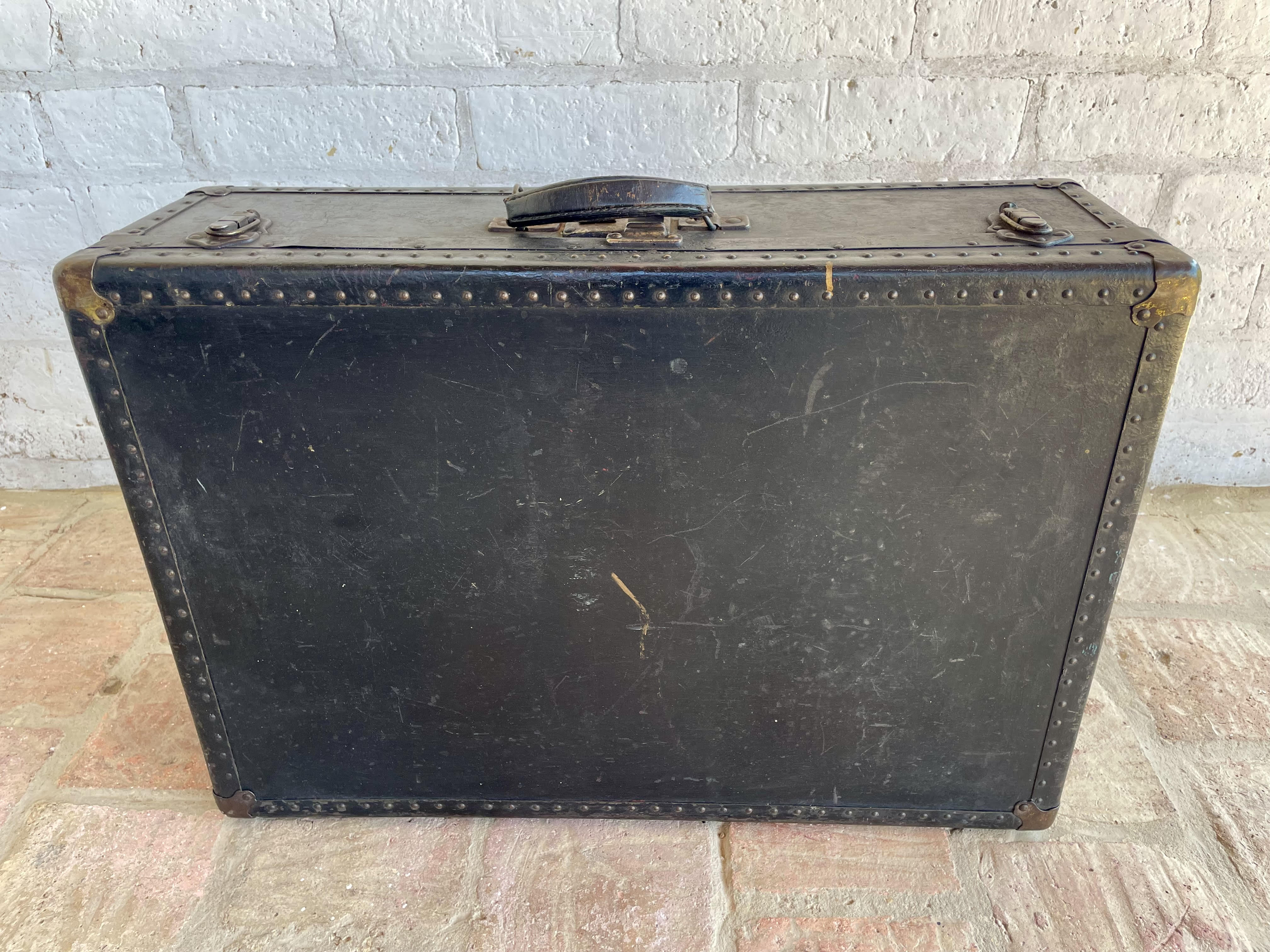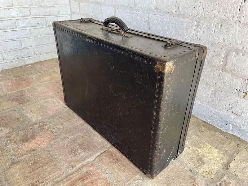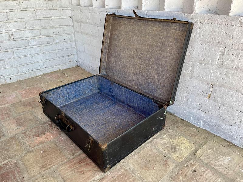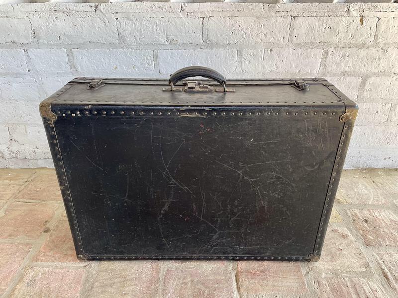 Maleta de viaje de la década del cuarenta elaborada en madera con cubierta de cuero curtido en negro, dos cierres de palanca, un seguro para llave y manija de cuero. Los bordes están cubiertos con ángulos metálicos reforzados con taches y esquineras, el forro interno tiene manchas, desgastes y algunas rasgaduras. La cubierta de cuero tiene rayaduras, manchas y desgastes. No tiene llave.
