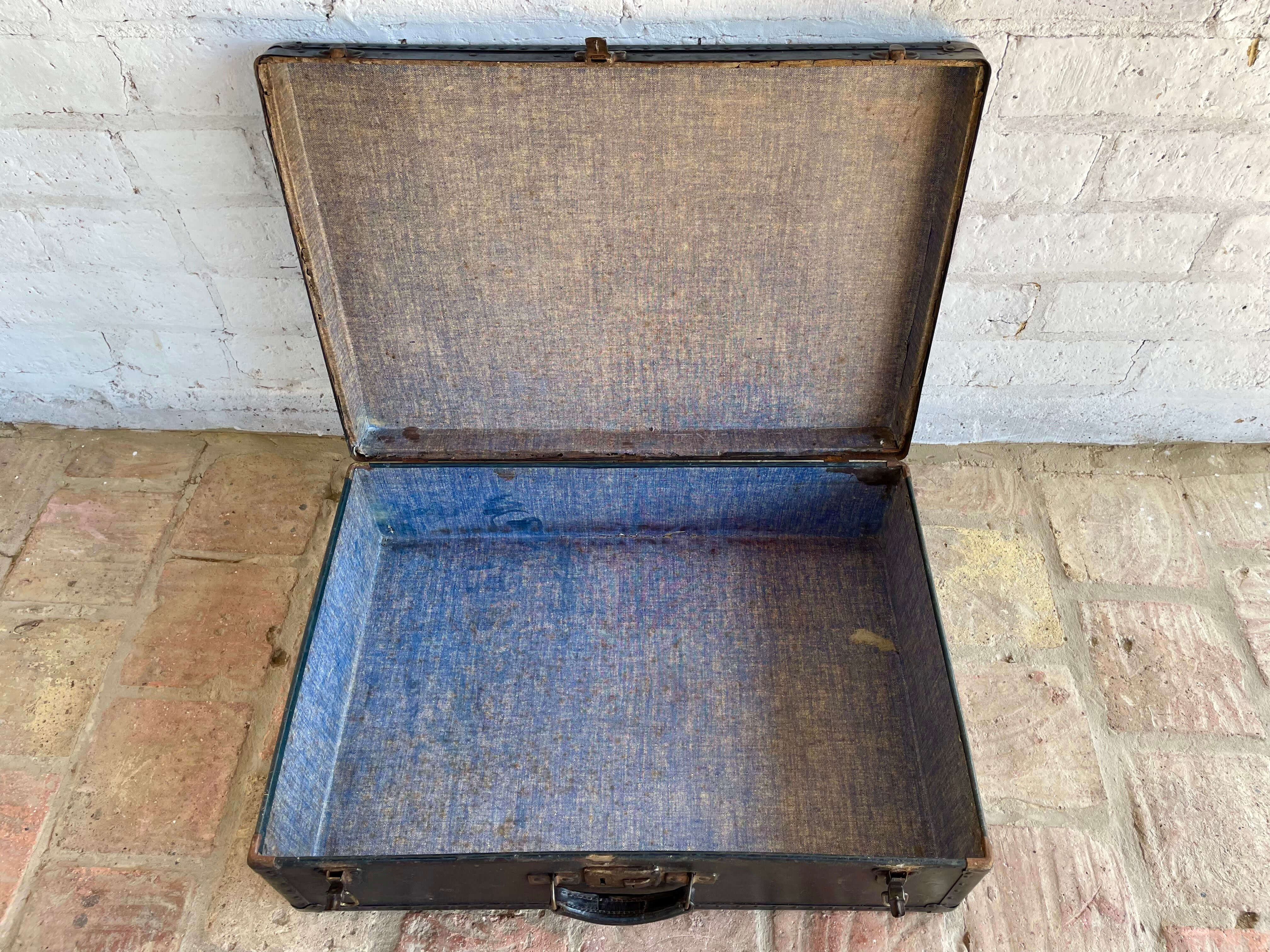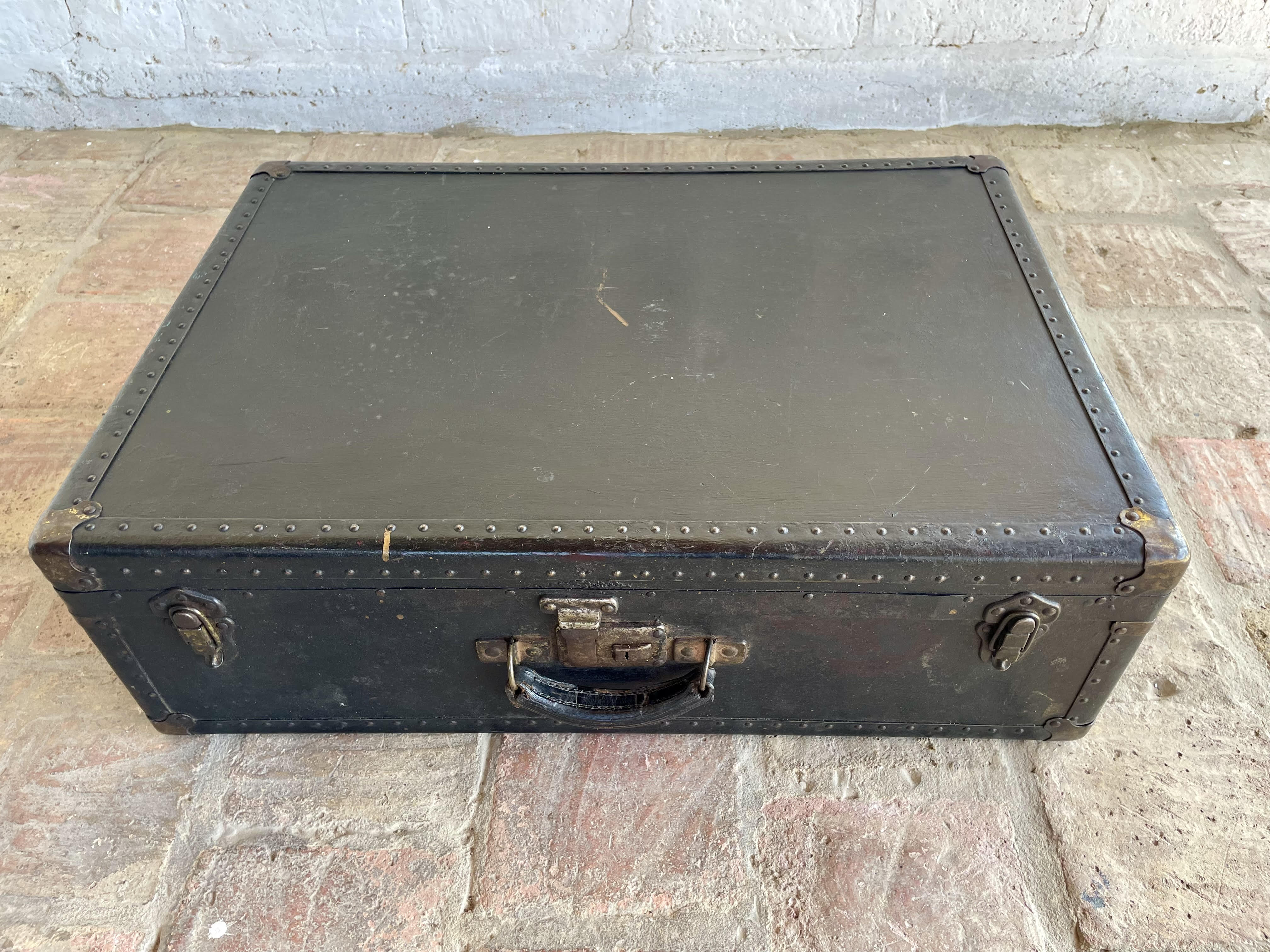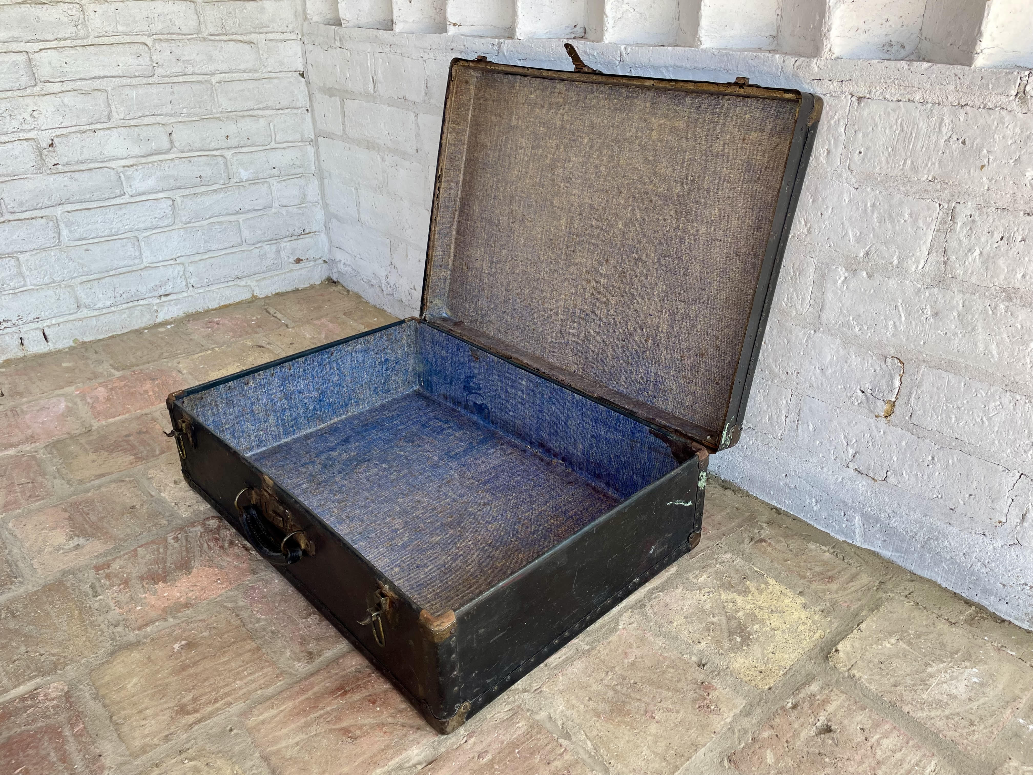Maleta de viaje de la década del cuarenta elaborada en madera con cubierta de cuero curtido en negro, dos cierres de palanca, un seguro para llave y manija de cuero. Los bordes están cubiertos con ángulos metálicos reforzados con taches y esquineras, el forro interno tiene manchas, desgastes y algunas rasgaduras. La cubierta de cuero tiene rayaduras, manchas y desgastes. No tiene llave.