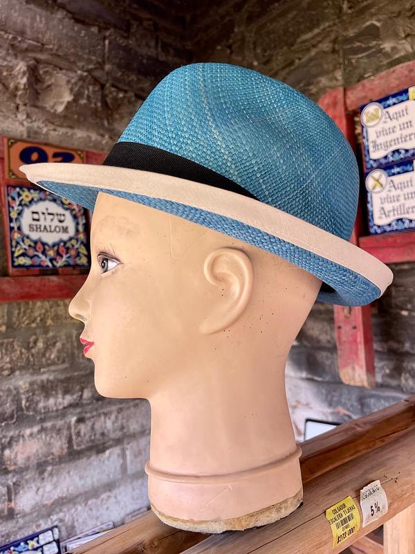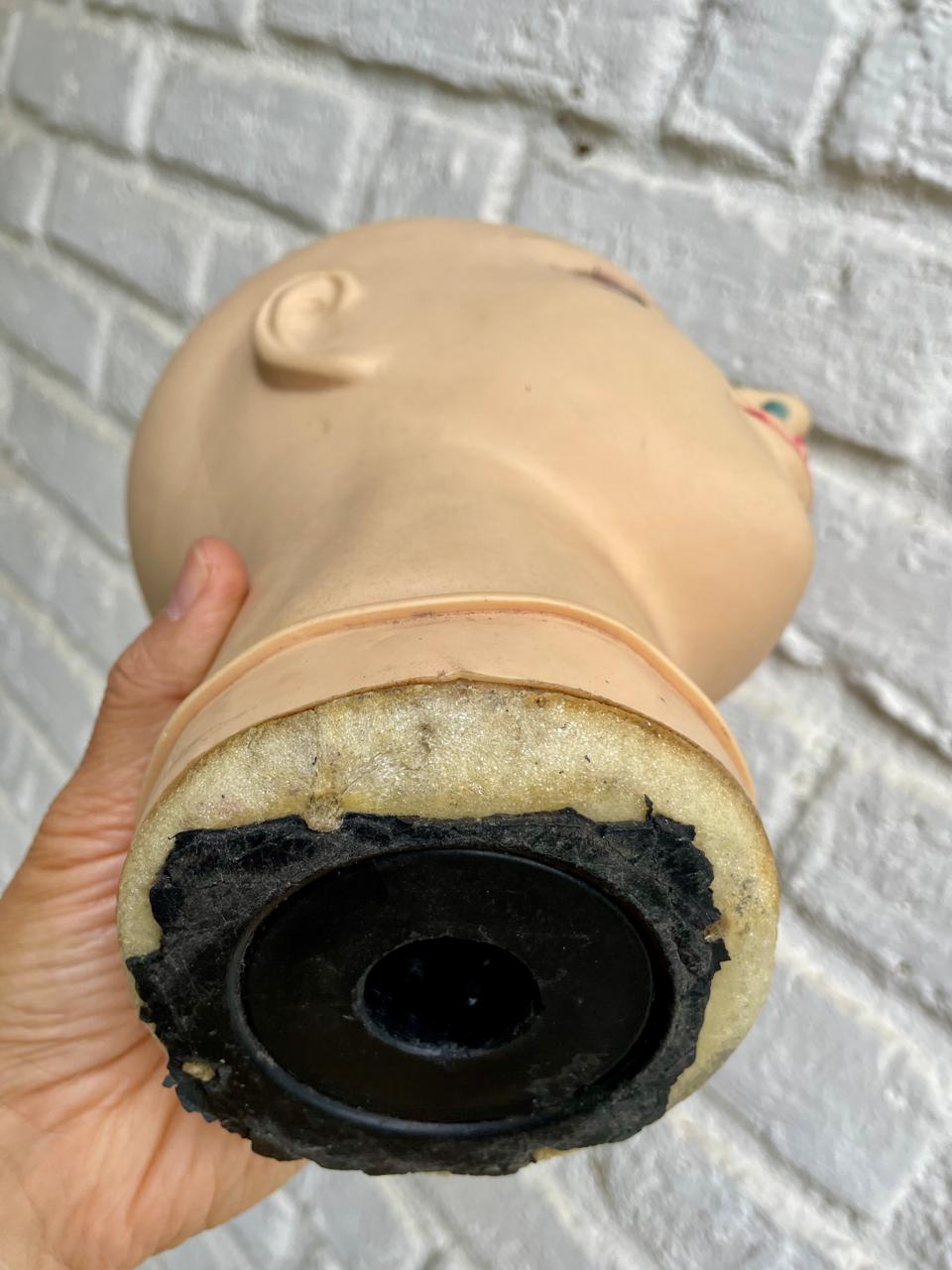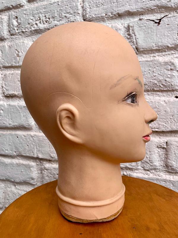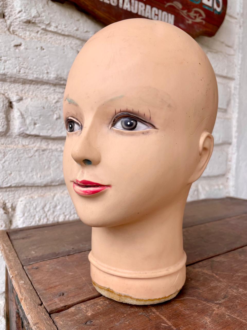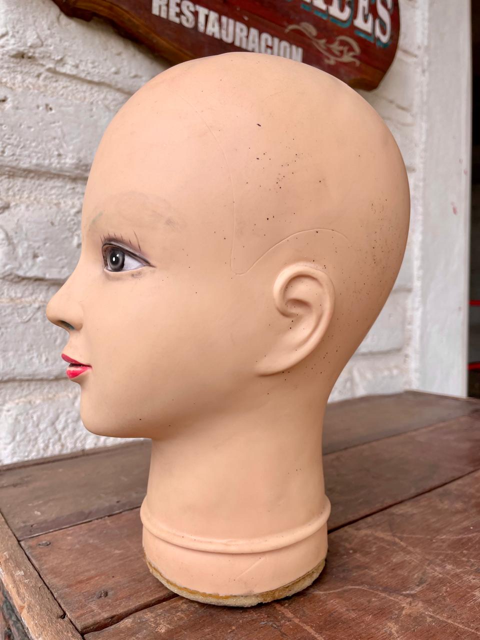 Cabeza de maniquí de caucho sin pelo, tiene los ojos pintados, presenta desgastes en la pintura de las cejas, los bordes de la base se enuentran pelados.