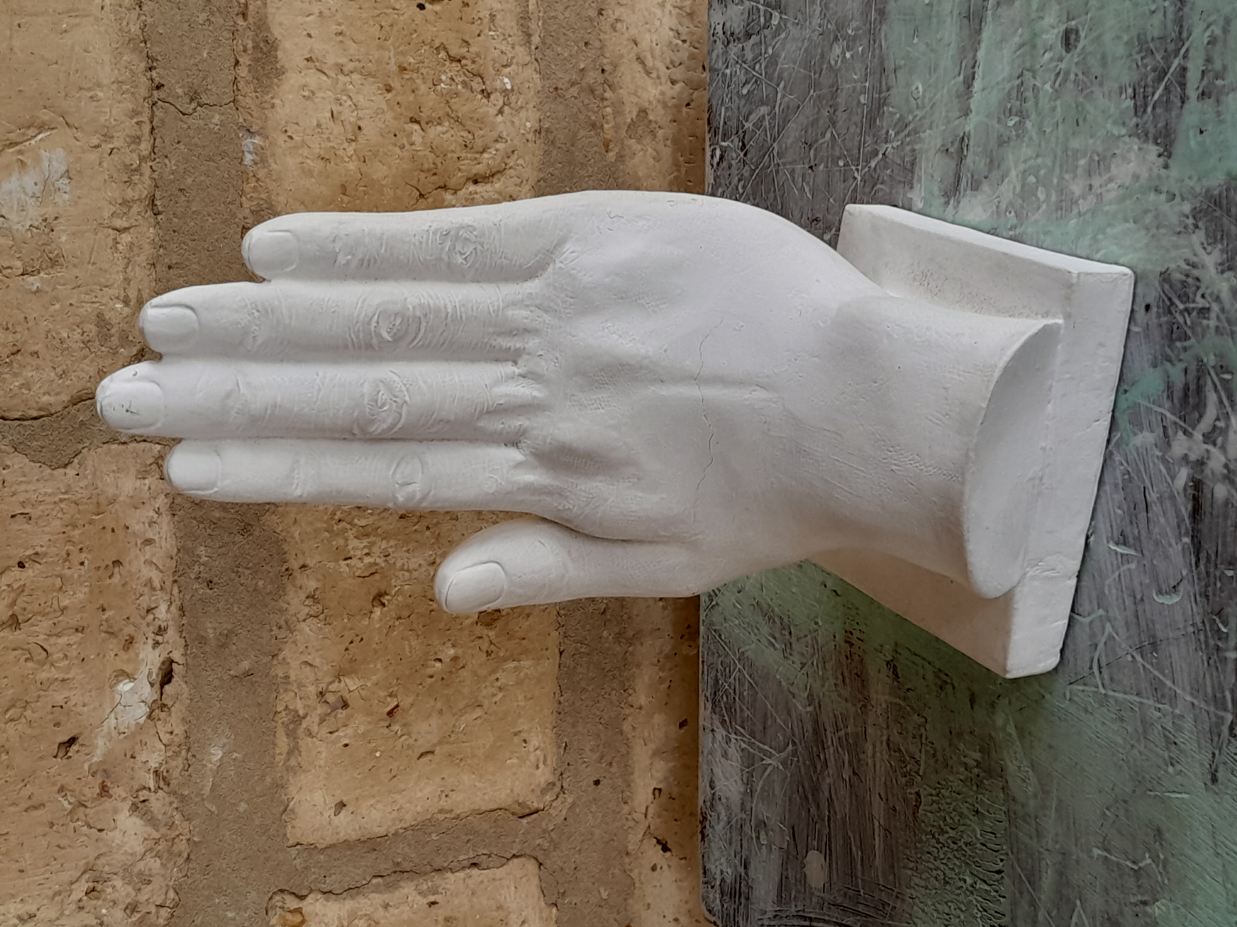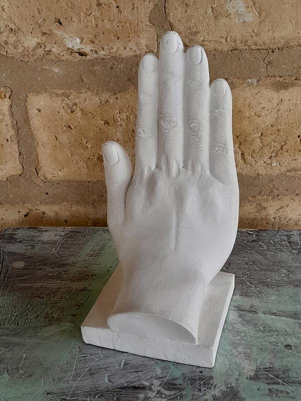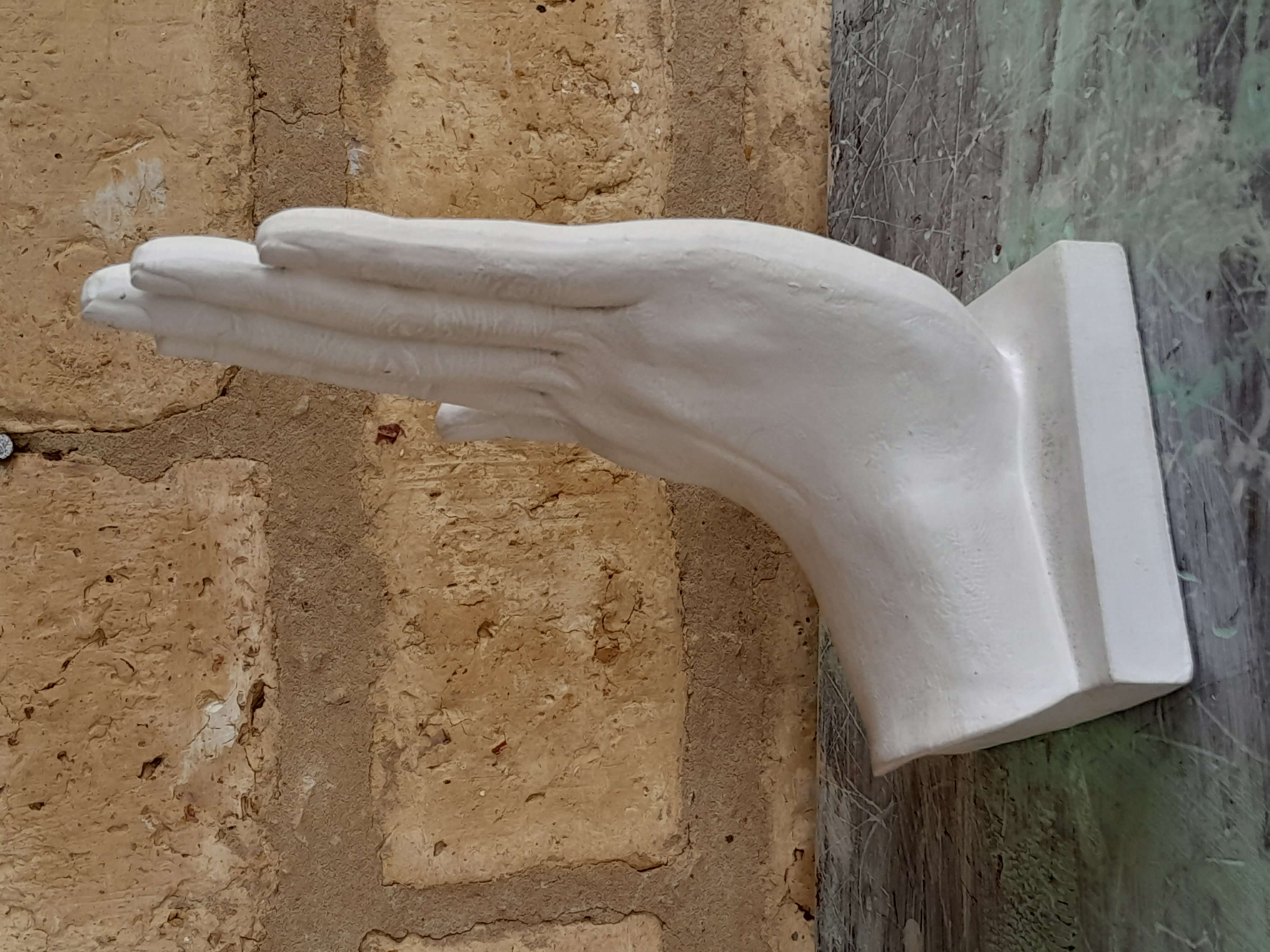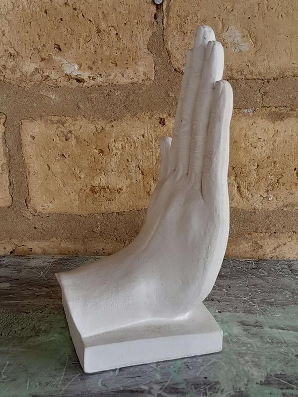 Mano decorativa en resina elaborada con el molde de una mano real, se puede utilizar para trancar los libros.