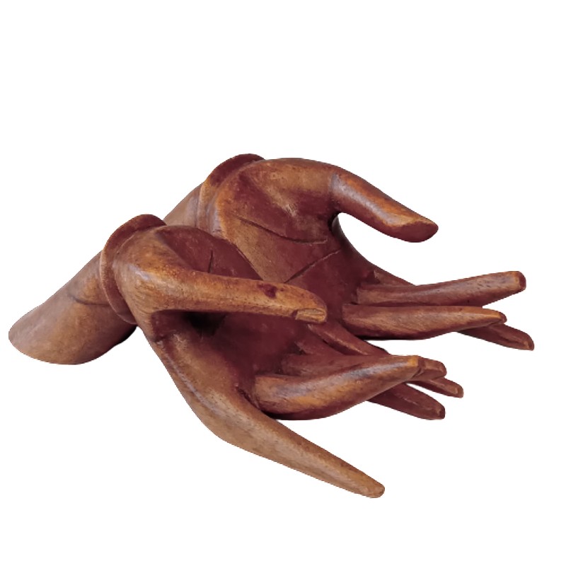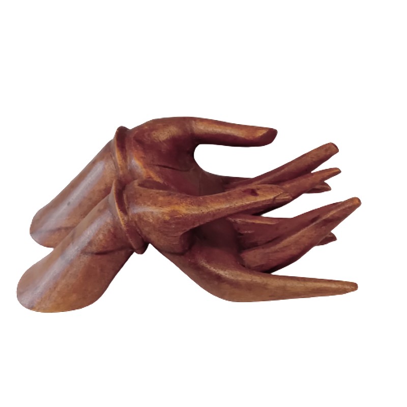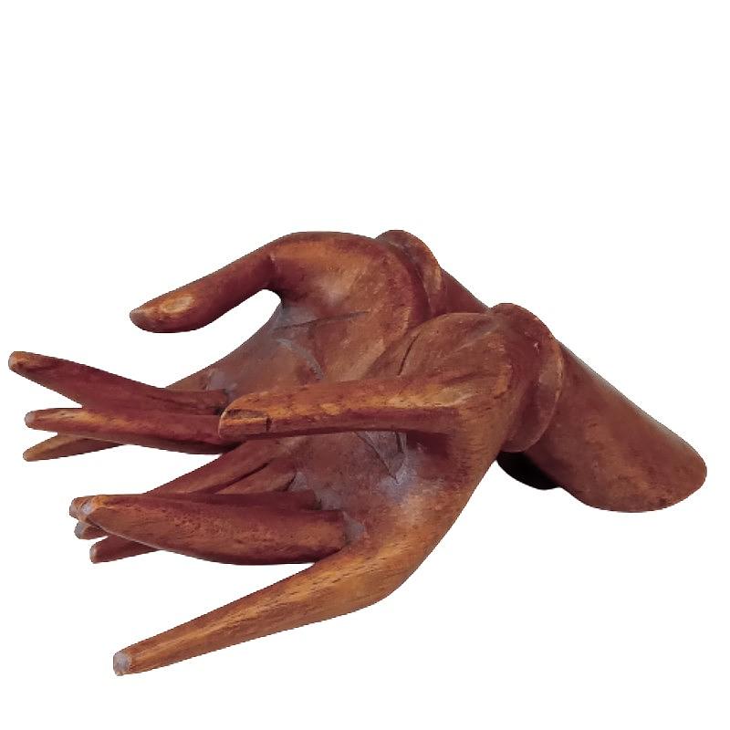 Manos talladas artesanalmente en madera. Puede utilizarse como exhibidor de tajetas.