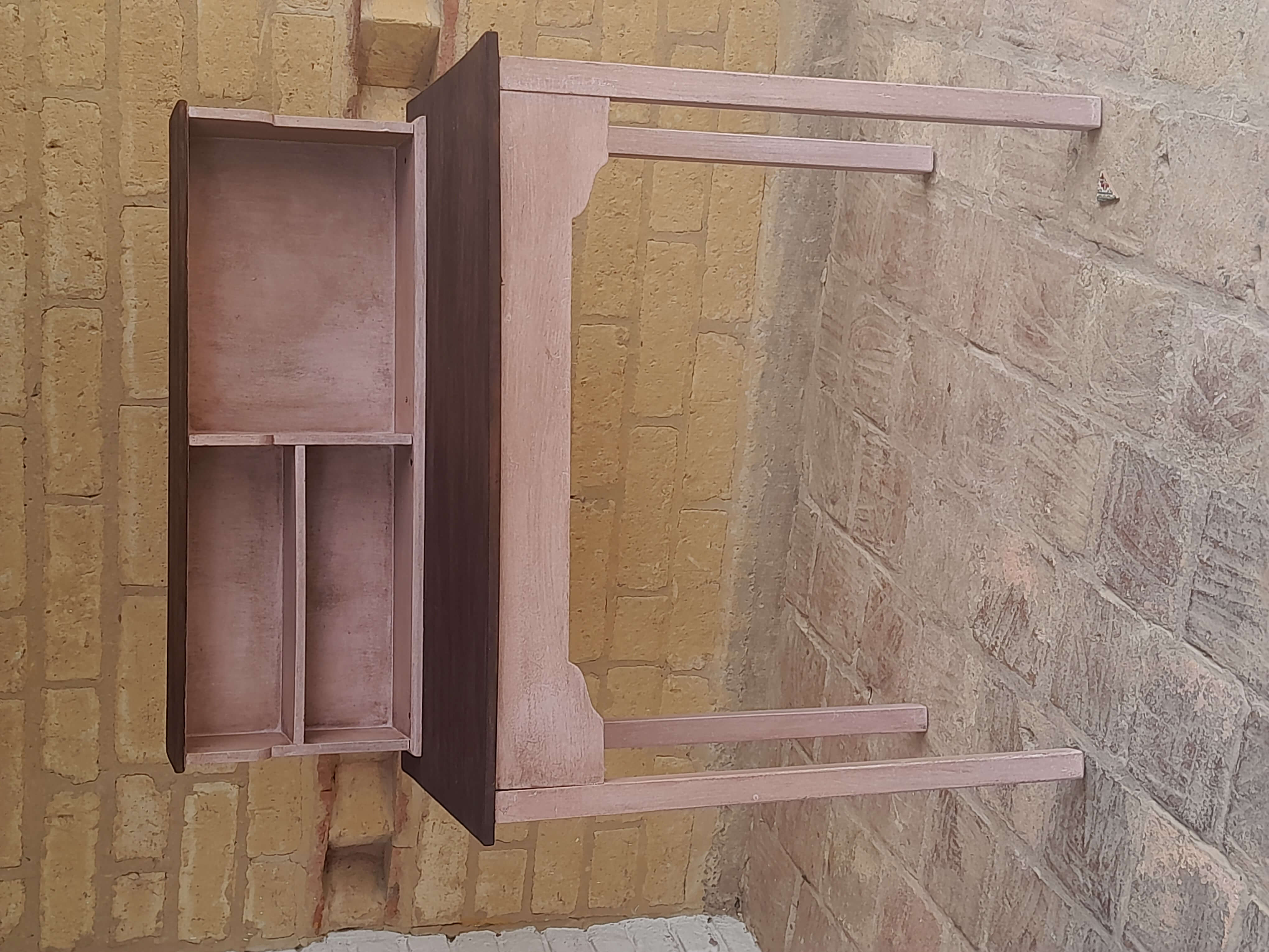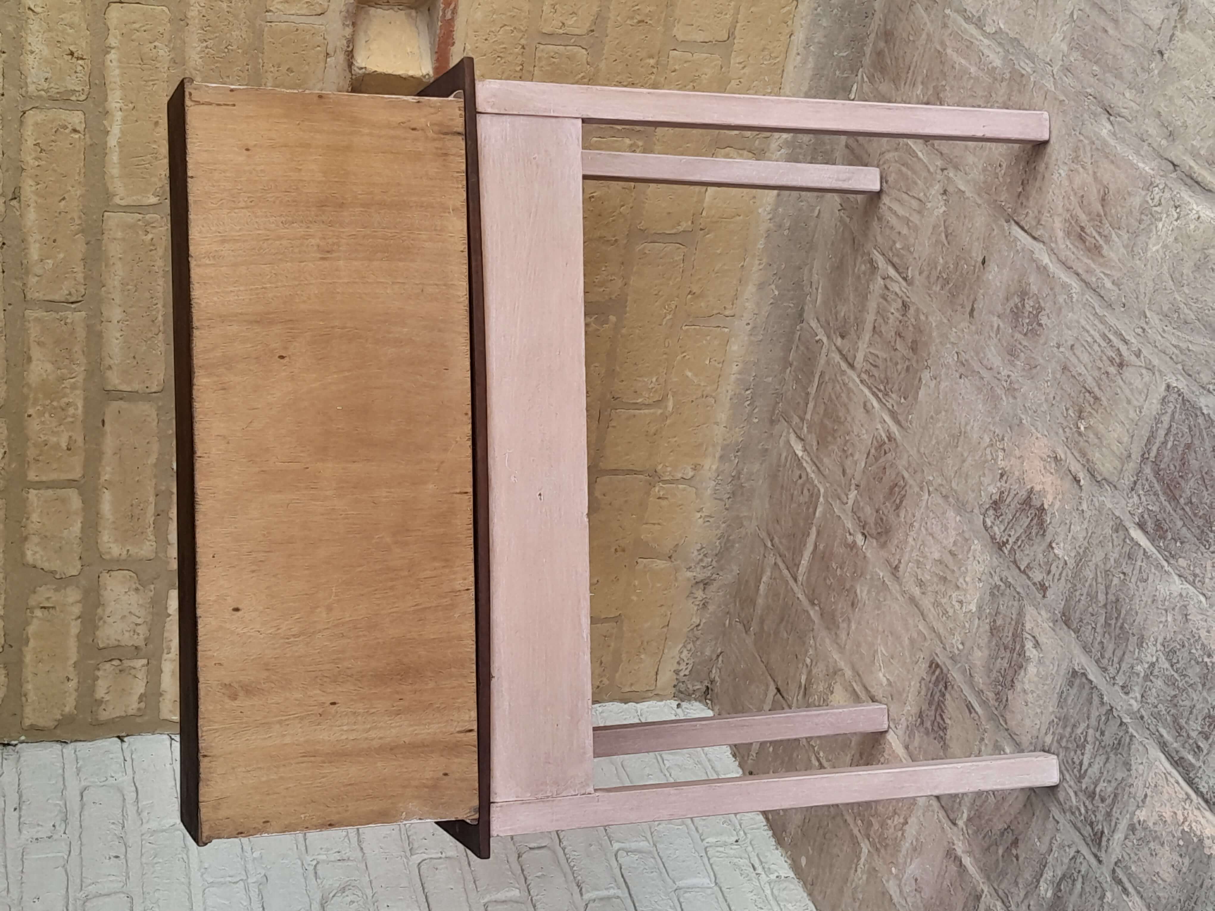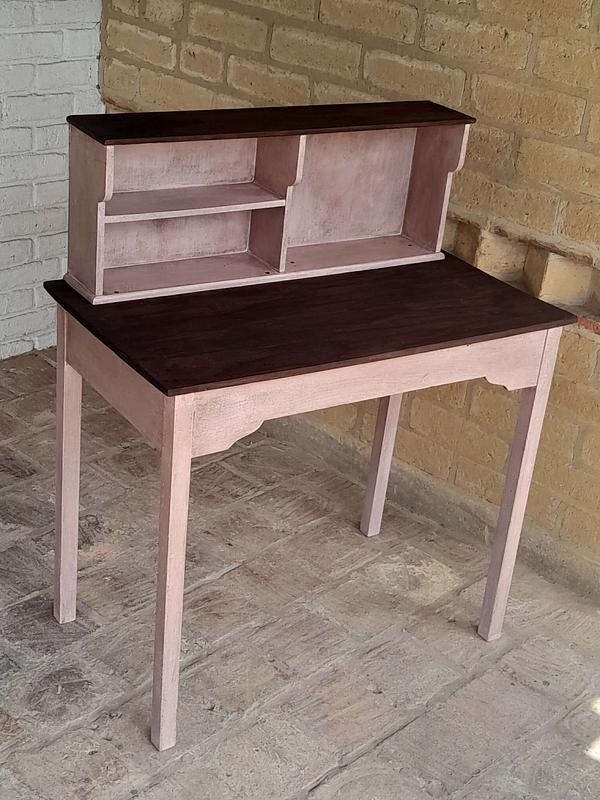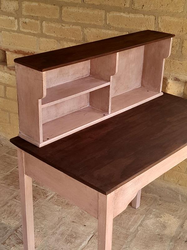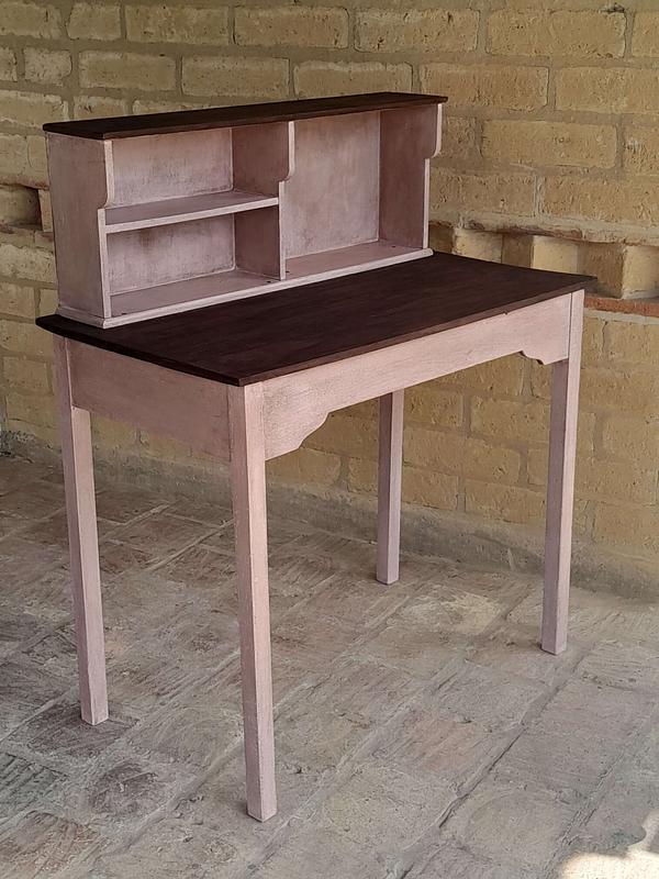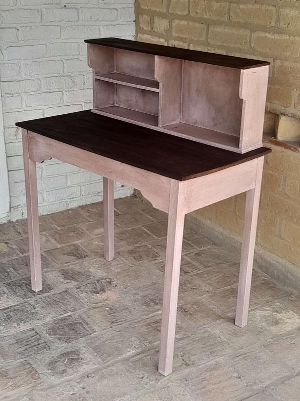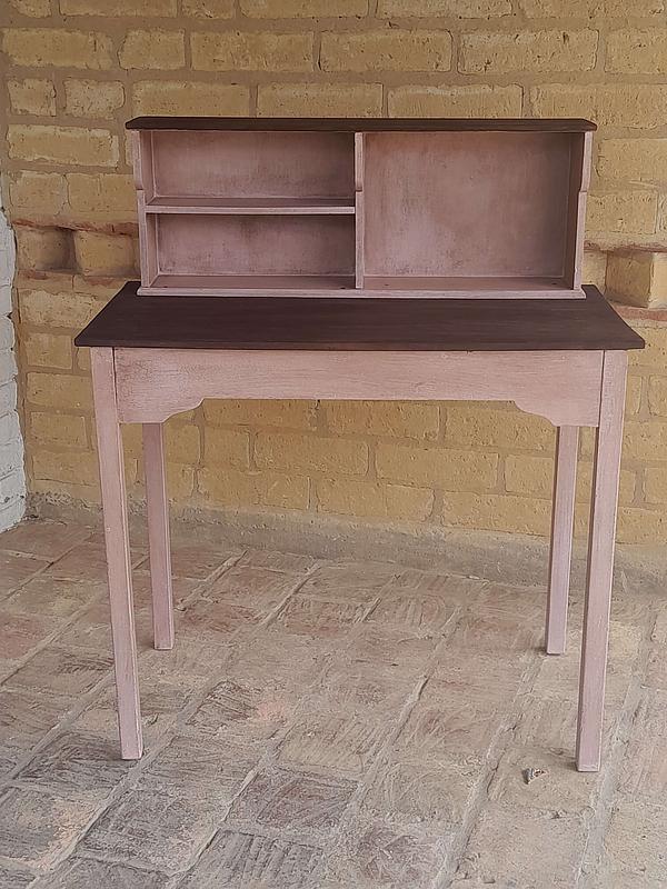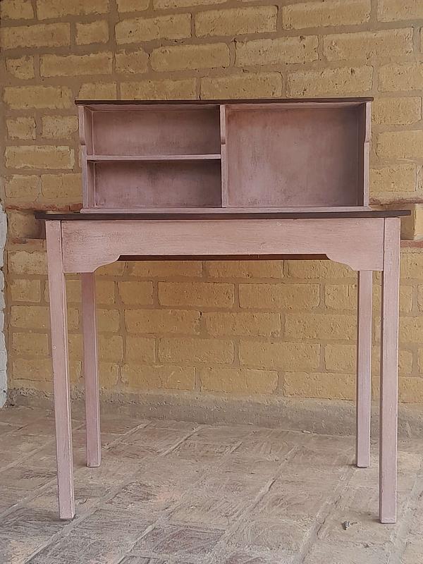 Mesa de madera rústica decorada en color rosa y superficies con madera a la vista, tiene una repisa en la superficie. Se puede utilizar como escritorio o mesa de taller.