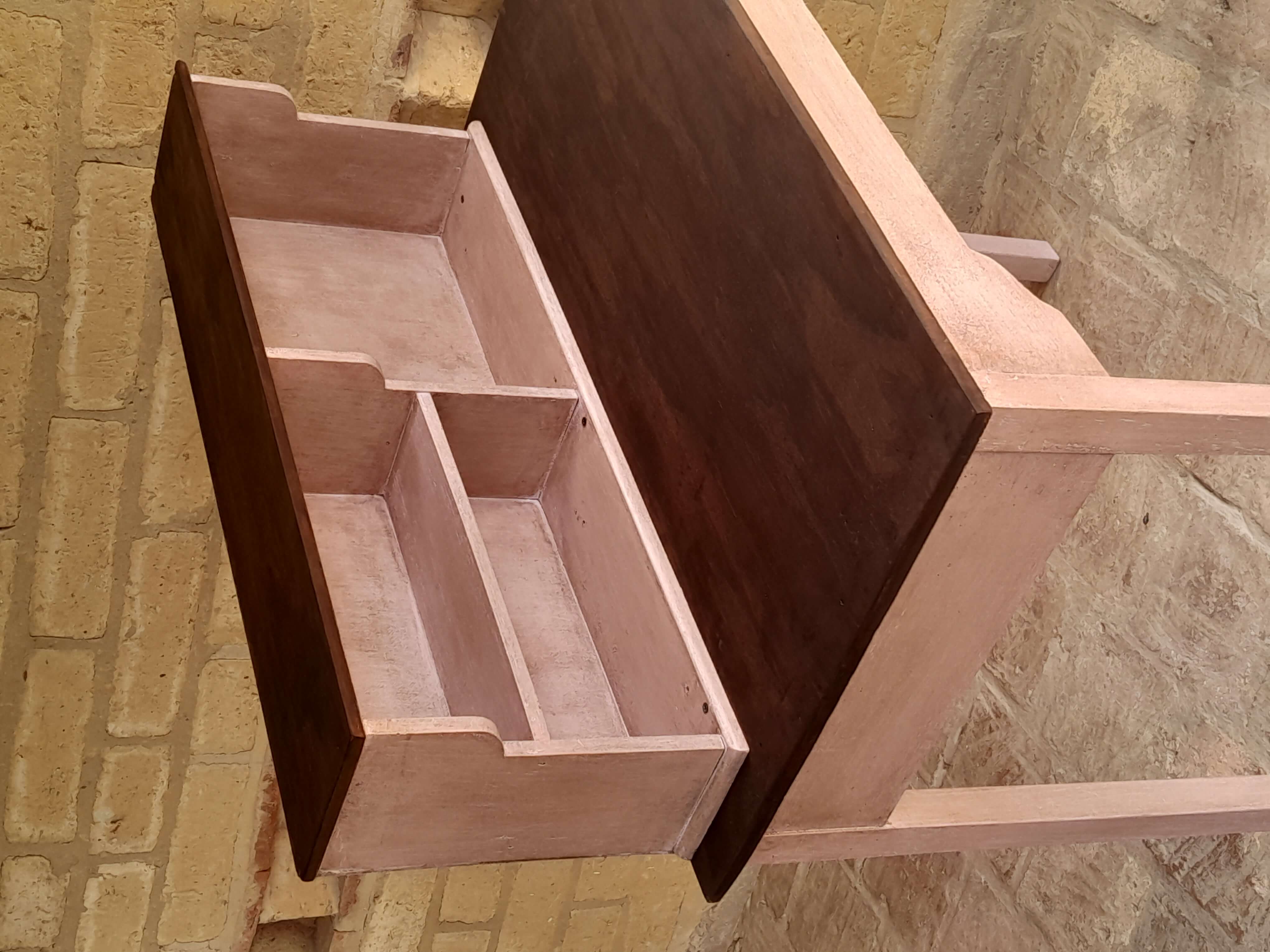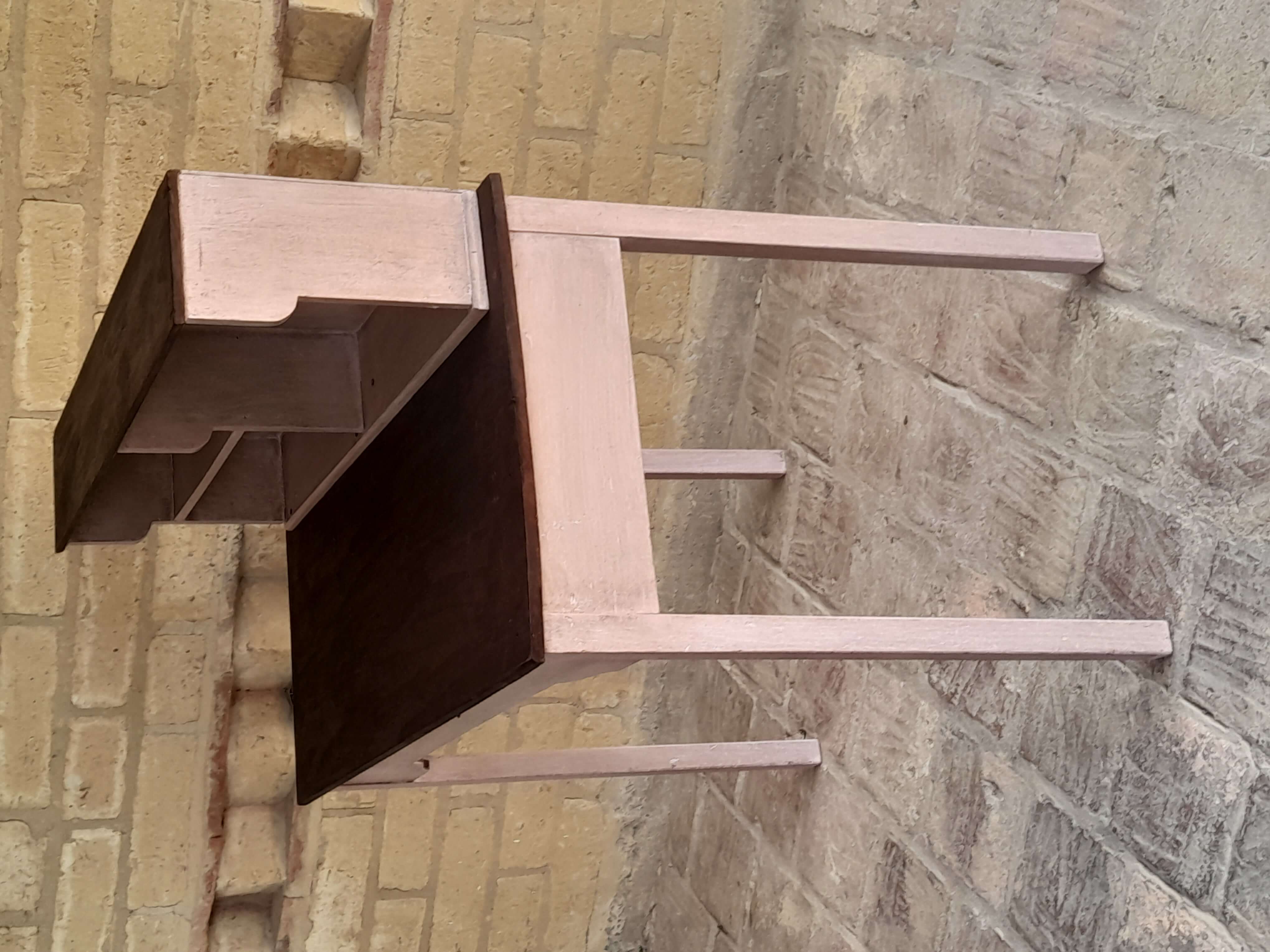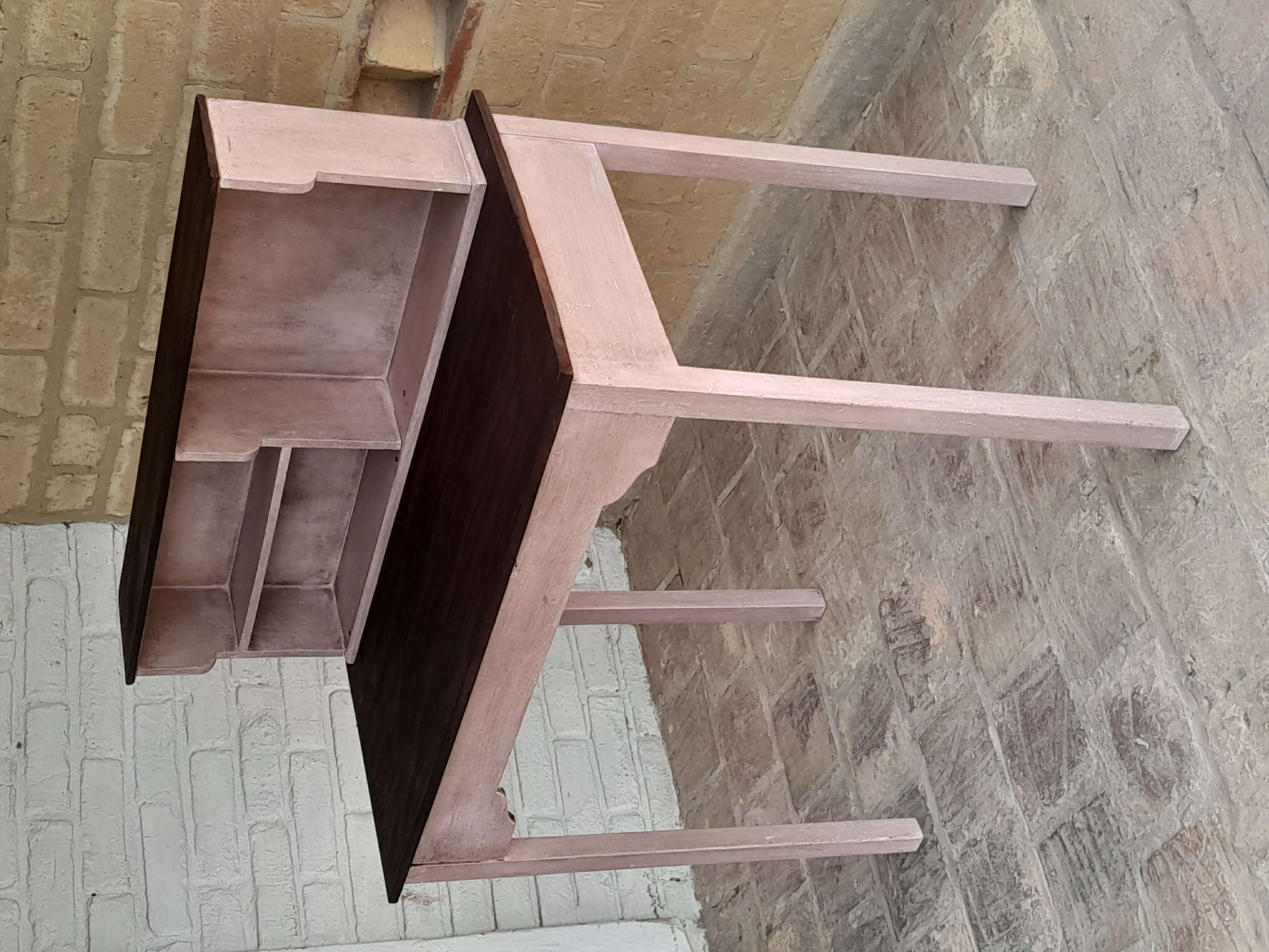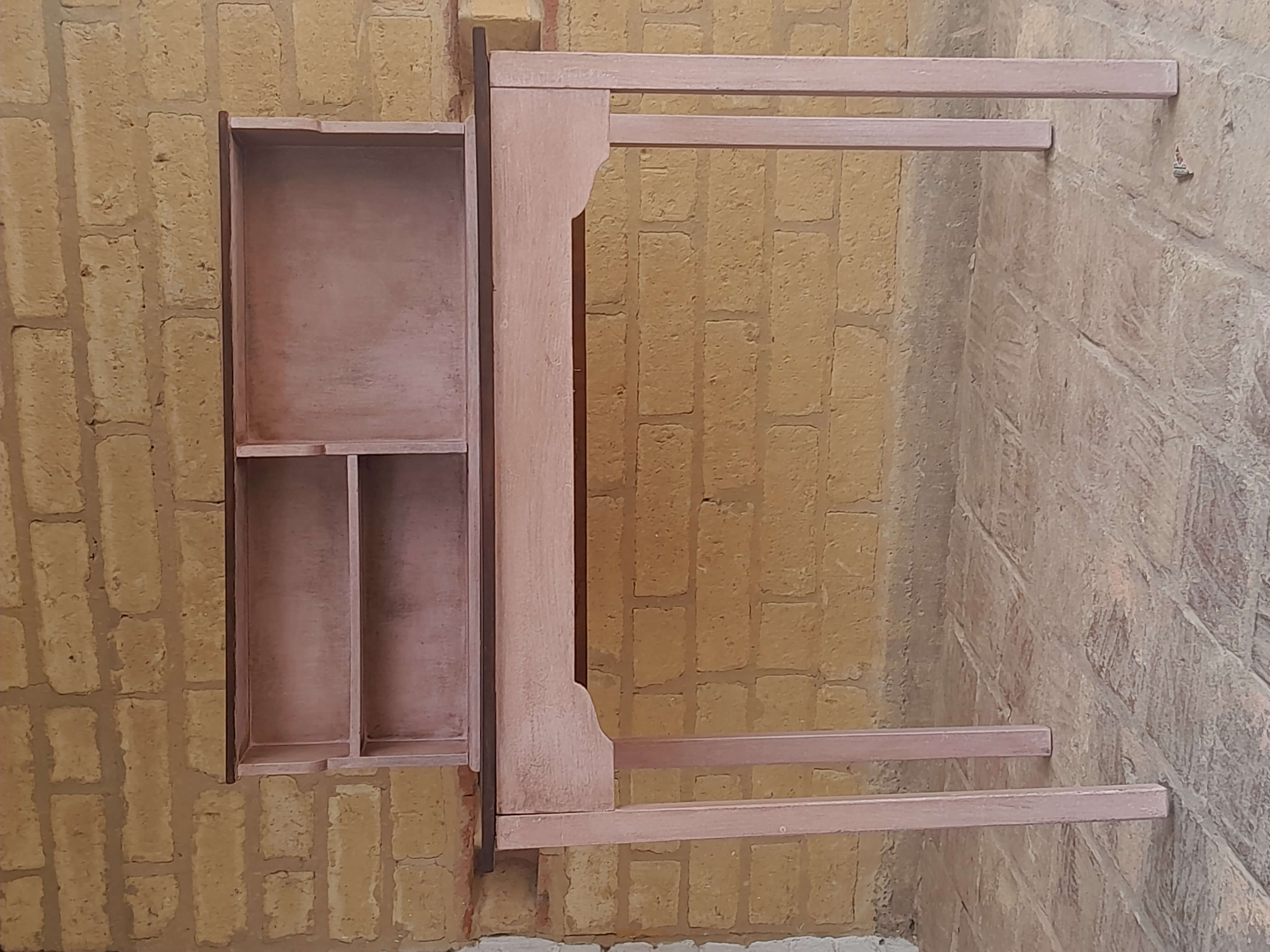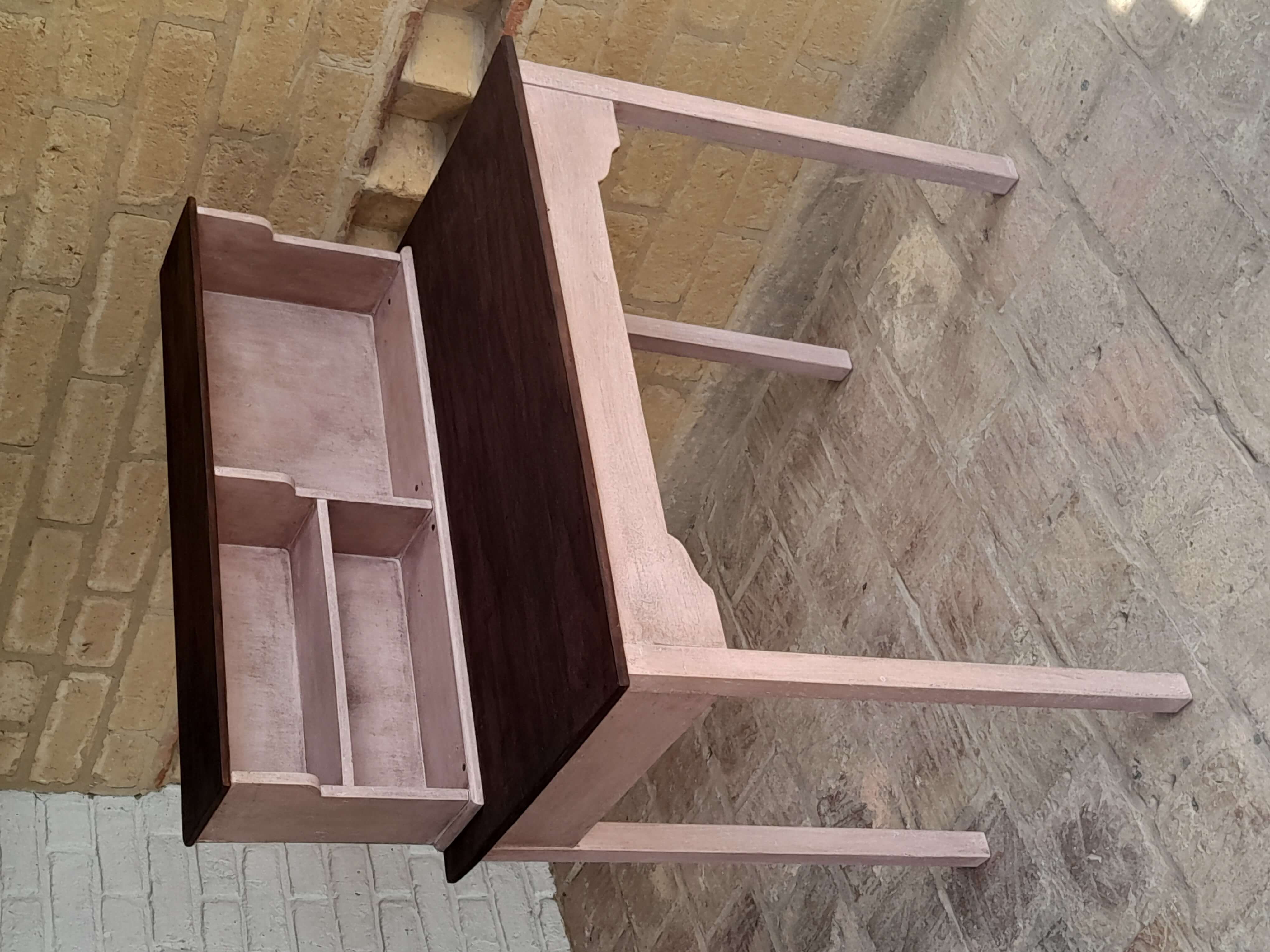 Mesa de madera rústica decorada en color rosa y superficies con madera a la vista, tiene una repisa en la superficie. Se puede utilizar como escritorio o mesa de taller.