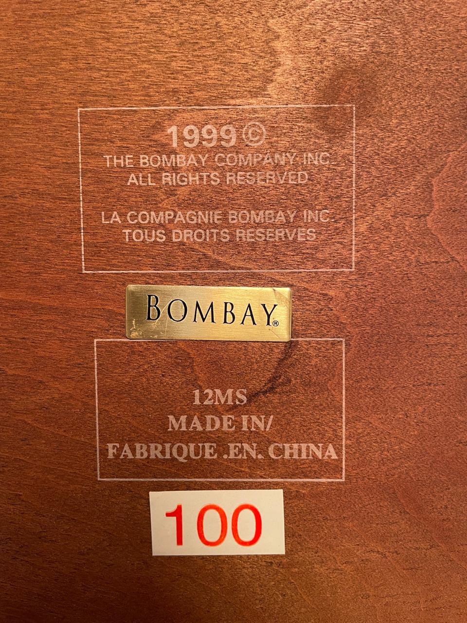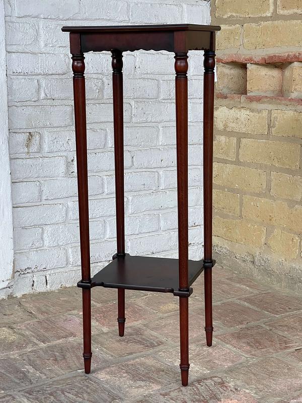 Mesa auxiliar cuadrada de madera, tiene dos niveles y patas torneadas. Mesa estable, sus partes se pueden desarmar y armar facilmente. Diseñada en U.S.A. y fabricada en China para la marca Estadounidense The Bombay Company, Nueva York, reconocida por ofrecer muebles contemporáneos de calidad. Se eucuentra en buen estado con algunas rayaduras en superficie superior
