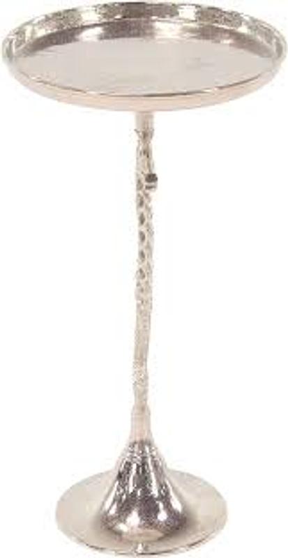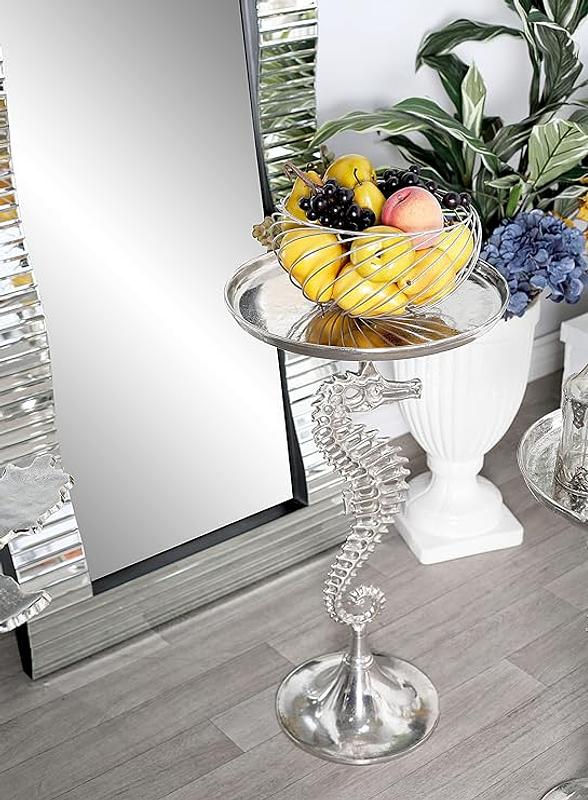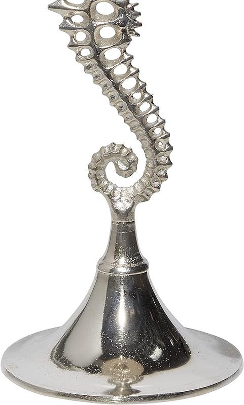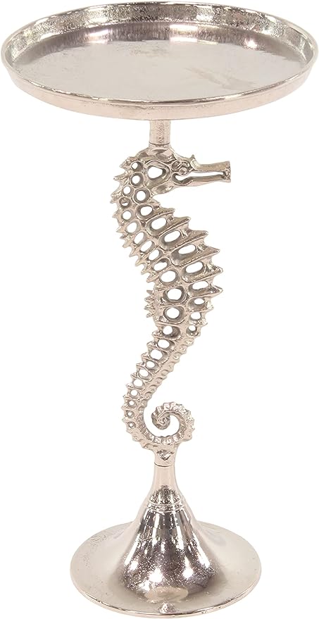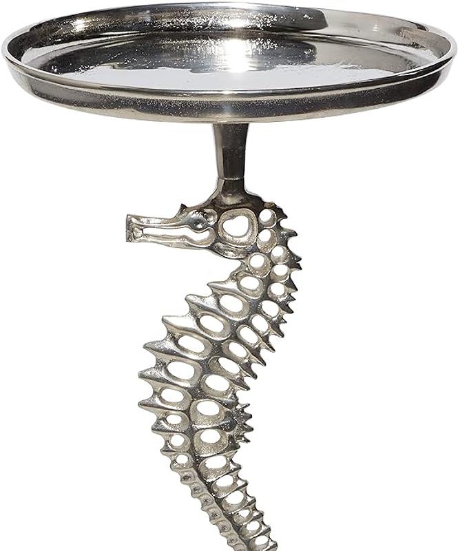 Mesa en aluminio fundido compuesta por 3 piezas atornillables que se pueden desarmar, la bandeja superior se apoya en una pata con forma de caballito de mar sostenido en un pedestal cónico.