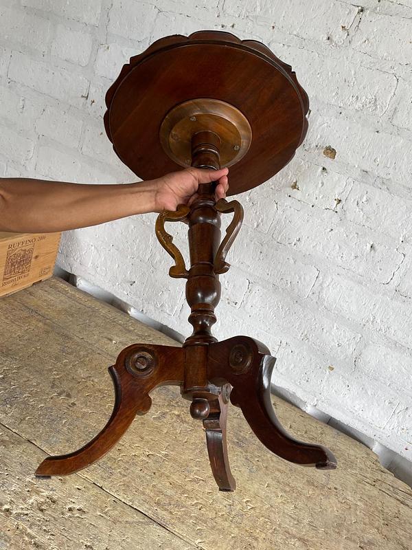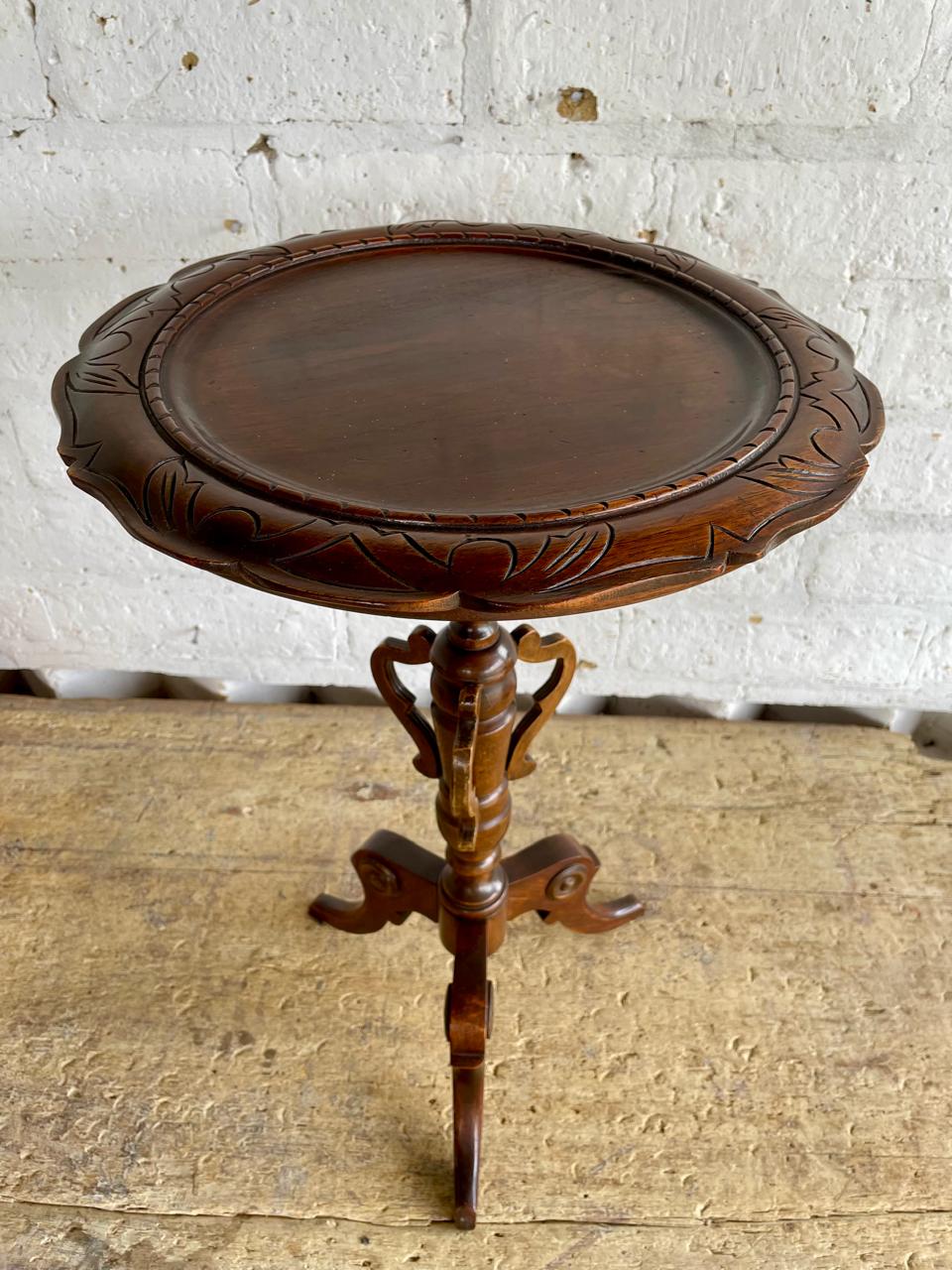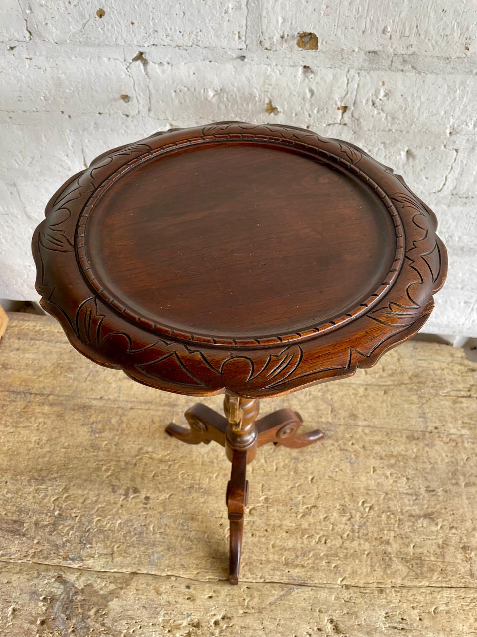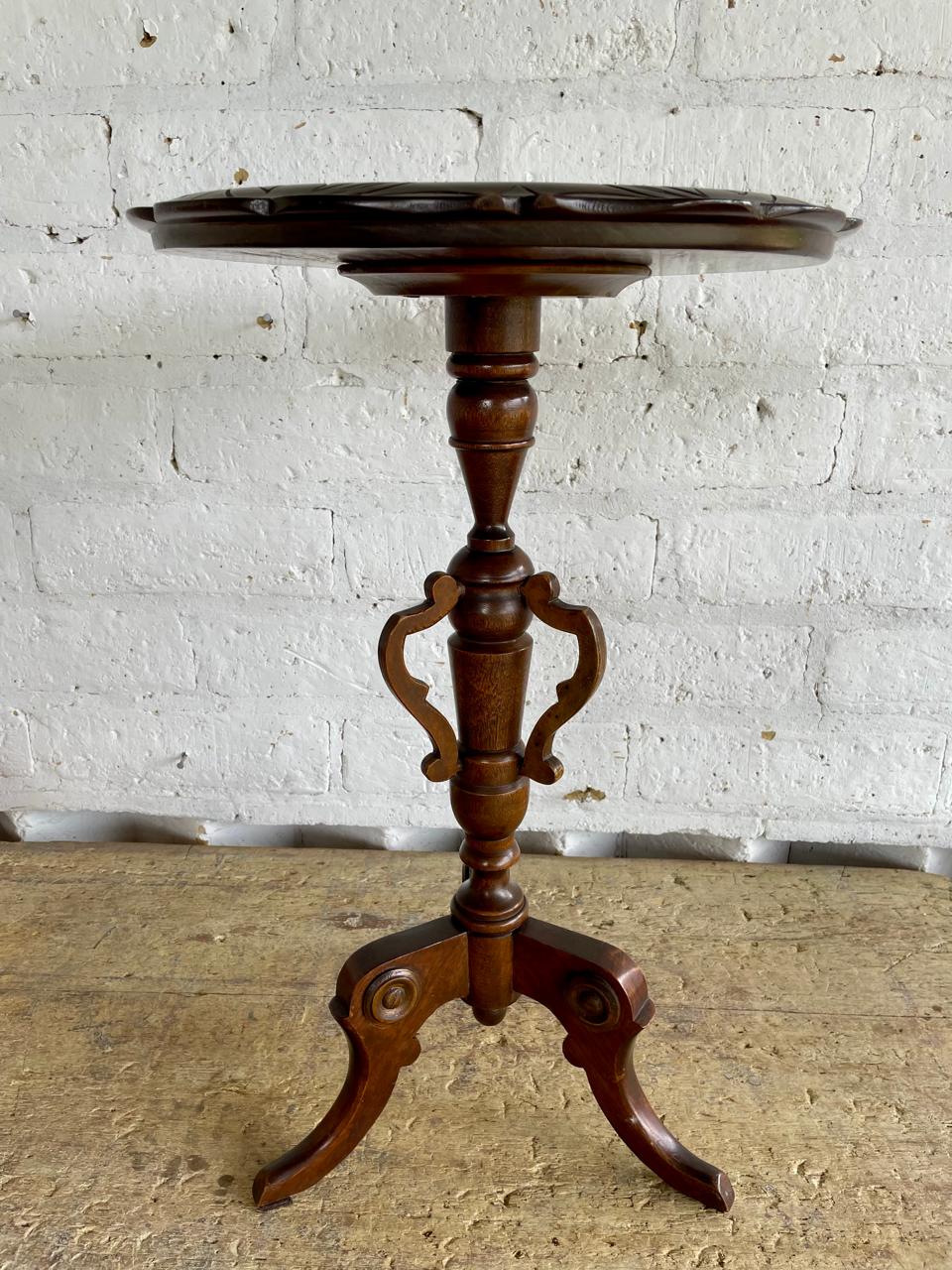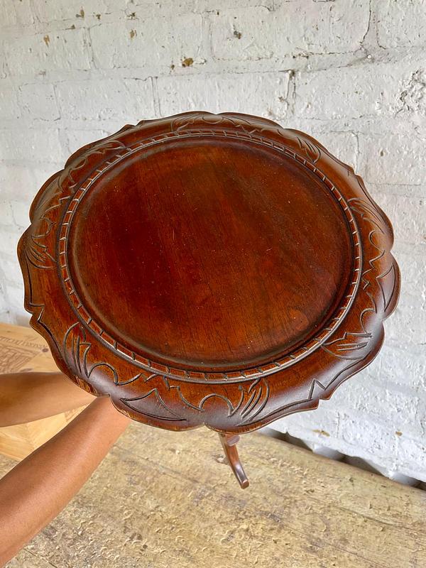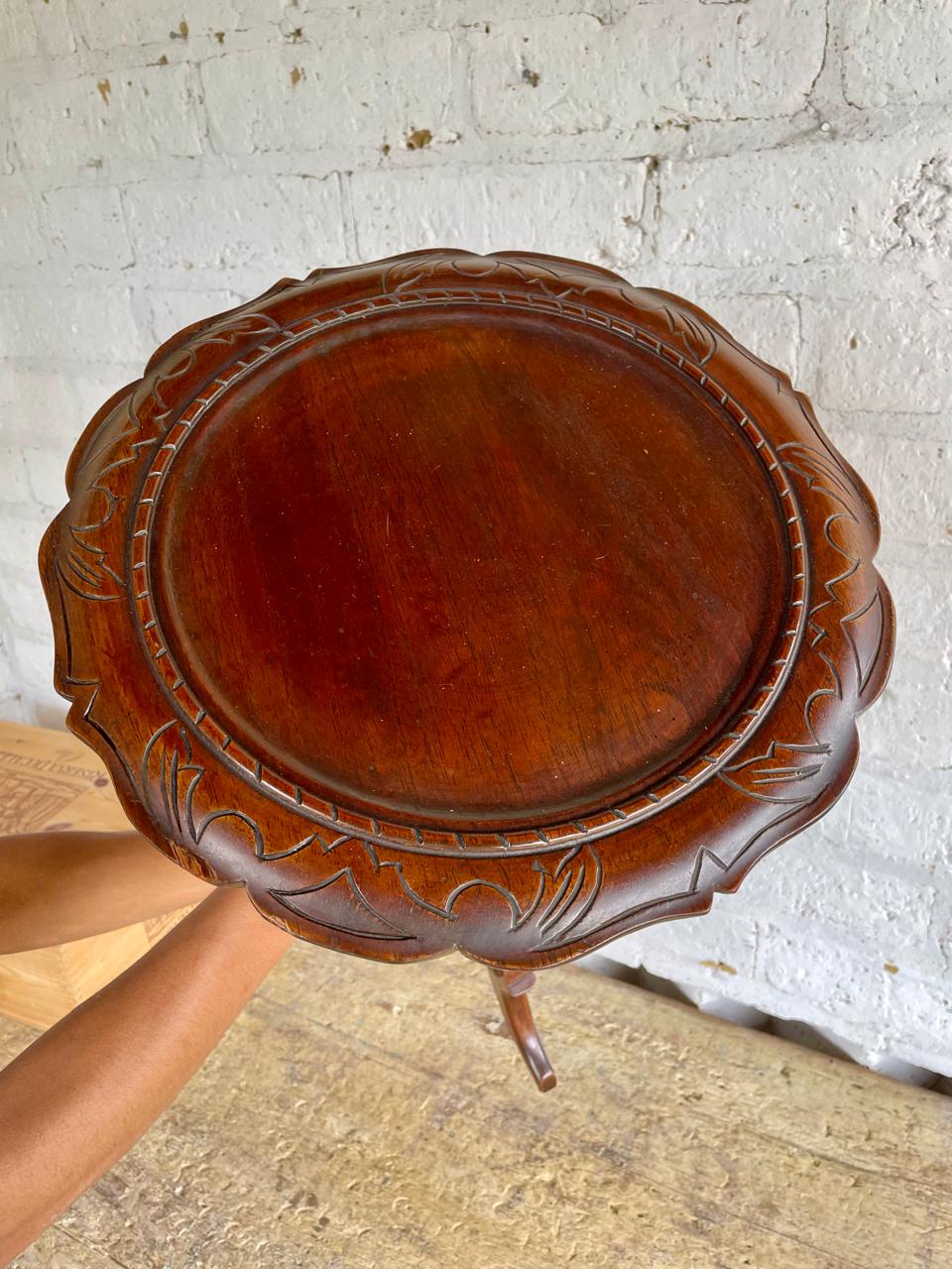 Mesa auxiliar de caoba elaborada por artesanos Colombianos en los años cuarenta, de estilo victoriano con reborde tallado en la encimera, soporte torneado y estriado, patas trípodes talladas.