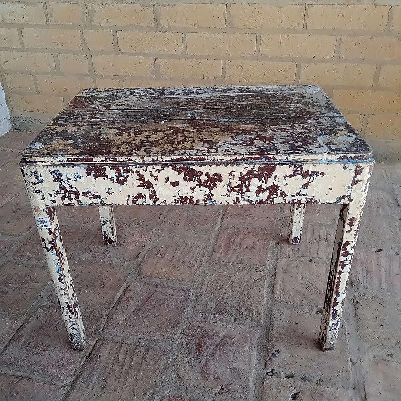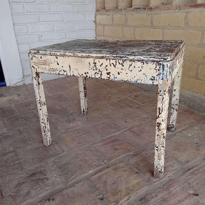Pequeña mesa vintage conserva la pintura original. La superficie está formada por 3 tablas, entre cada tabla tiene un pequeño espacio.