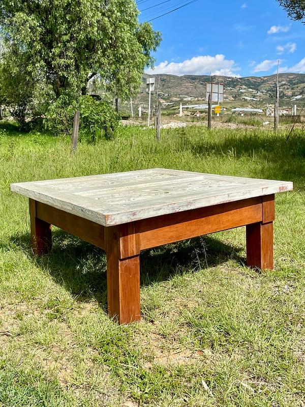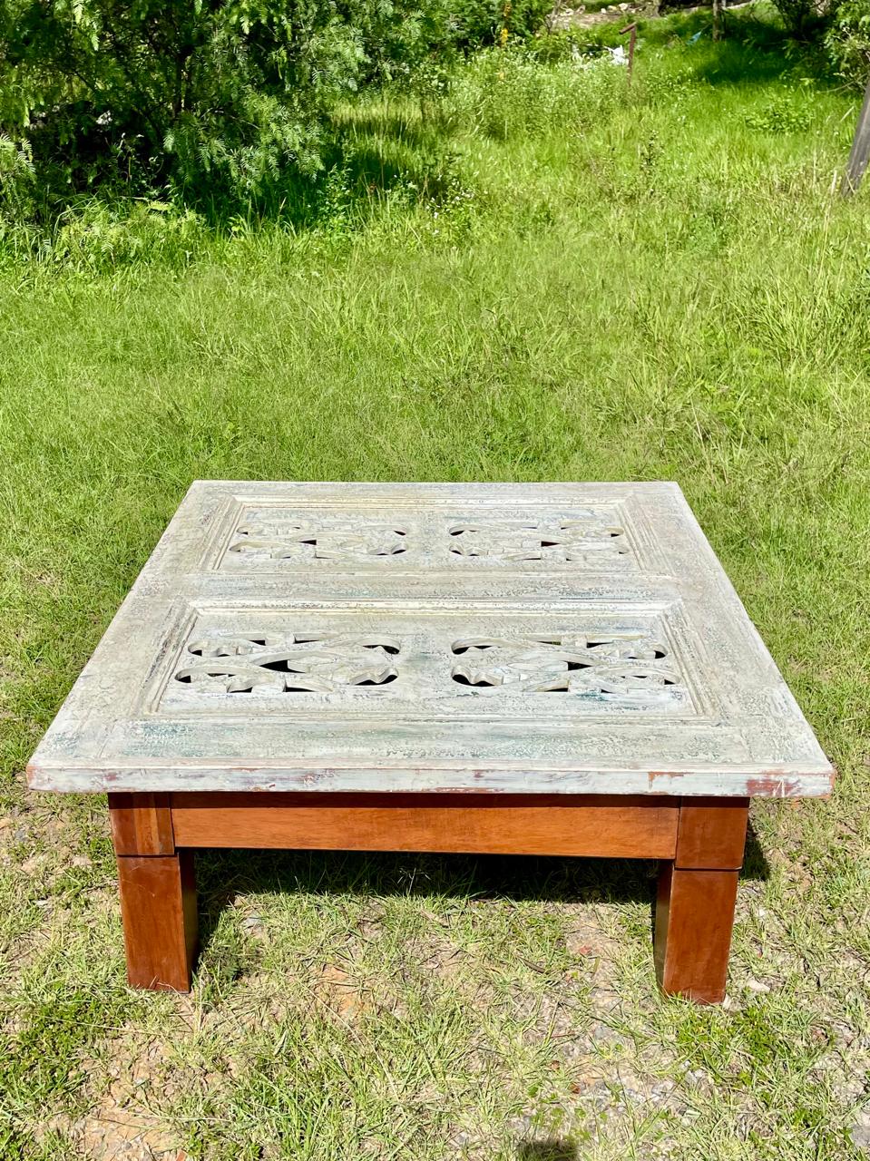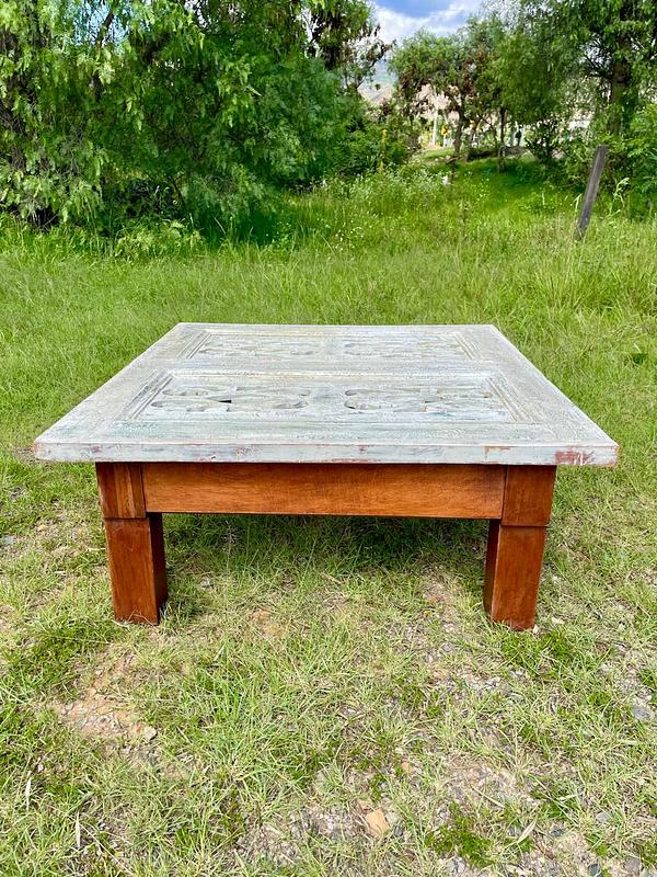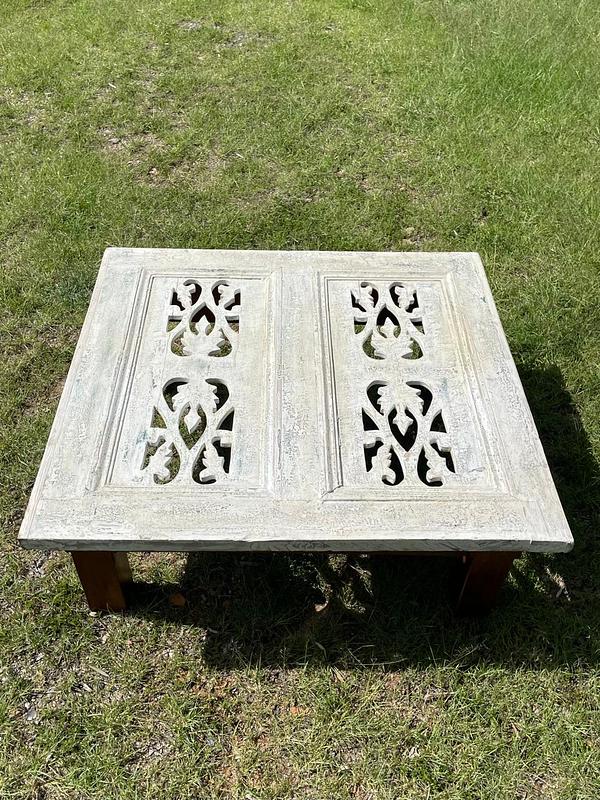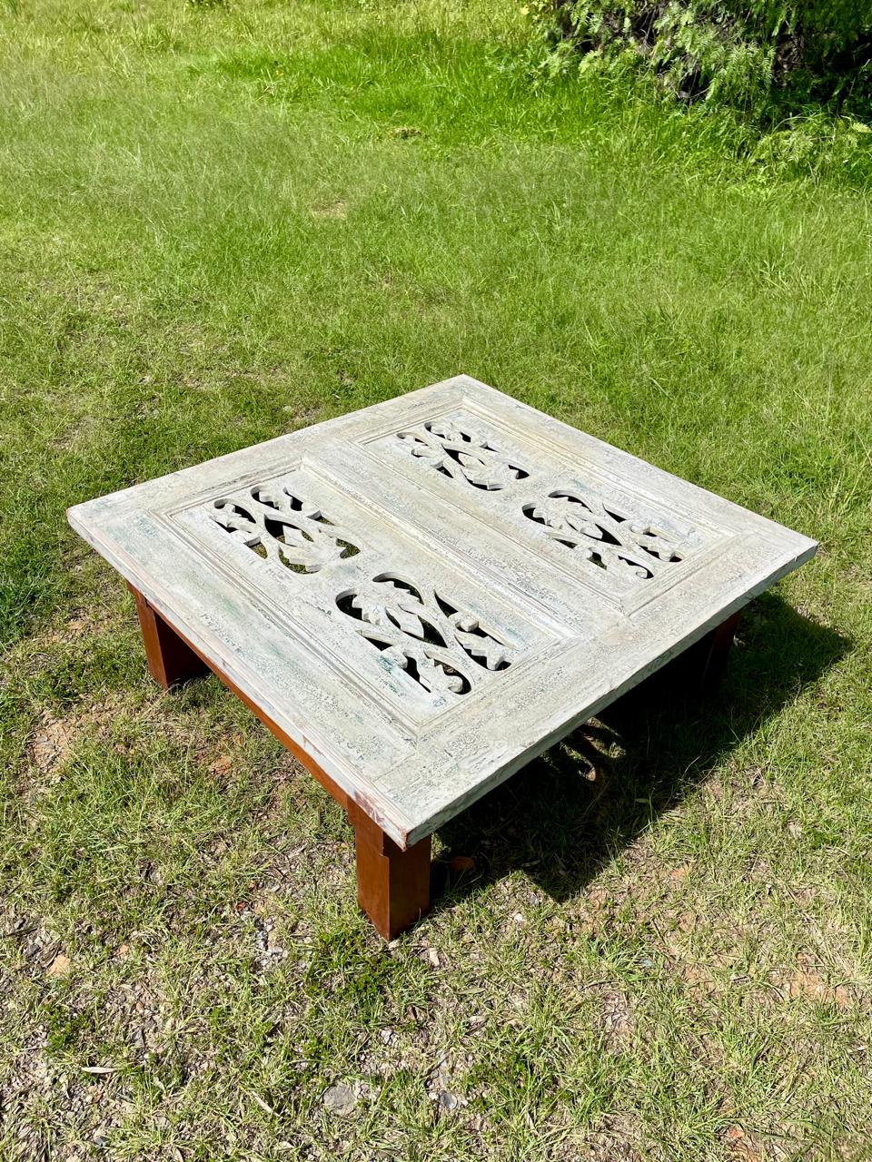 Mesa armada con una ventana de madera calada antigua recuperada, las patas son de madera maciza. Armada en el taller de la tienda. La superficie está decorada con pintura desgastada.