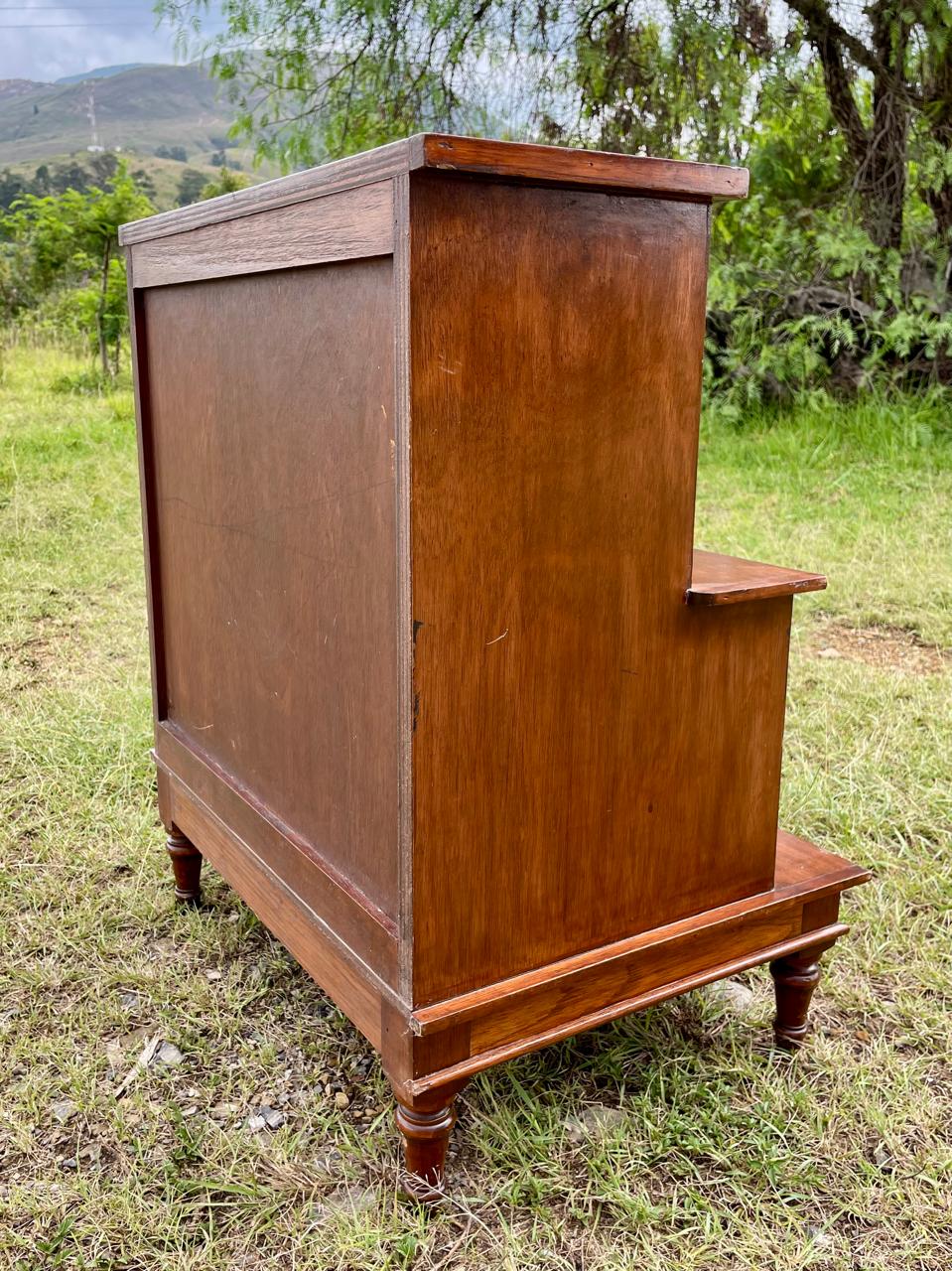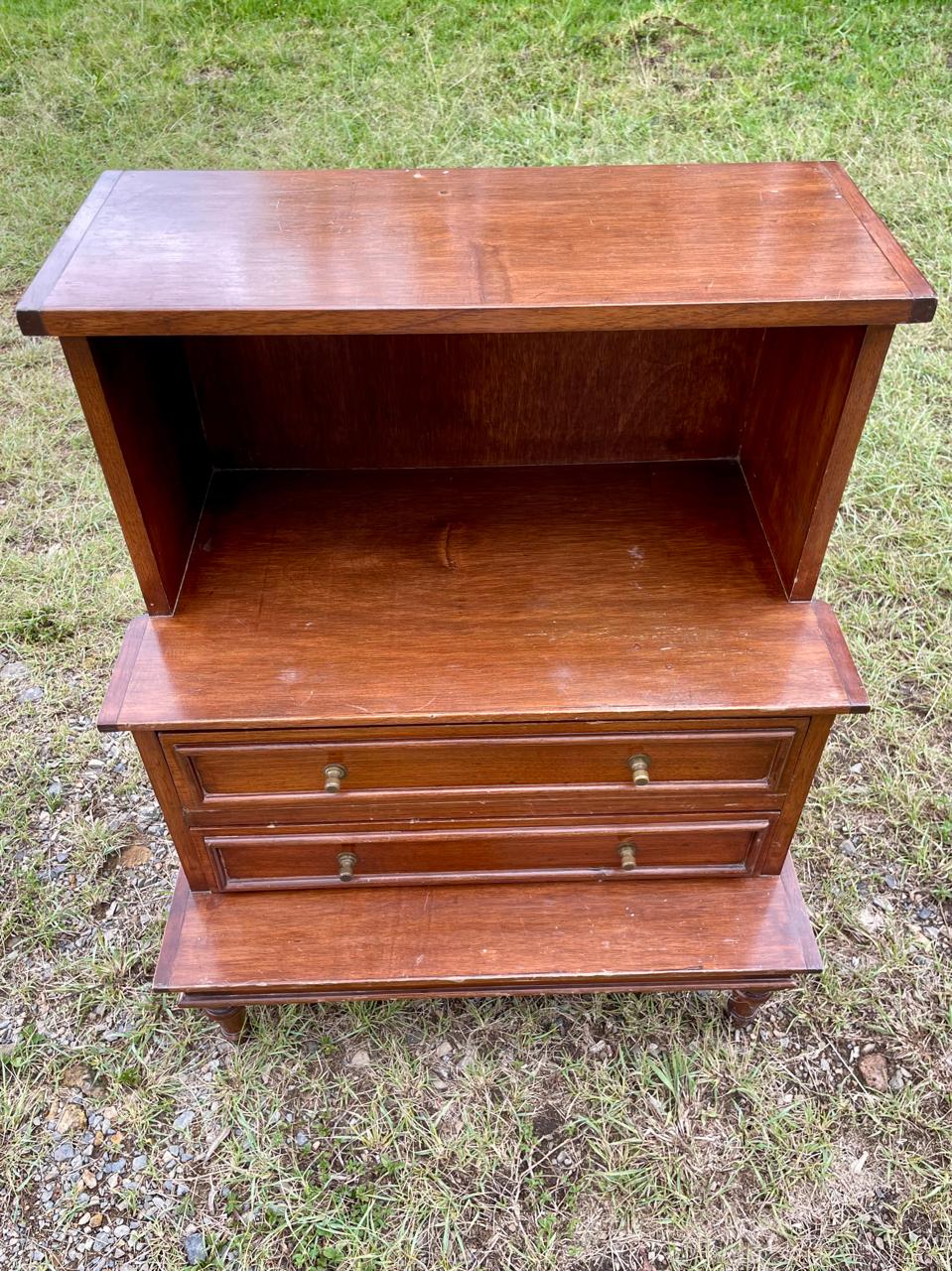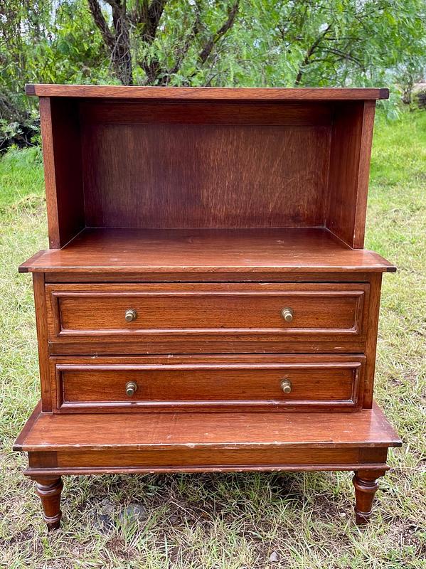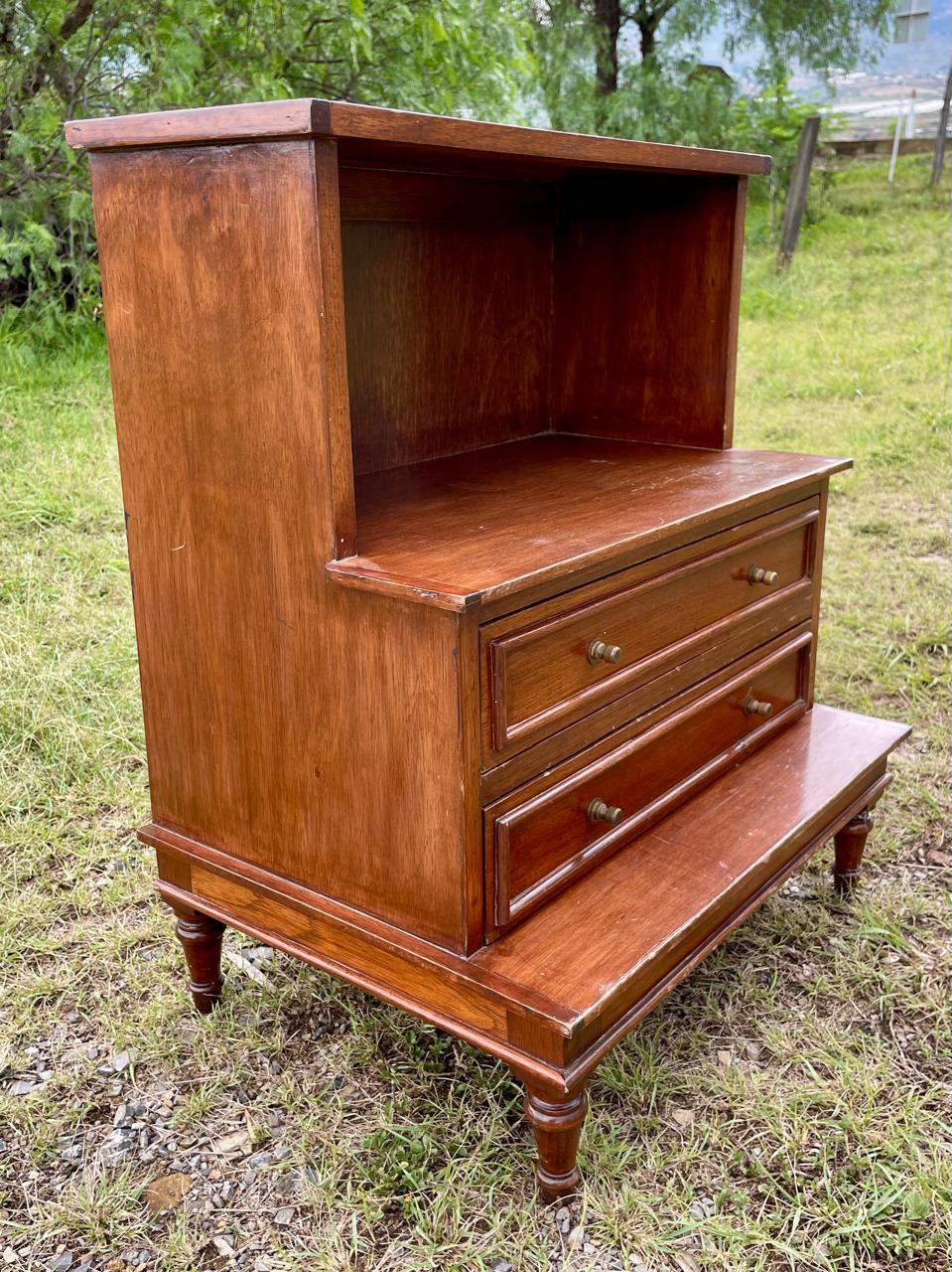 Mesa de noche en escalera de madera maciza con respaldar de triplex elaborada en Colombia en la década de los ochenta, al centro tiene dos cajones con perillas de bronce. Hay dos unidades disponibles. Se encuentran en buen estado con desgastes en la pintura.