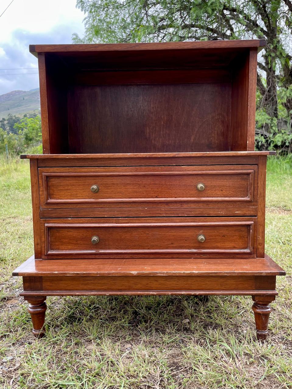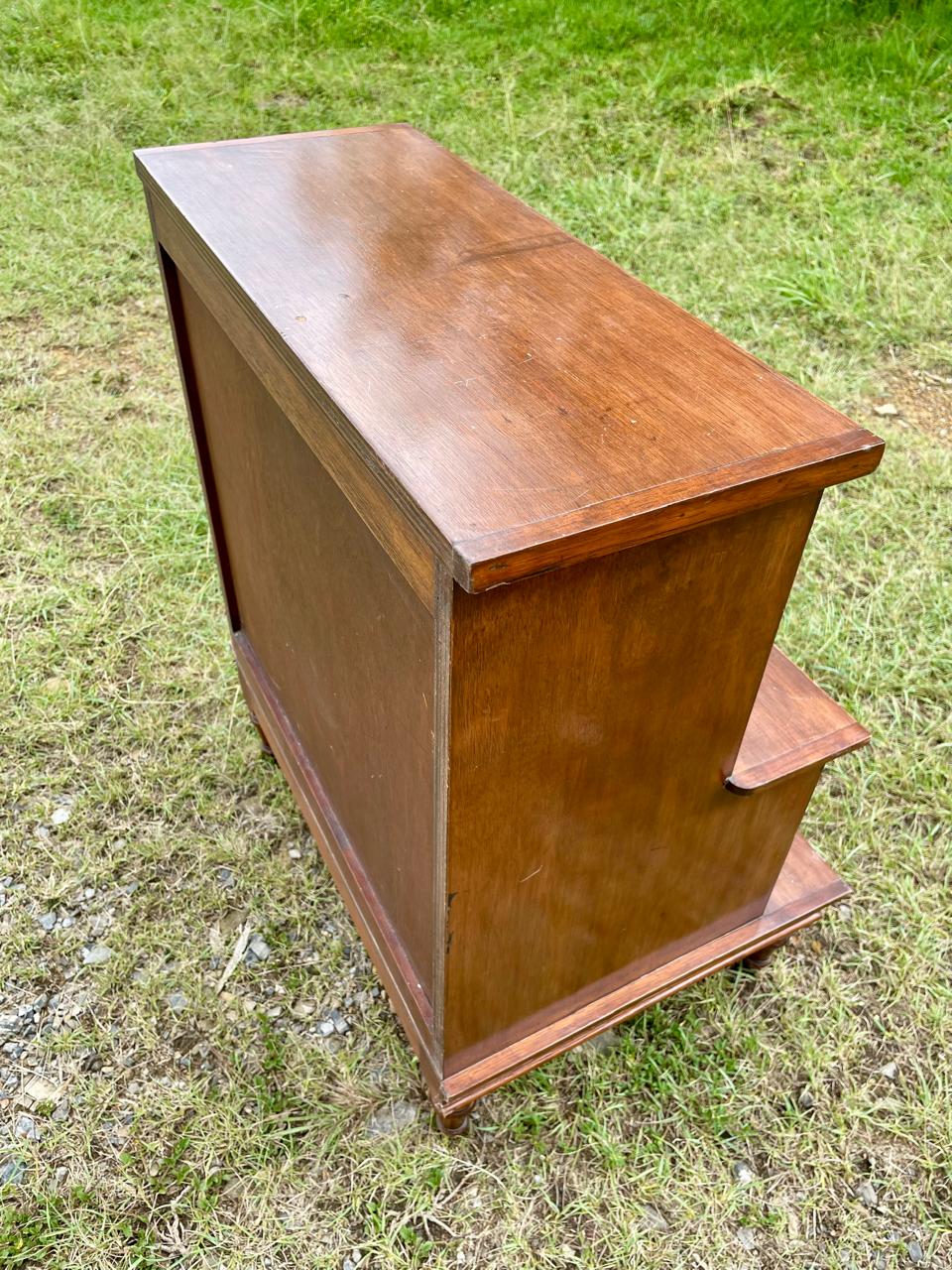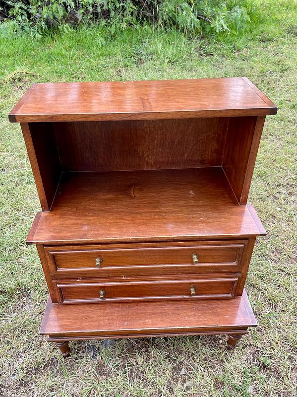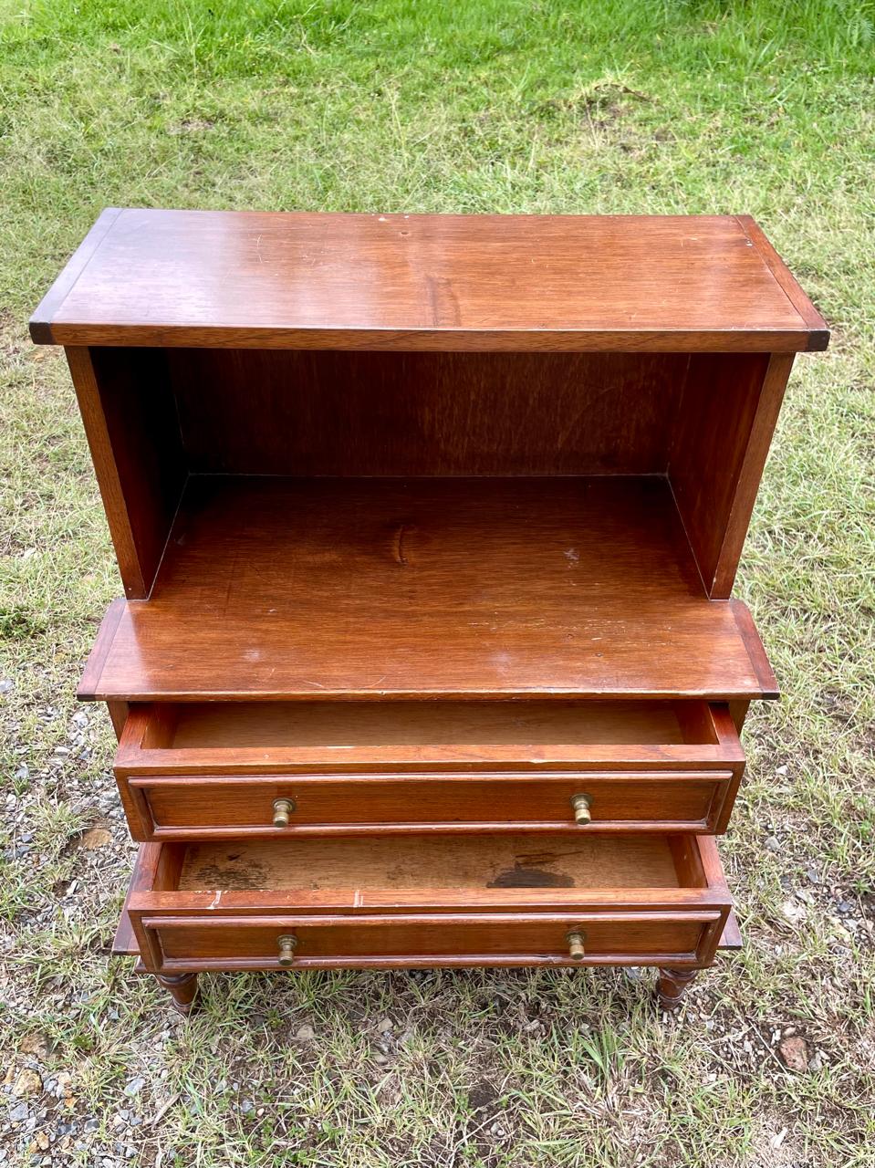 Mesa de noche en escalera de madera maciza con respaldar de triplex elaborada en Colombia en la década de los ochenta, al centro tiene dos cajones con perillas de bronce. Hay dos unidades disponibles. Se encuentran en buen estado con desgastes en la pintura.
