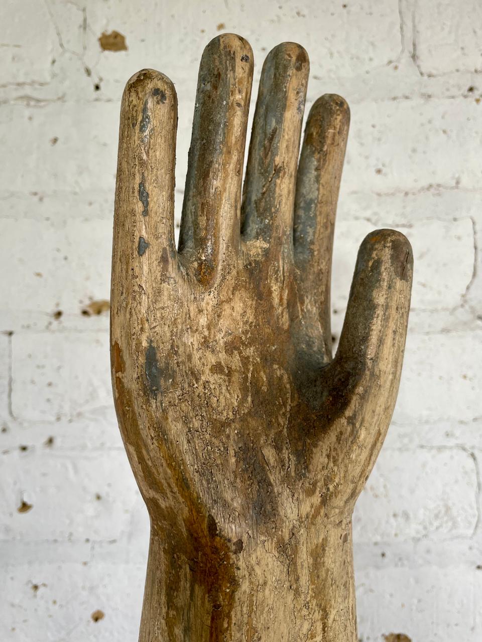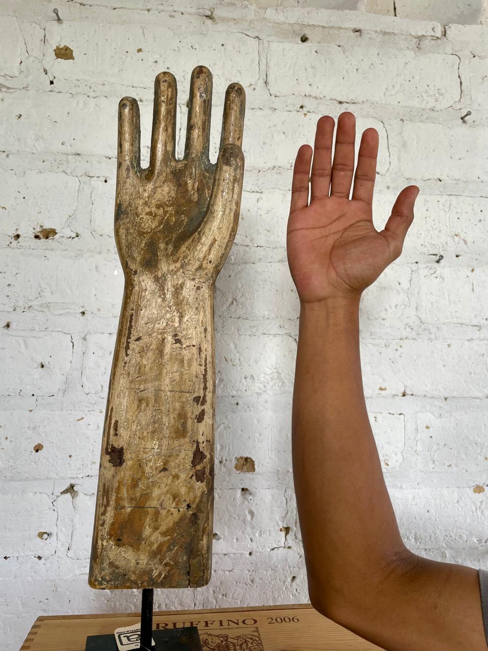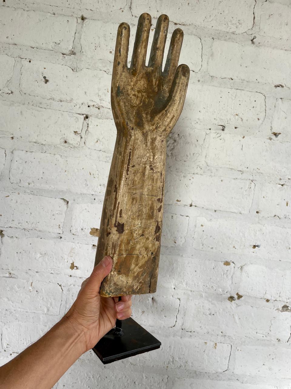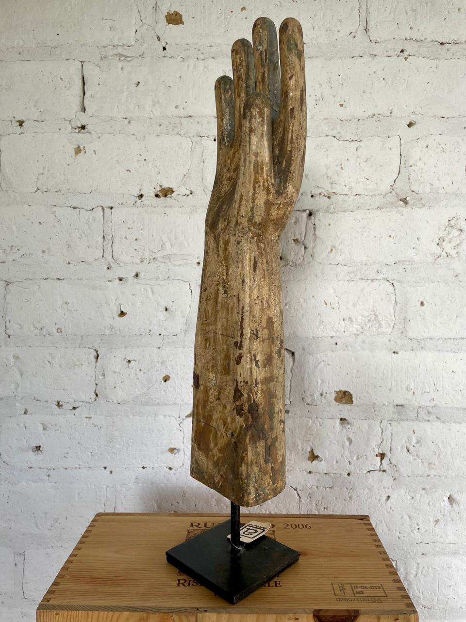 Mano tallada en madera utilizada a principios del S XX, en U.S.A. como molde para la fabricación de guantes de caucho; tiene base metálica.