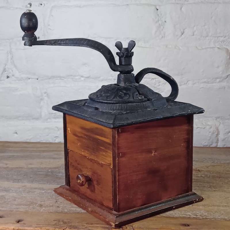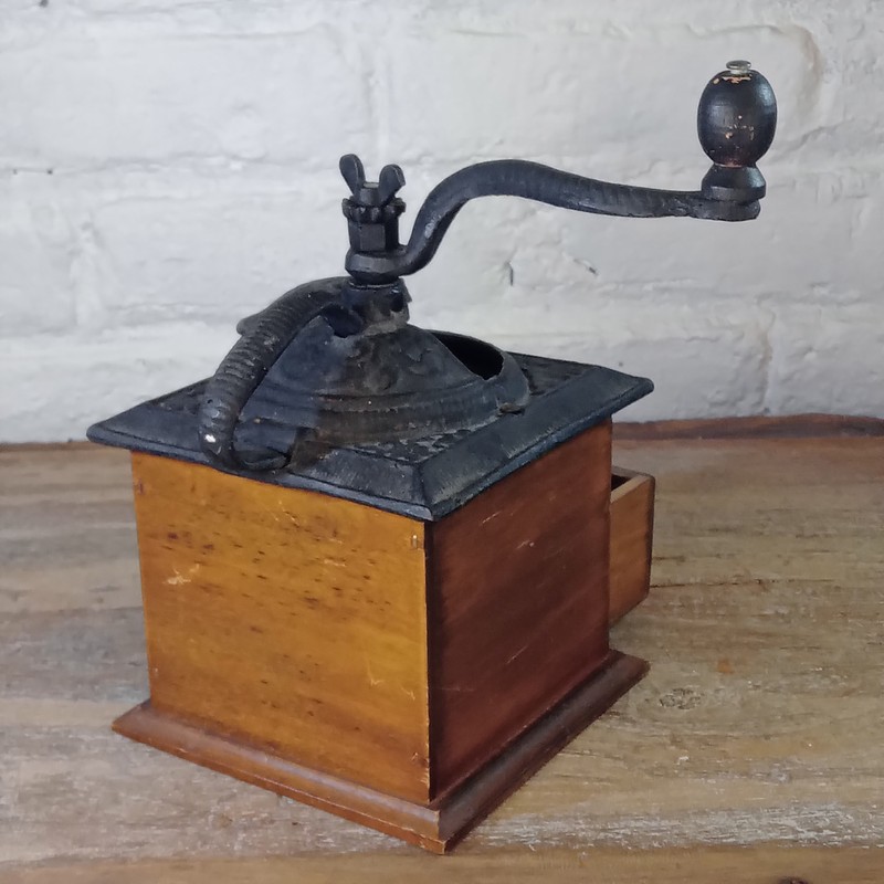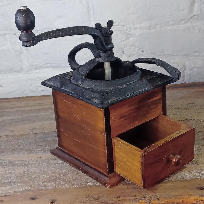 Molino de cafe vintage de caja en madera y manija en hierro, se encuentra funcionando.
