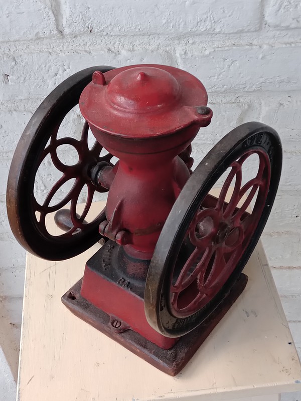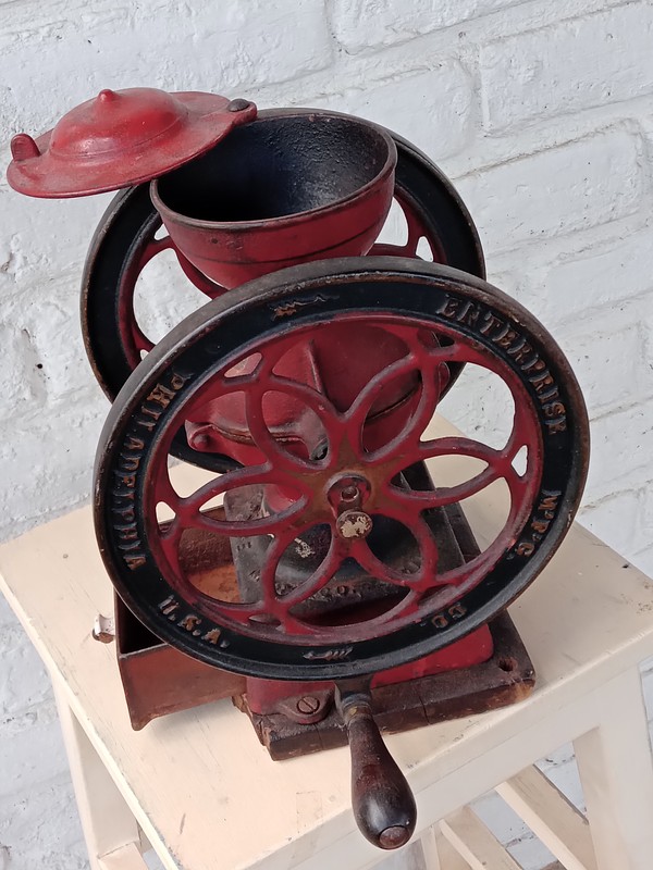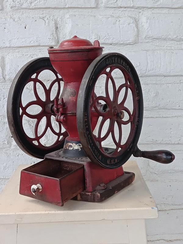 Fabricado en EE. UU. por Enterprise Manufacturing Company de Filadelfia en 1898, se utilizaba para moler café, huesos, cáscaras, maíz, raíces, corteza y granos para aves.