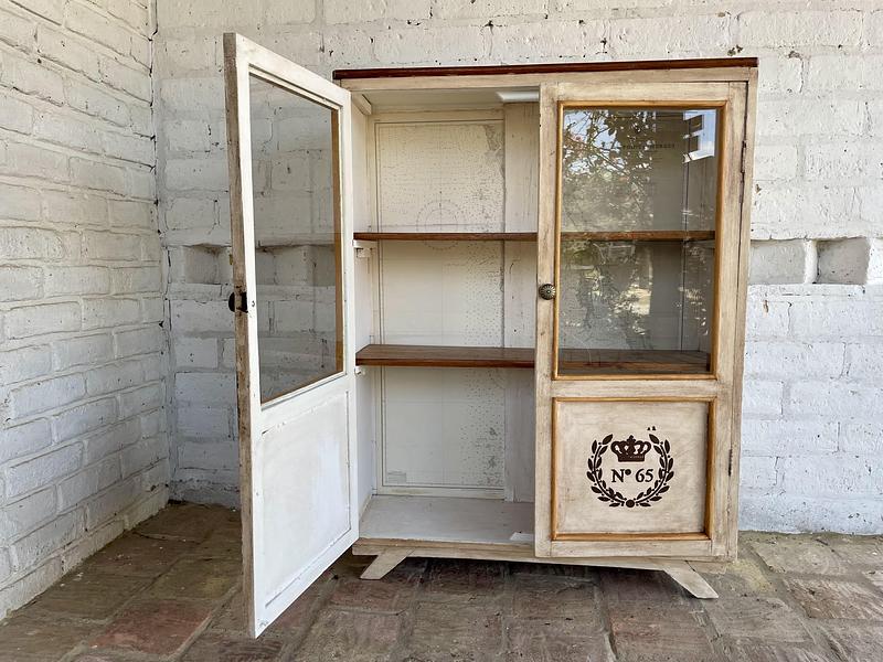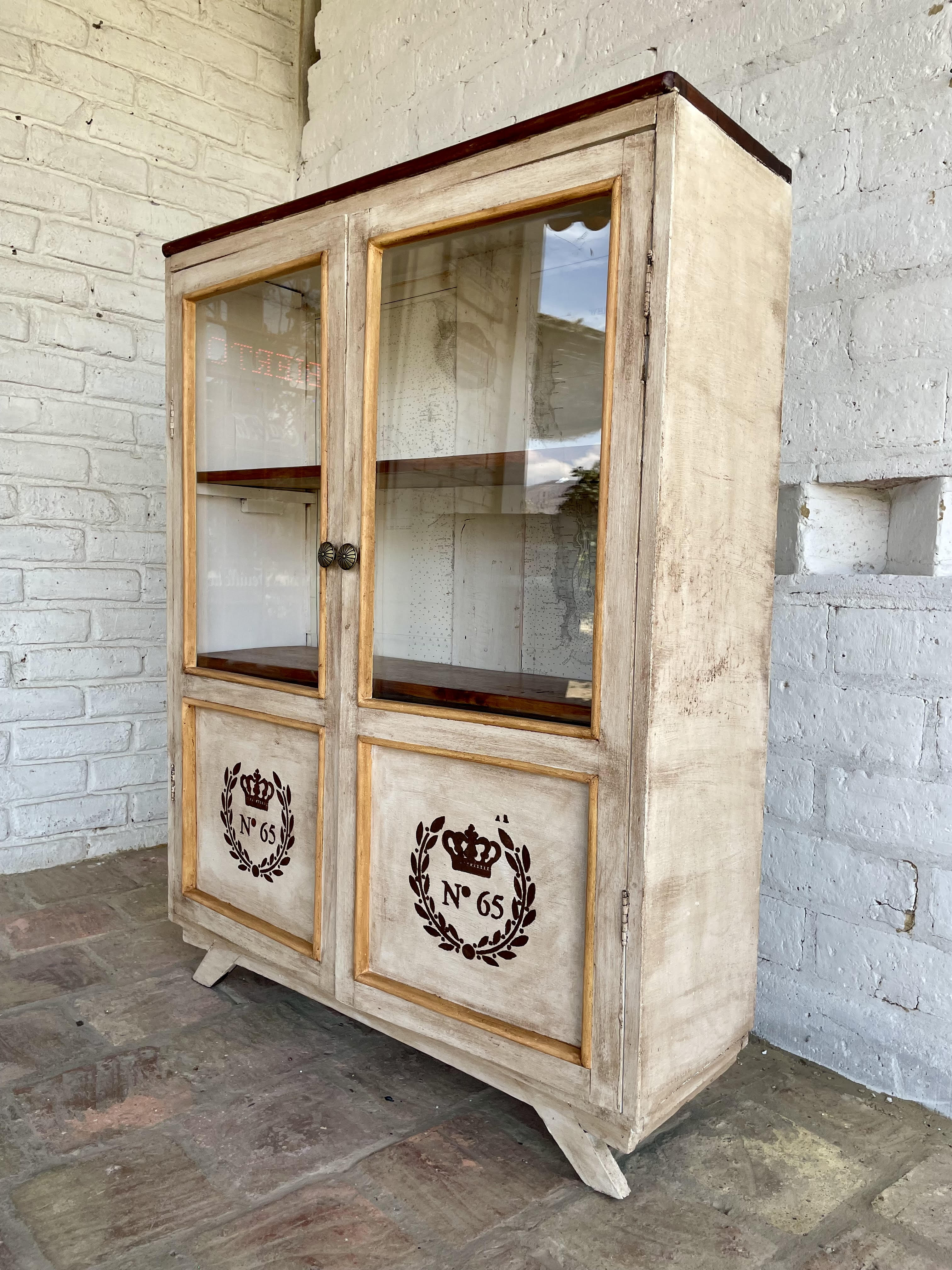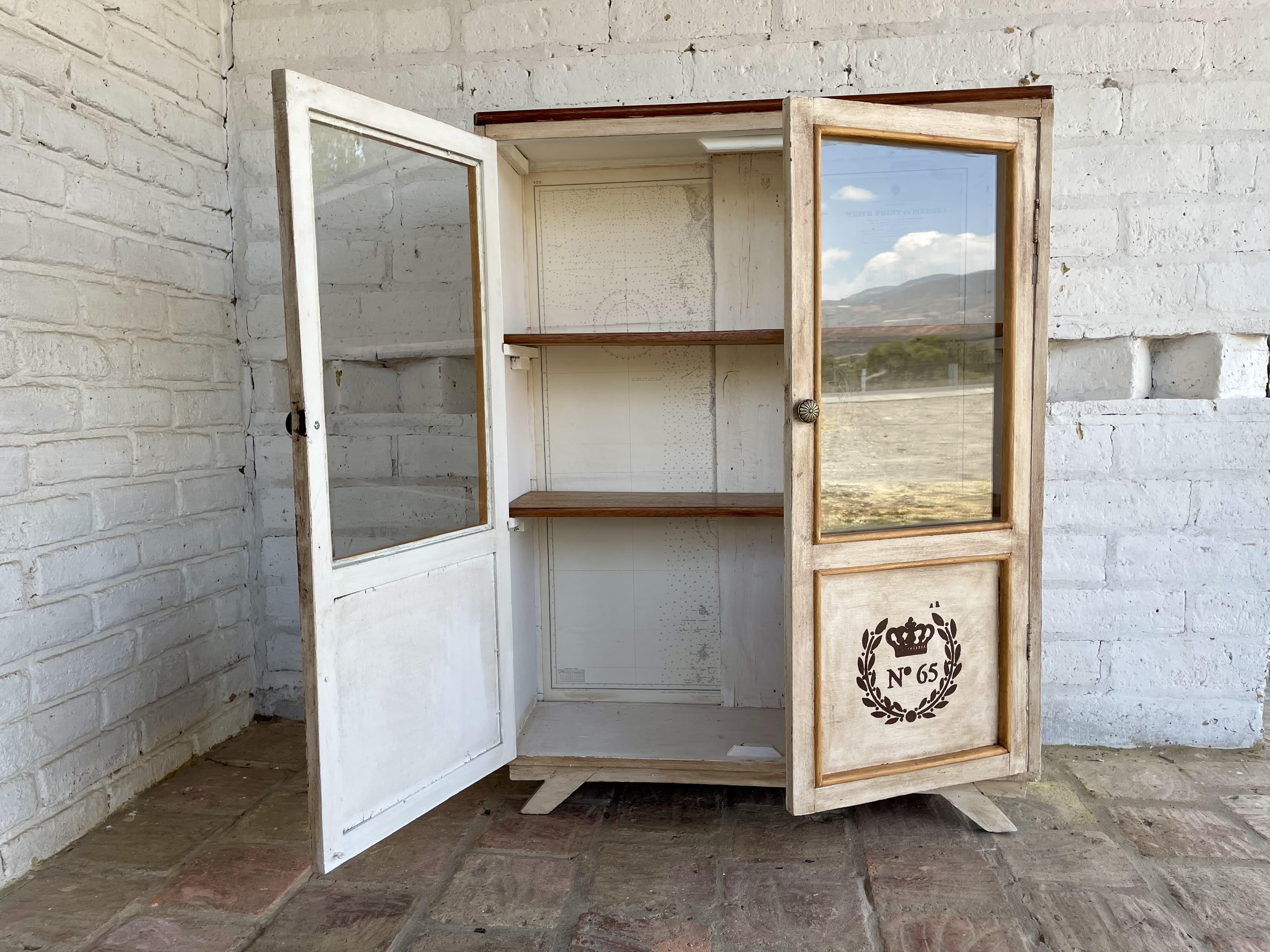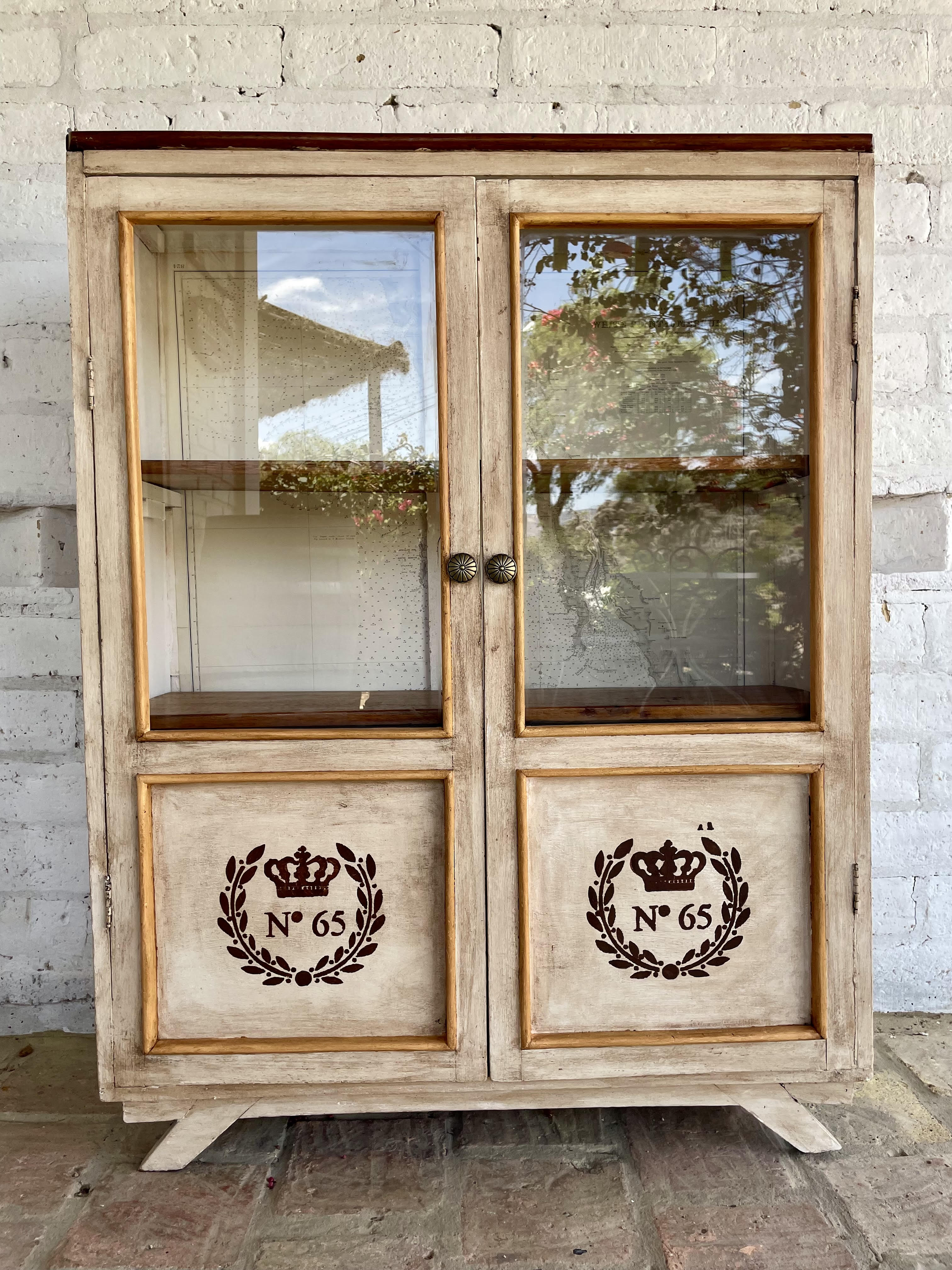 Vintrina vintage de madera con 2 entrepaños y puertas con vidrio.