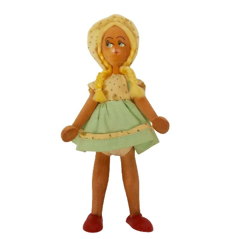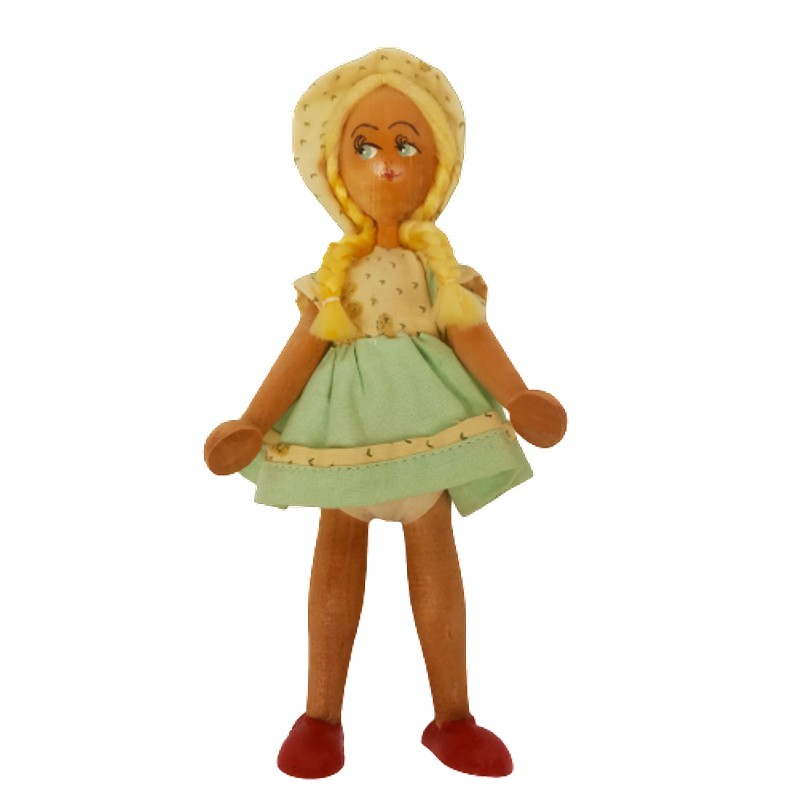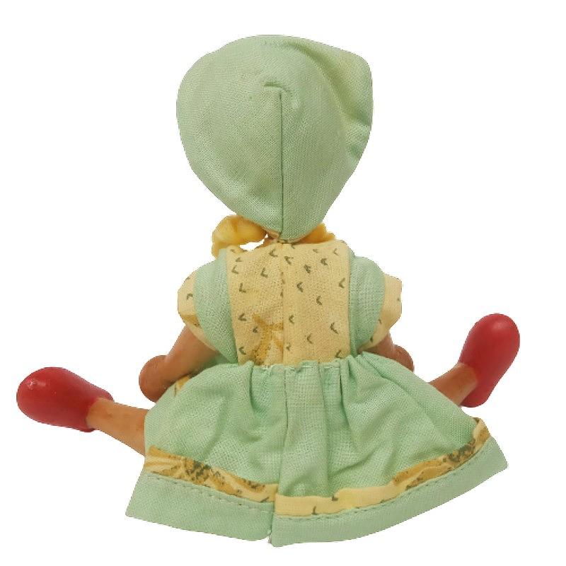 Muñeca artesanal vintage polaca, pintada a mano, en madera articulada, vestido de tela y pelo en lana.