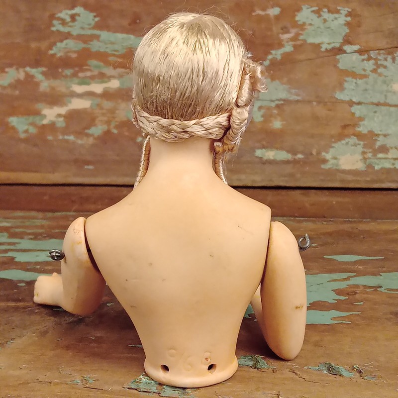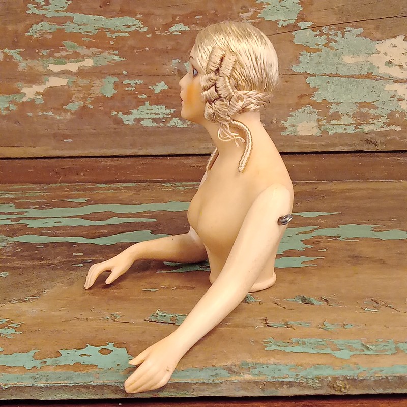 Busto de muñeca de vestir estilo art deco, porcelana biscuit y cabello de seda. Los brazos son articulados y se pueden mover.