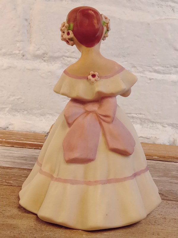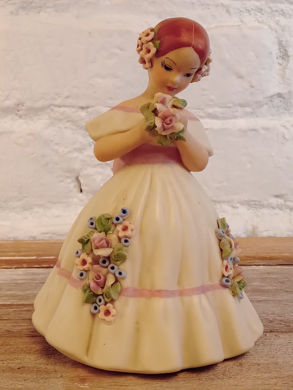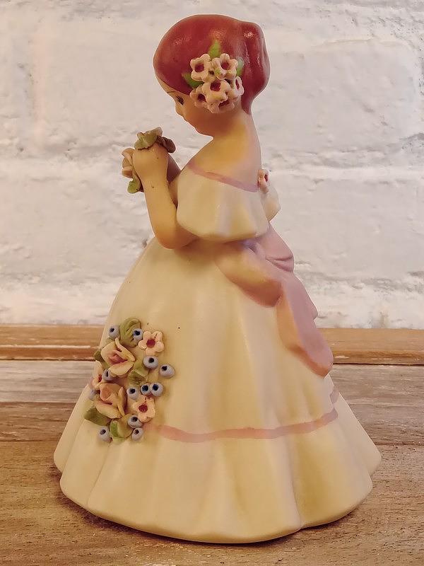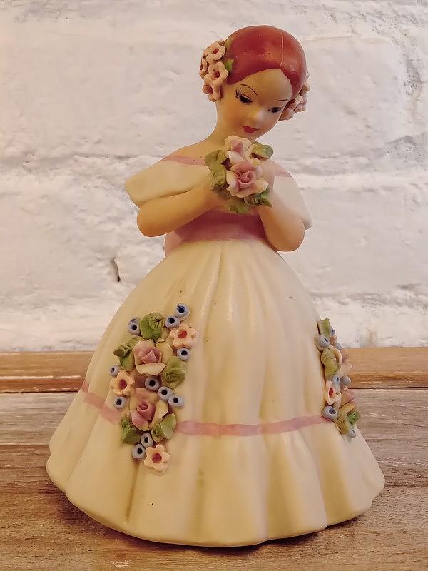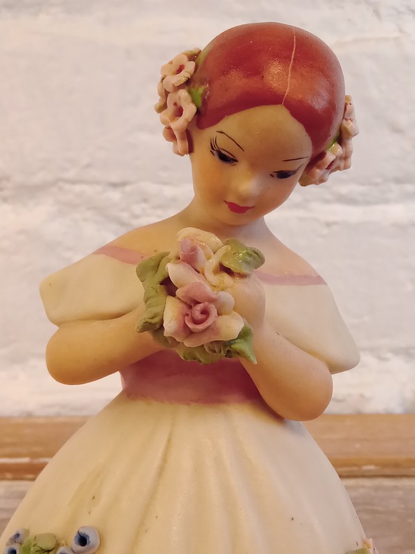 Muñeca vintage en porecelana decorada con apliques de flores. Tiene algunas desportilladuras en las flores.