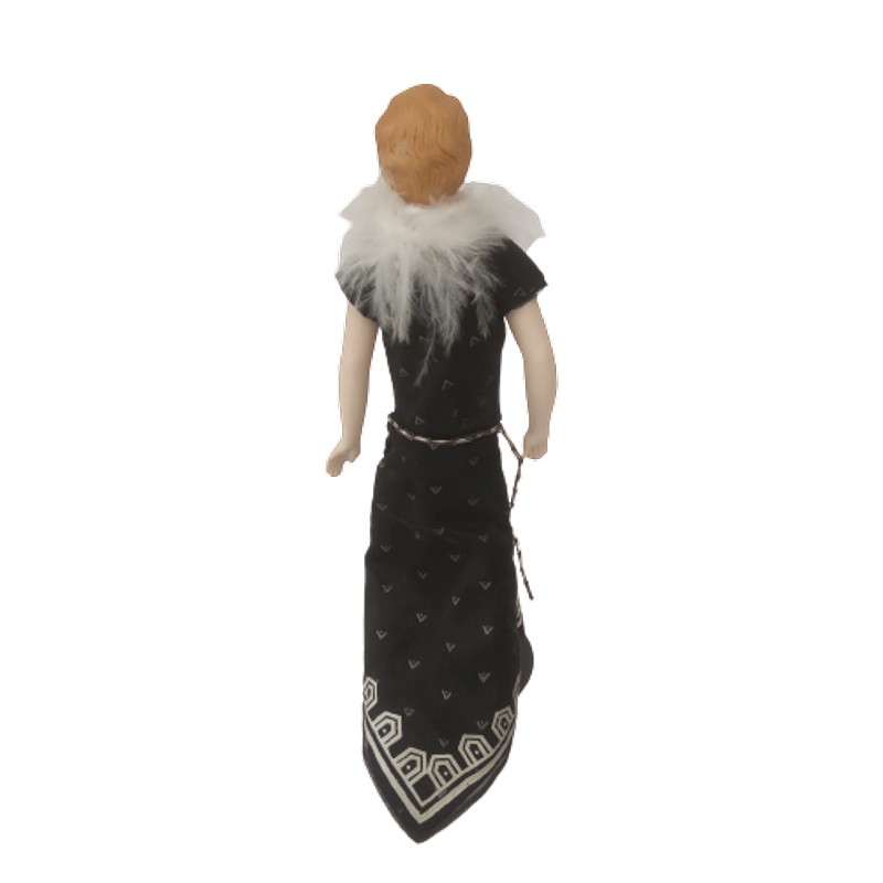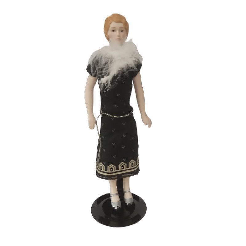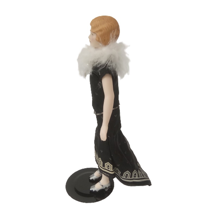 Muñeca de porcelana con vestido de cola en seda negra y cuello de plumas.