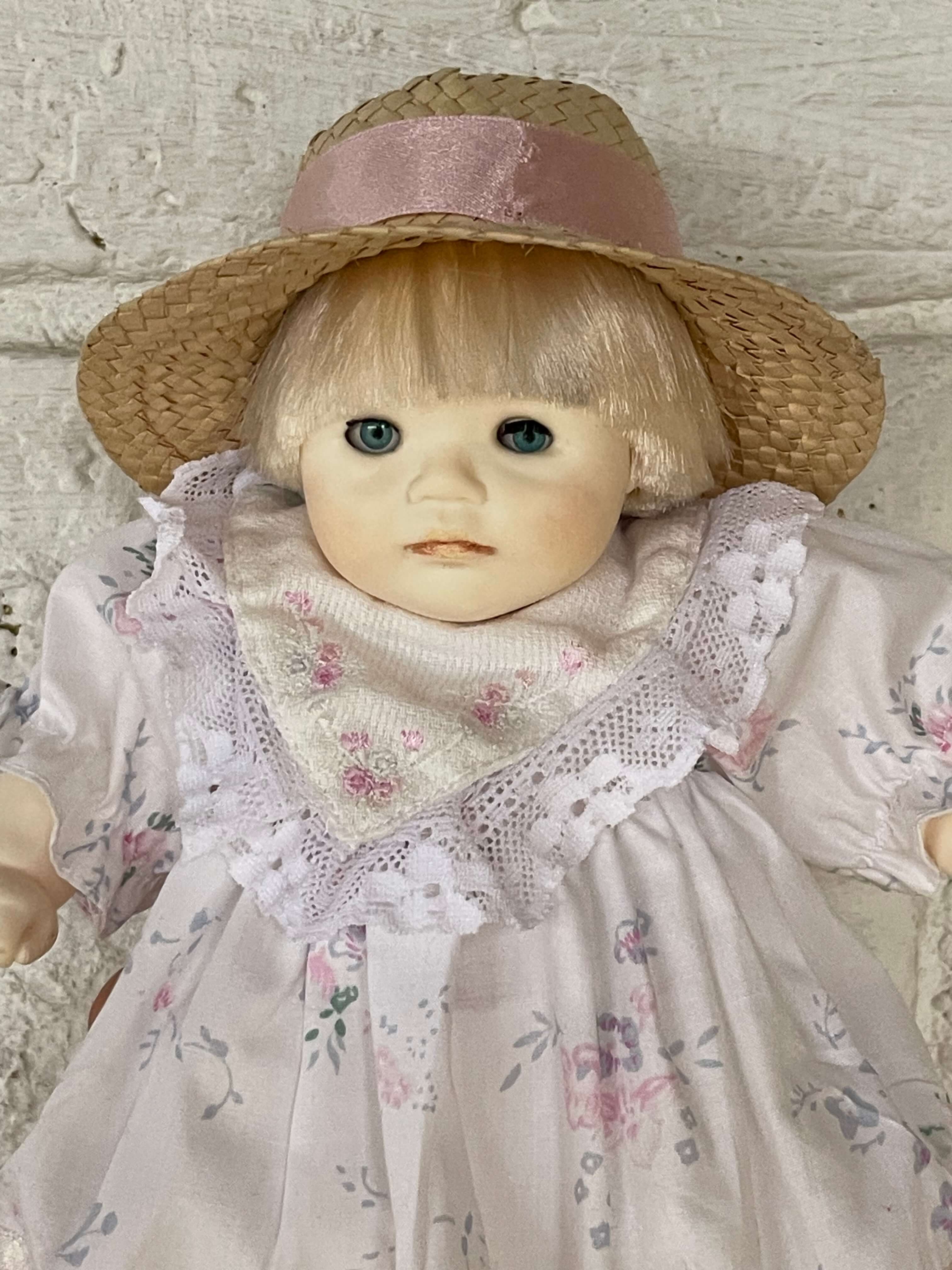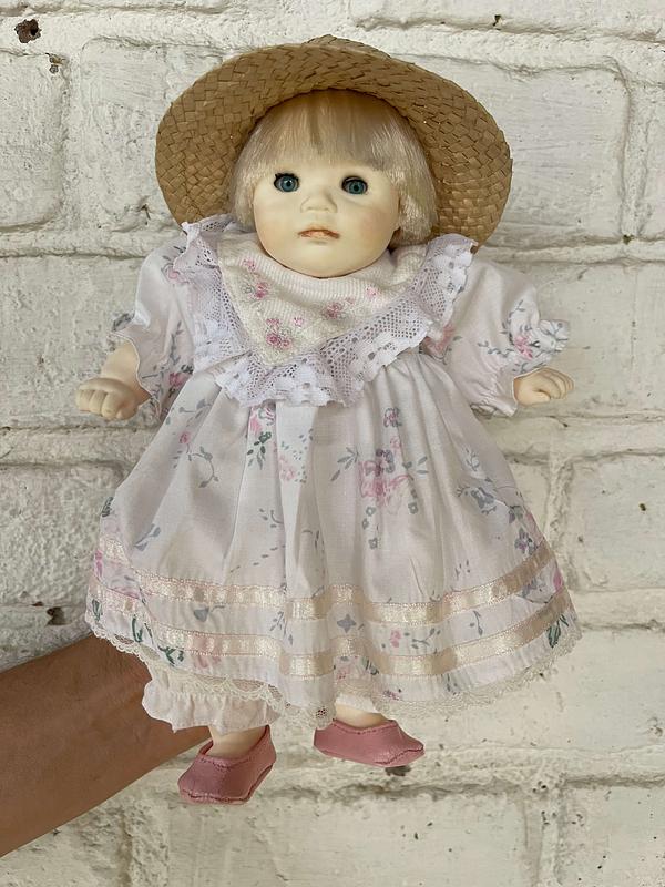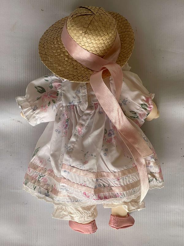 Muñeca con cuerpo de tela, la cabeza y extremidades son plásticas con apariencia de porcelana, al moverla cierra y abre los ojos. El vestido es de tela y el sombrero de paja. Se encuentra en buen estado.