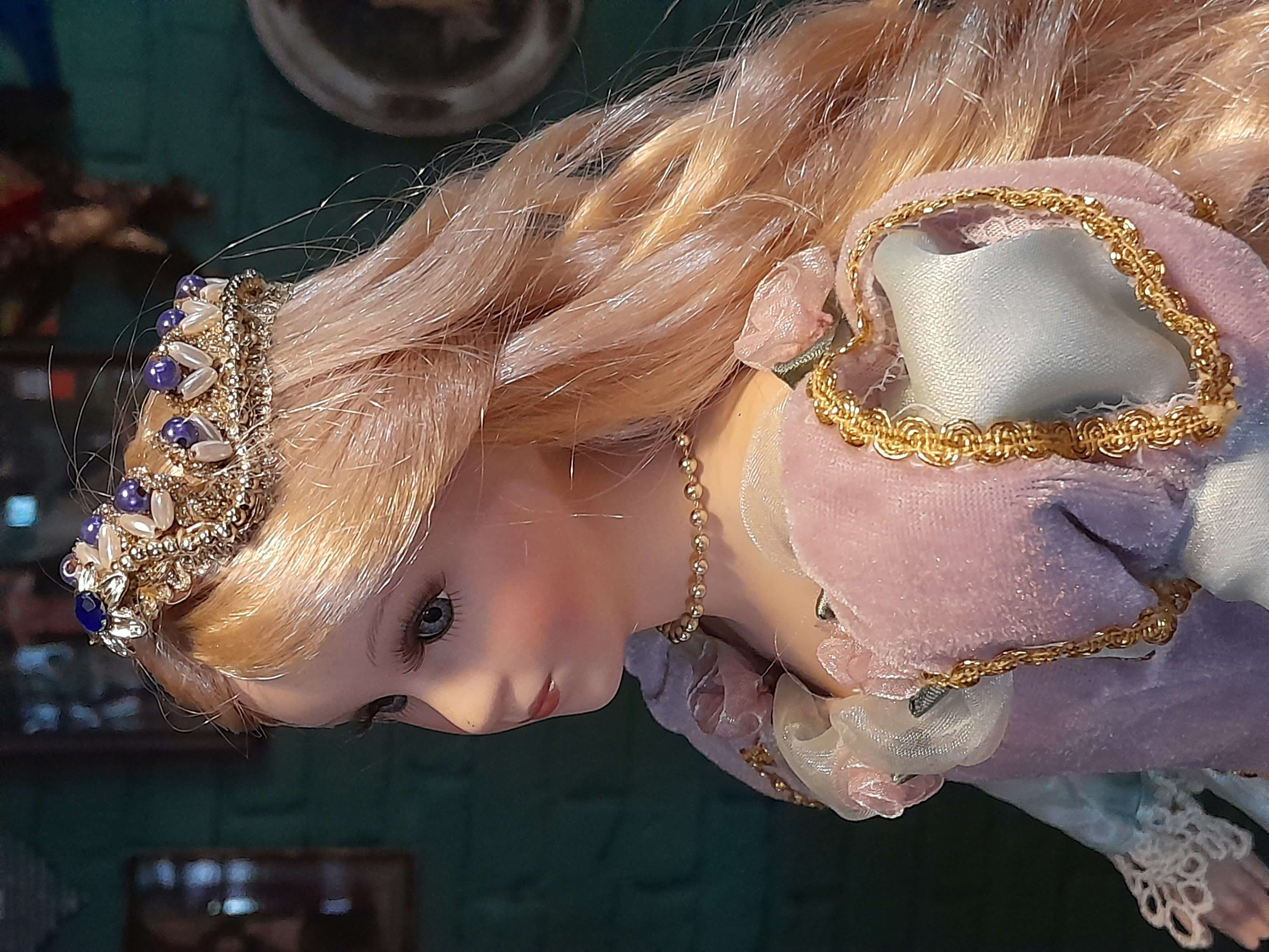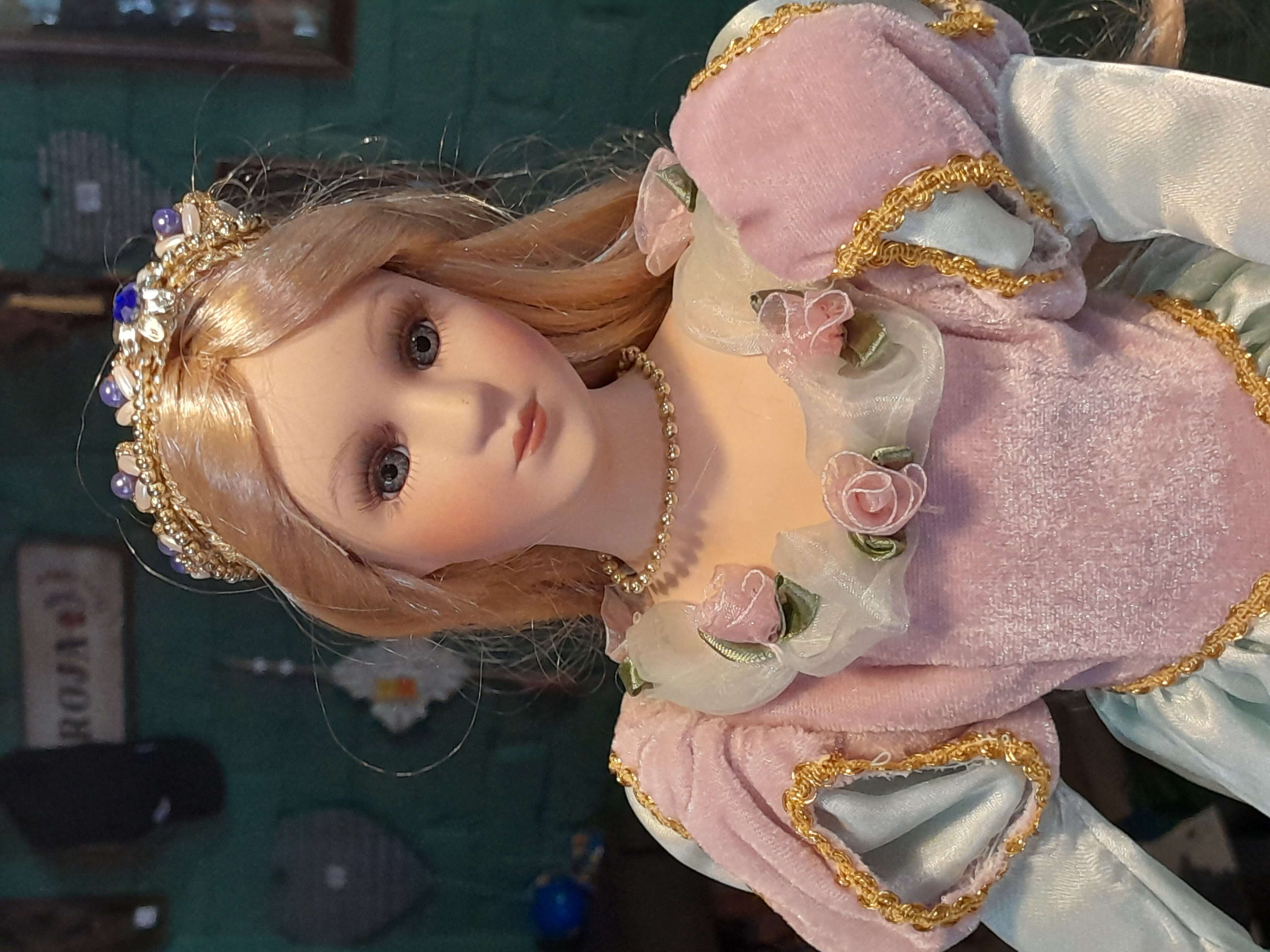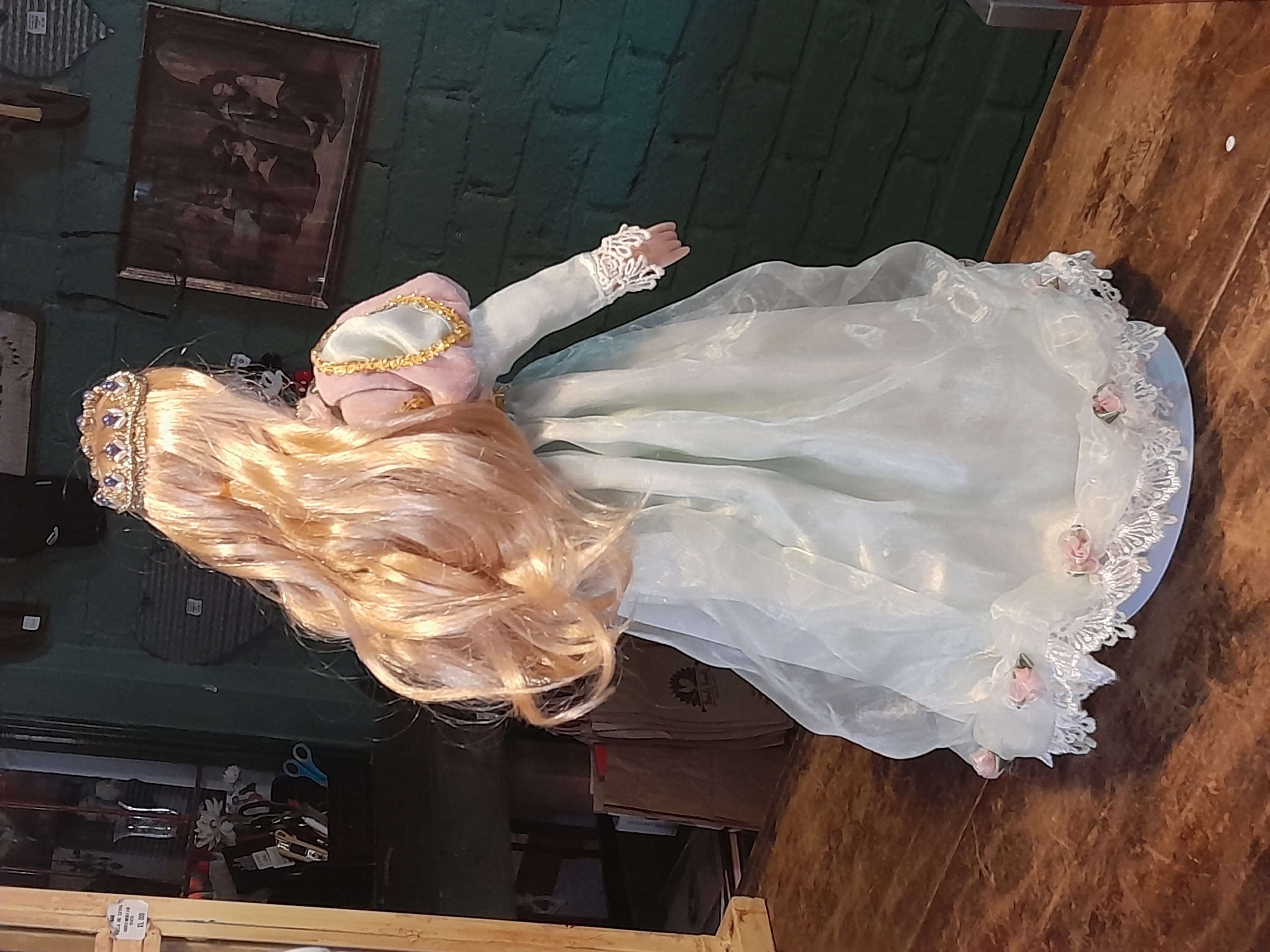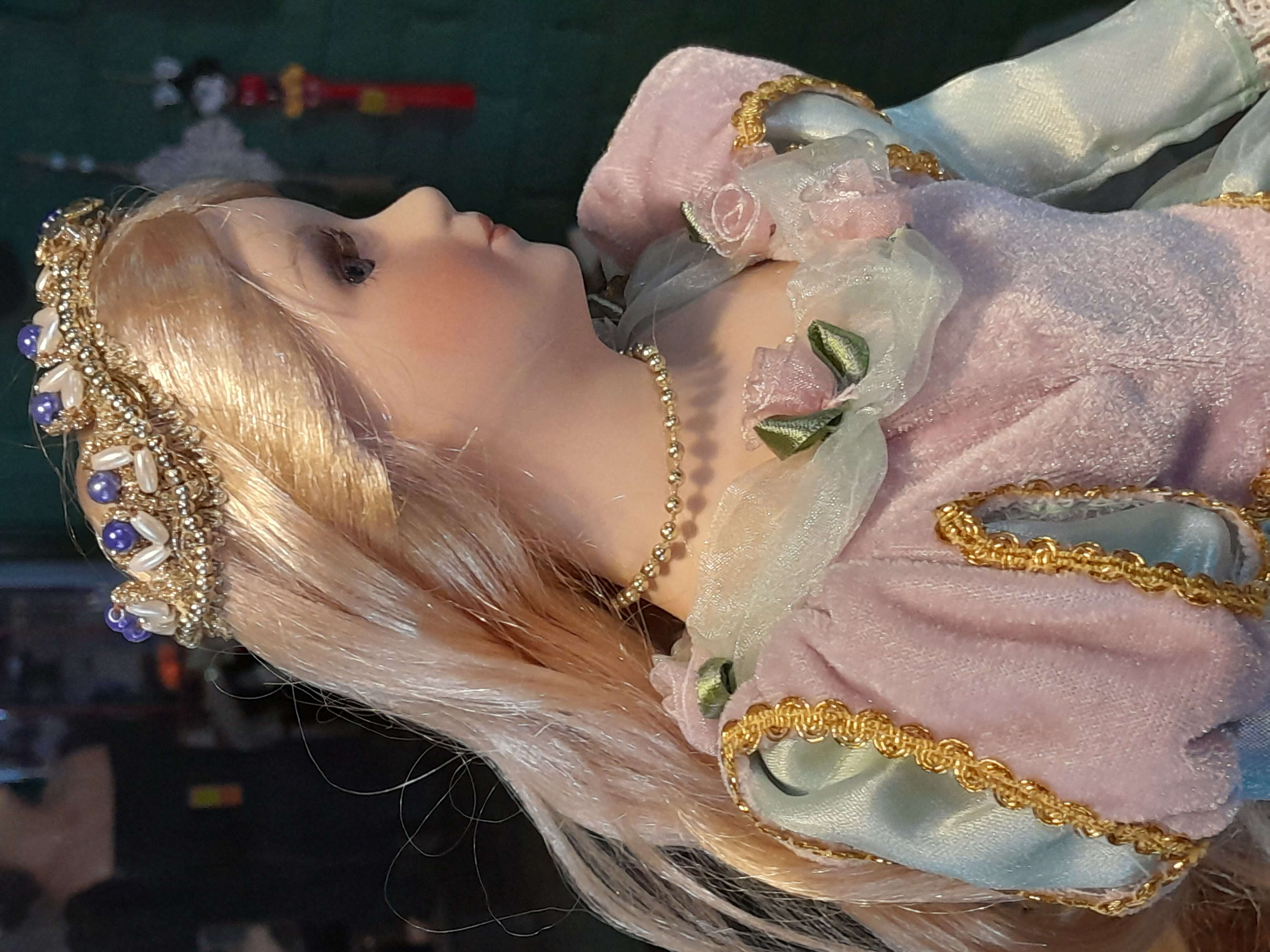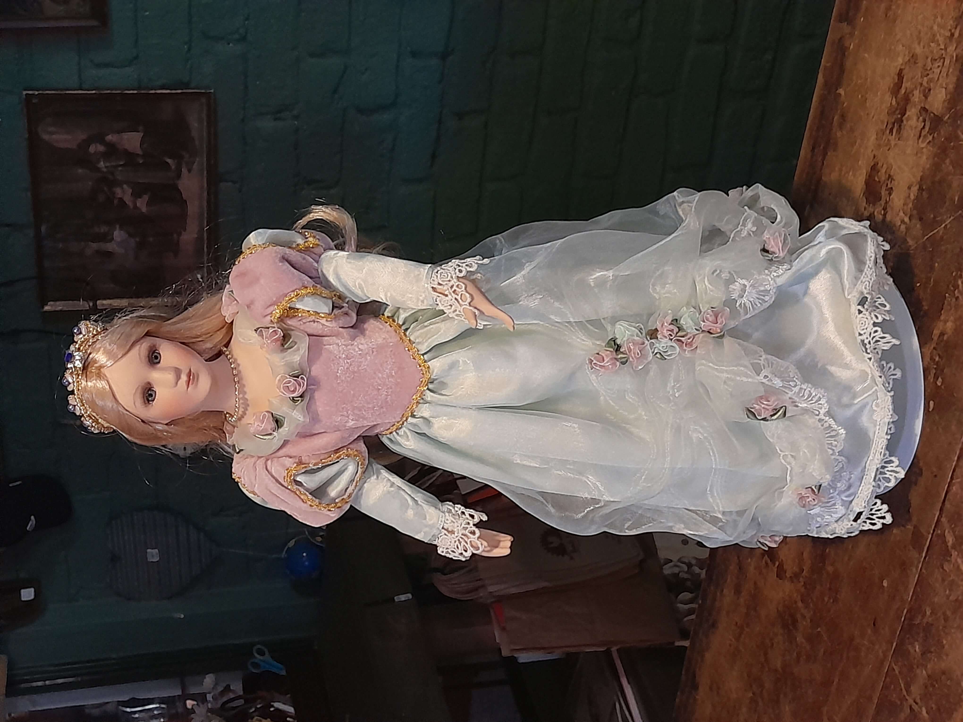 Muñeca con cuerpo de tela, cara, manos y pies de porcelana, el vestido se le quita, le falta una zapatilla al mejor estilo del cuento de la cenicienta.
