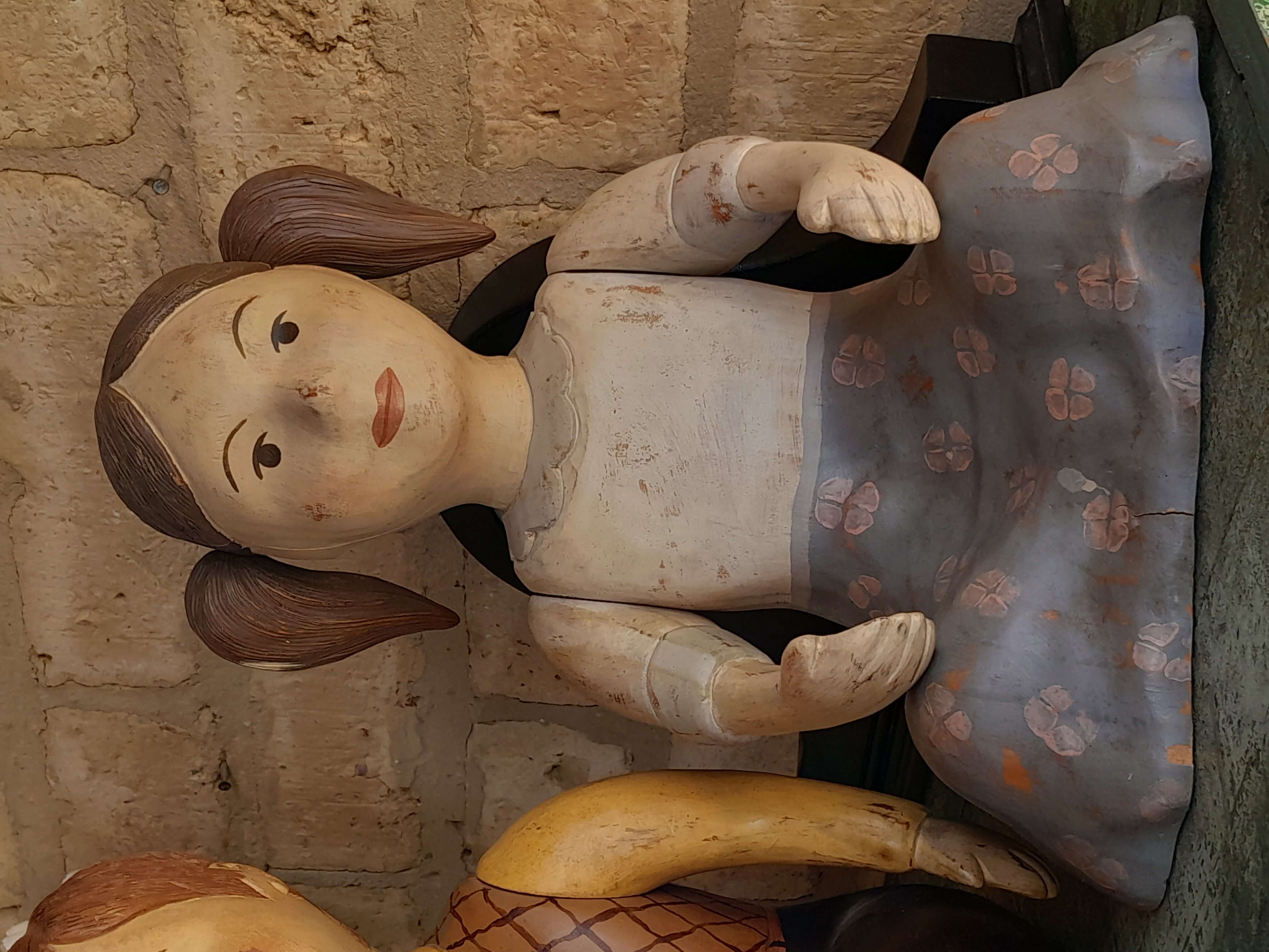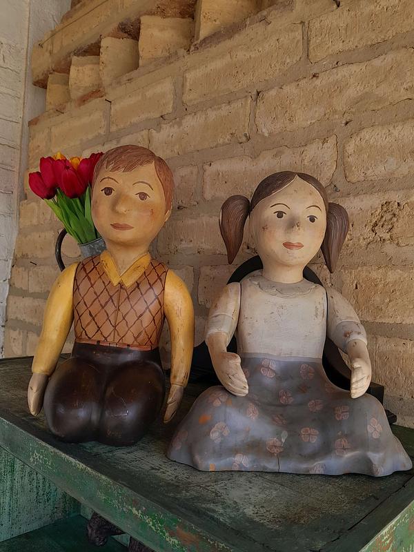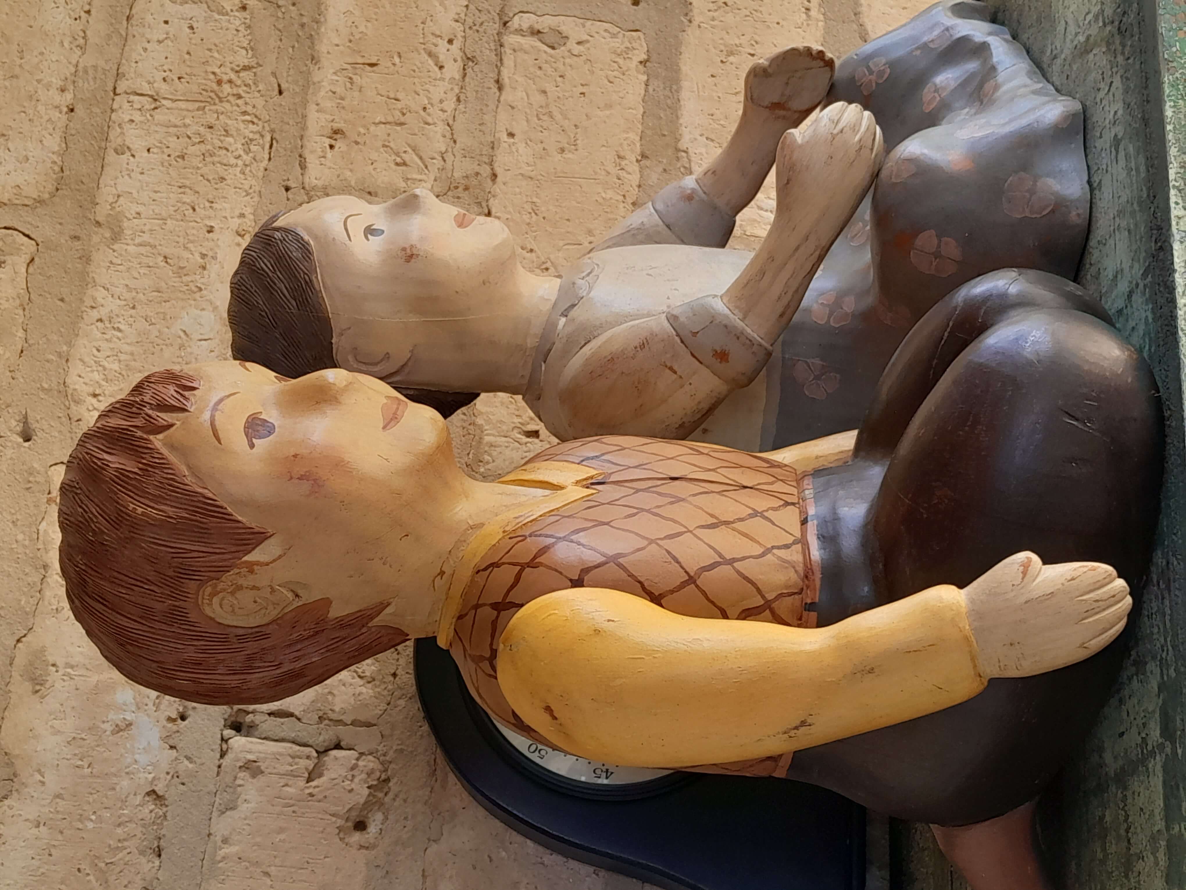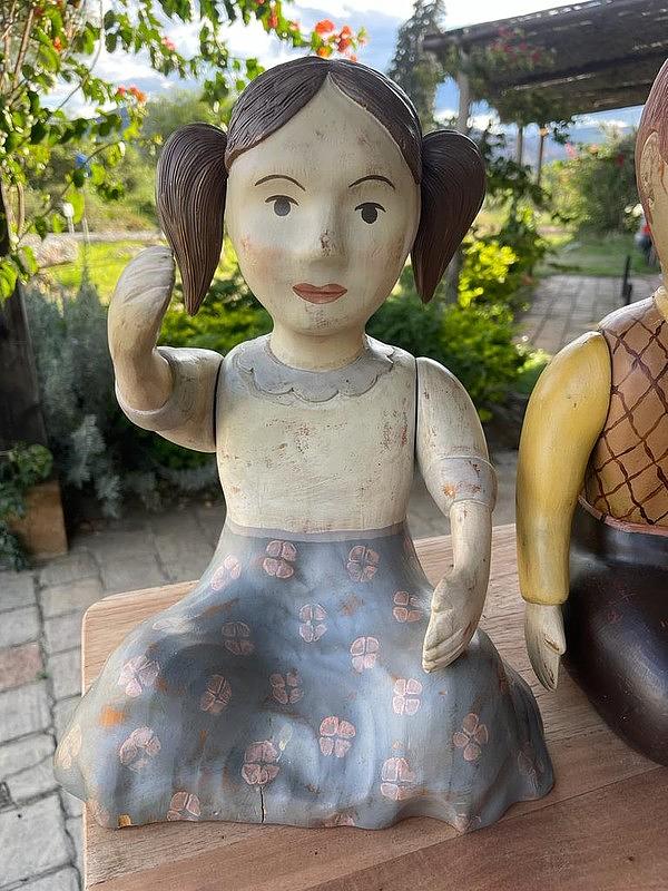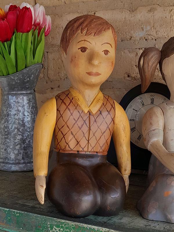 Pareja de figuras de niños talladas artesanalmente en madera de mediados del S XX. Los brazos se pueden girar para cambiarlos de posición. La pintura presenta desgastes y raspaduras. En la base tienen un tiquete de la tienda de decoración Estadounidense Sarried Lta. donde son catalogados como hechos en España.