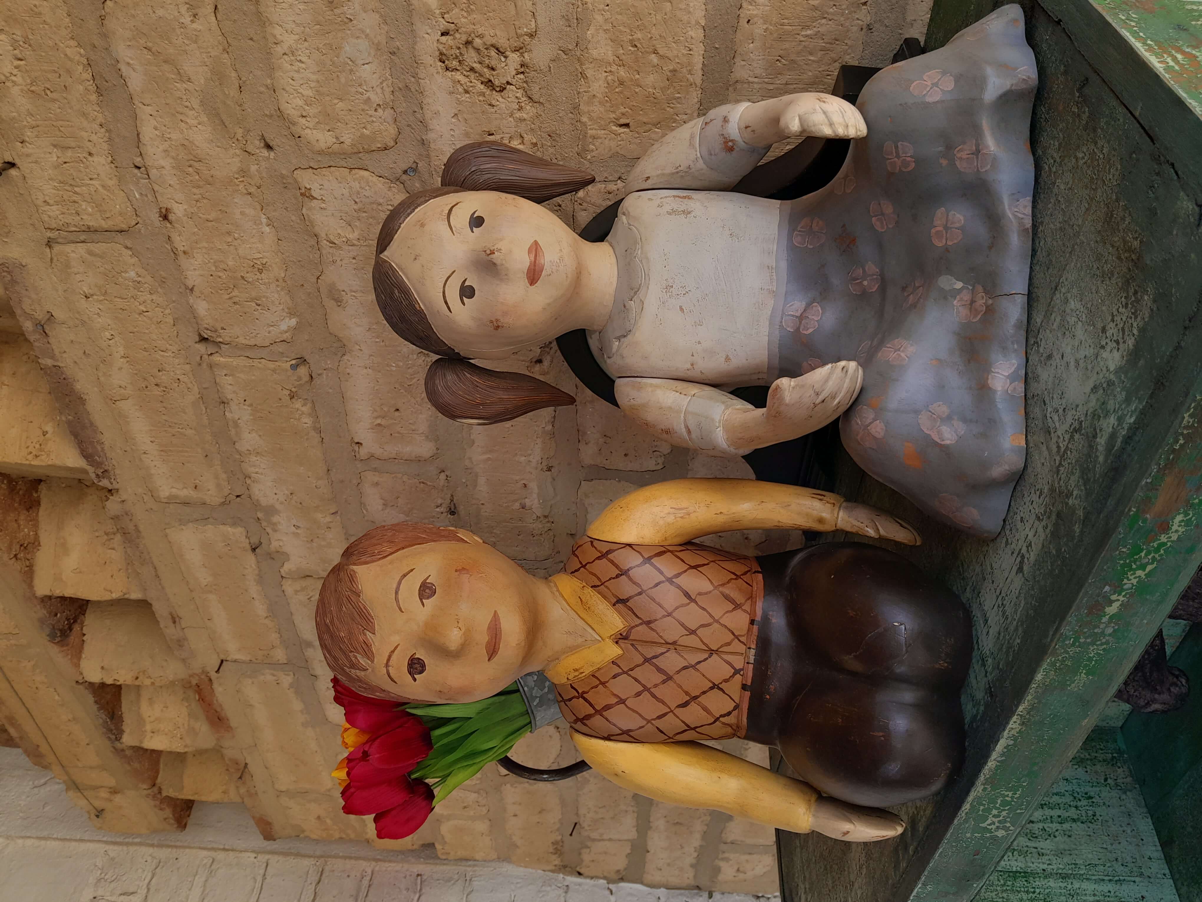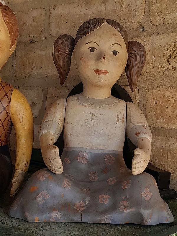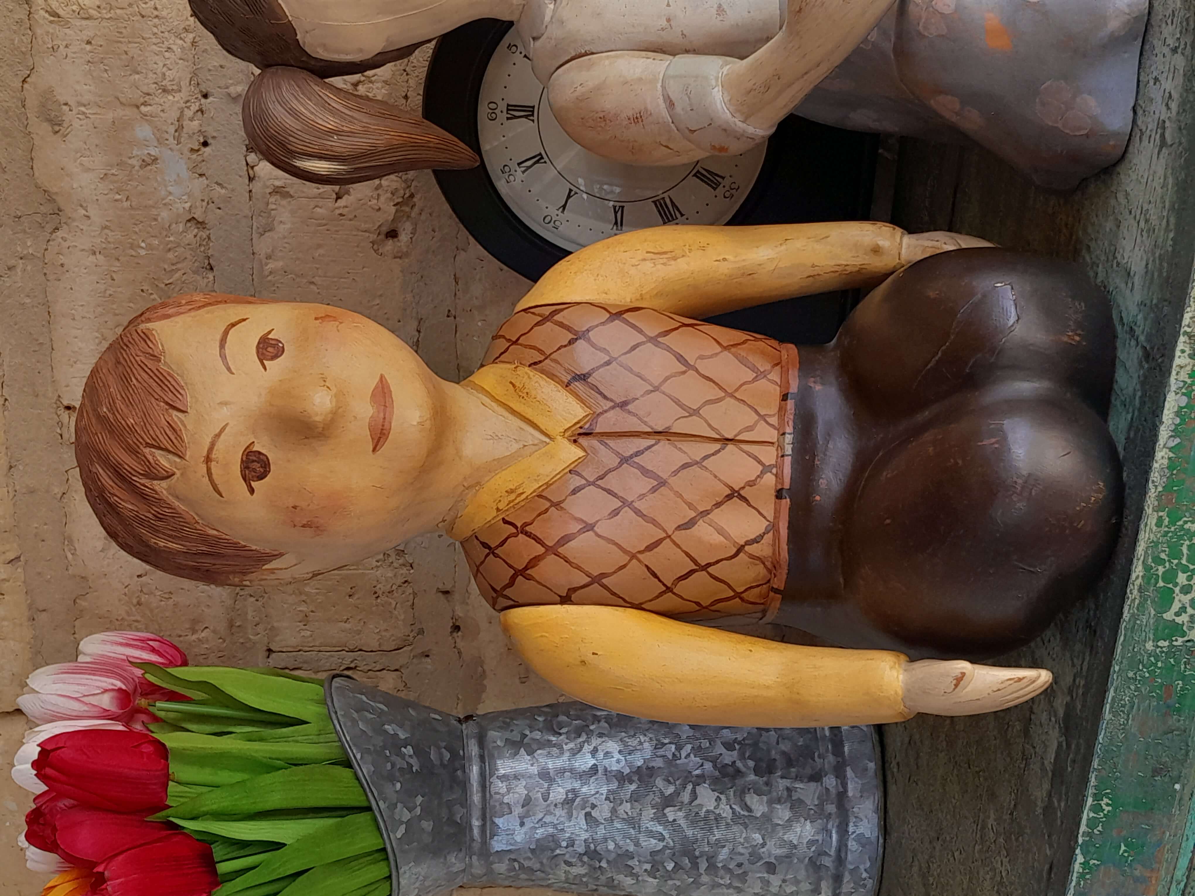 Pareja de figuras de niños talladas artesanalmente en madera de mediados del S XX. Los brazos se pueden girar para cambiarlos de posición. La pintura presenta desgastes y raspaduras. En la base tienen un tiquete de la tienda de decoración Estadounidense Sarried Lta. donde son catalogados como hechos en España.