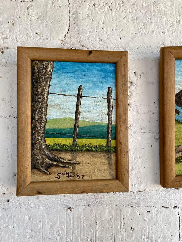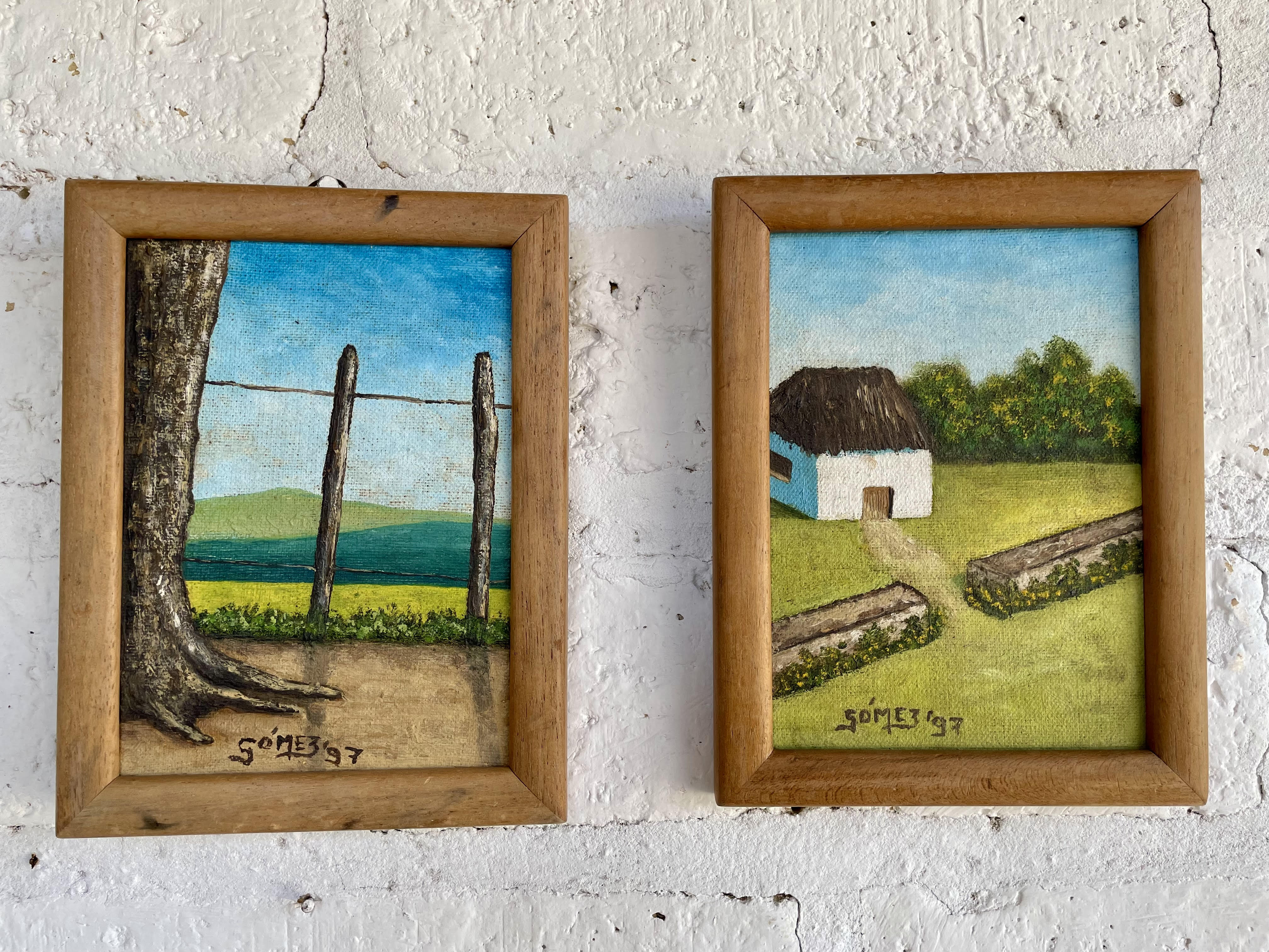 Estos dos pequeños óleos firmados por Gomez 97, son atractivos por la belleza ingenua que transmiten al haber sido pintados de manera elemental y poca formación académica. Enmarcados con moldura de madera.