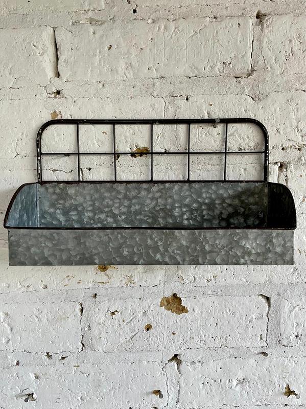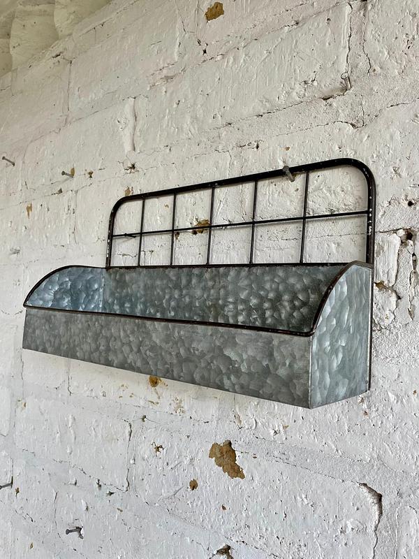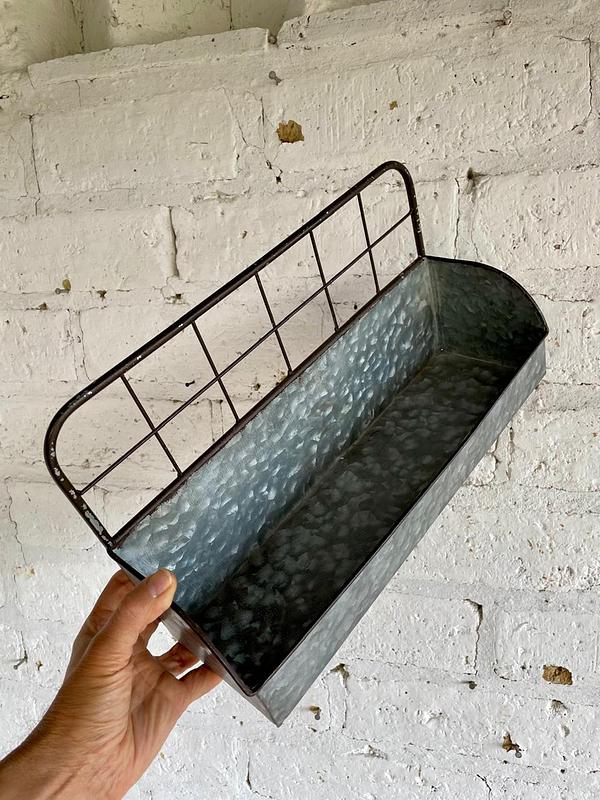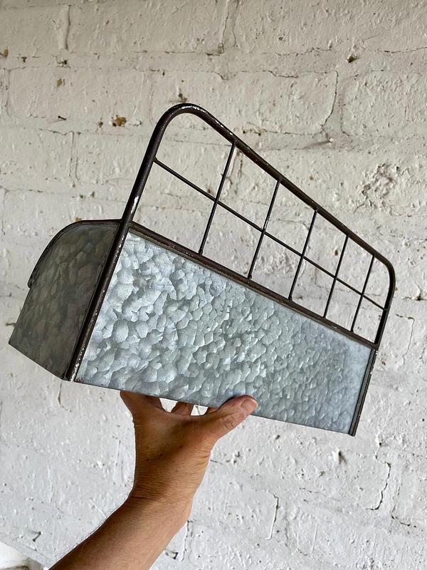 Bolsillo de pared elaborado en teja de zinc lisa con respaldar en varilla metálica delgada para colgar en la pared.